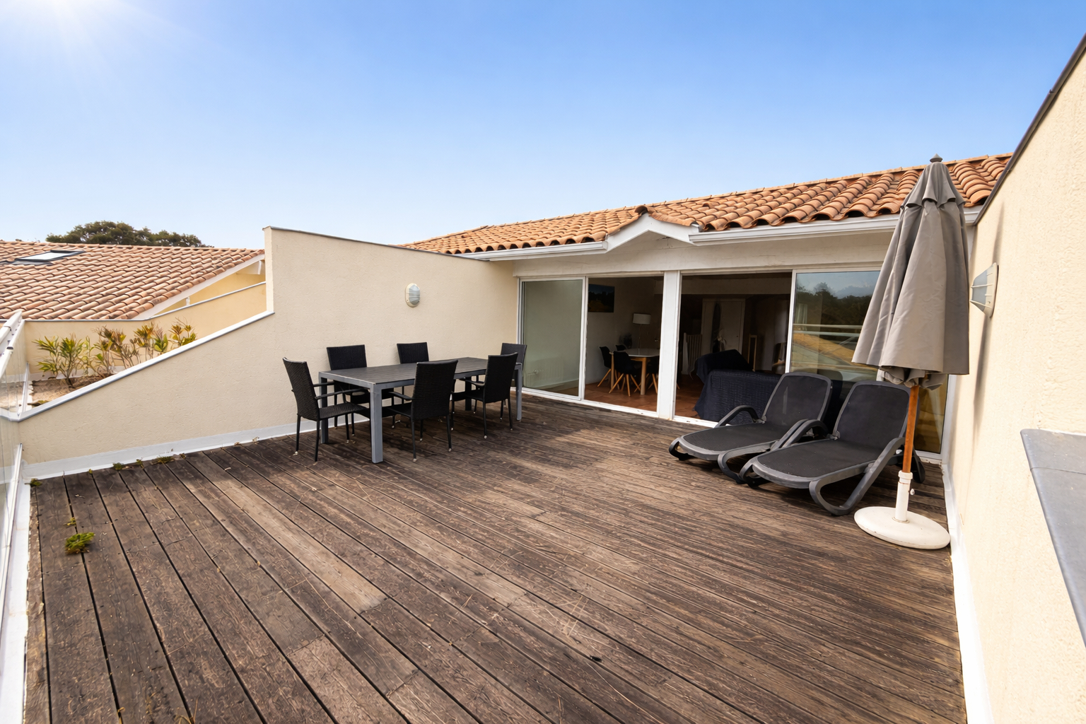 Duplex composé au premier niveau d'une entrée avec placard, d'une suite parentale avec dressing et salle d'eau rénovée et des WC séparés. A l'étage, une belle pièce de vie avec grande hauteur sous plafond, cuisine ouverte et accès à un toit-terrasse de 30 m2 + une cabine et une salle d'eau. Exposition plein sud. Cave et parking privatifs. Résidence avec ascenseur, piscine, local vélos, cave commune et local golf. Appartement actuellement sous bail commercial avec un revenu annuel d'environ 9000 euros. Copropriété de 124 lots - dont 44 lots habitation. Charges annuelles : 3068 euros.