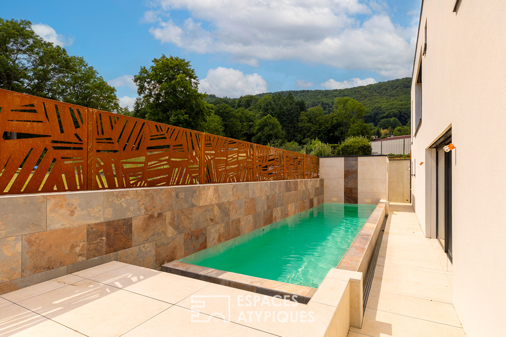 Située au calme d'une impasse et à proximité de Guebwiller, cette maison d'architecte neuve offre une surface de 168 m² habitables sur un terrain arboré de près de 9 ares. Construite en 2024, elle se distingue par son architecture contemporaine en duplex inversé, sa luminosité traversante et ses prestations soignées. Son agencement moderne s'accompagne d'un cadre de vie ouvert sur la nature, avec une piscine à débordement au format couloir de nage, une terrasse exposée plein sud et une vue imprenable sur l'étang et la forêt environnante. Un bien rare, pensé pour conjuguer confort, design et sérénité. L'entrée s'effectue par le niveau supérieur où une dalle de sol en verre donne le ton de la modernité des lieux. Cet étage accueille l'espace nuit avec une suite parentale disposant d'un dressing sur-mesure et d'une salle d'eau privative, ainsi qu'un bureau de 9 m² pouvant faire office de chambre d'appoint. Ces deux pièces s'ouvrent sur une grande terrasse plein sud, renforcée pour l'accueil d'un spa, offrant une vue panoramique sur la nature environnante. Un double garage complète ce niveau. L'escalier mène à l'étage inférieur, où s'étend un vaste espace de vie de plus de 50 m². La cuisine ouverte, entièrement équipée, communique avec un cellier attenant et se prolonge sur un séjour baigné de lumière grâce à de larges baies vitrées orientées sud et ouest. Une cheminée vient réchauffer l'ambiance. Une bibliothèque murale habille parfaitement les lieux. Ce niveau intègre également un espace télé de 25 m², deux chambres supplémentaires ainsi qu'une salle de bain avec douche et baignoire. L'ensemble est revêtu de carrelage, à l'exception des chambres, pour un confort optimal et une unité esthétique affirmée. A l'extérieur, le jardin, soigneusement aménagé et équipé d'un système d'arrosage automatique, constitue un véritable prolongement de l'habitat à la faveur de sa vaste terrasse partiellement couverte. La piscine à débordement s'intègre harmonieusement dans cet environnement naturel, offrant une parenthèse de détente face à l'étang jouxtant la propriété. La terrasse ensoleillée et les espaces verts invitent à la contemplation et à la convivialité. Située en fond d'impasse, cette maison bénéficie d'un environnement paisible, tout en restant proche des commodités, des écoles et des commerces de Guebwiller. Cette maison contemporaine, alliant lignes architecturales modernes et qualité des finitions, séduira les amateurs de biens atypiques à la recherche d'un cadre de vie élégant, fonctionnel et tourné vers la nature. Commerces à 5 min à pied, 1 min à vélo Ecoles maternelles et primaires à 5 à pied Collège à 10 min à pied Lycée à Guebwiller à 5 min en voiture Bus à 5 min à pied Autoroute à 20 min en voiture CLASSE ENERGIE : A / CLASSE CLIMAT : A Montant moyen estimé des dépenses annuelles d'énergie pour un usage standard, établi à partir des prix moyens des énergies indexés sur les années 2021, 2022, 2023 (abonnements compris) : entre 600 et 860 euros Contact : Marc 07.44.88.95.17 Marc CALOGERO (EI) Agent Commercial - Numéro RSAC : 982590853 - Colmar.