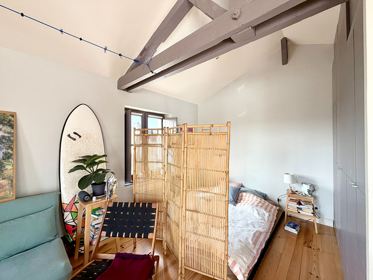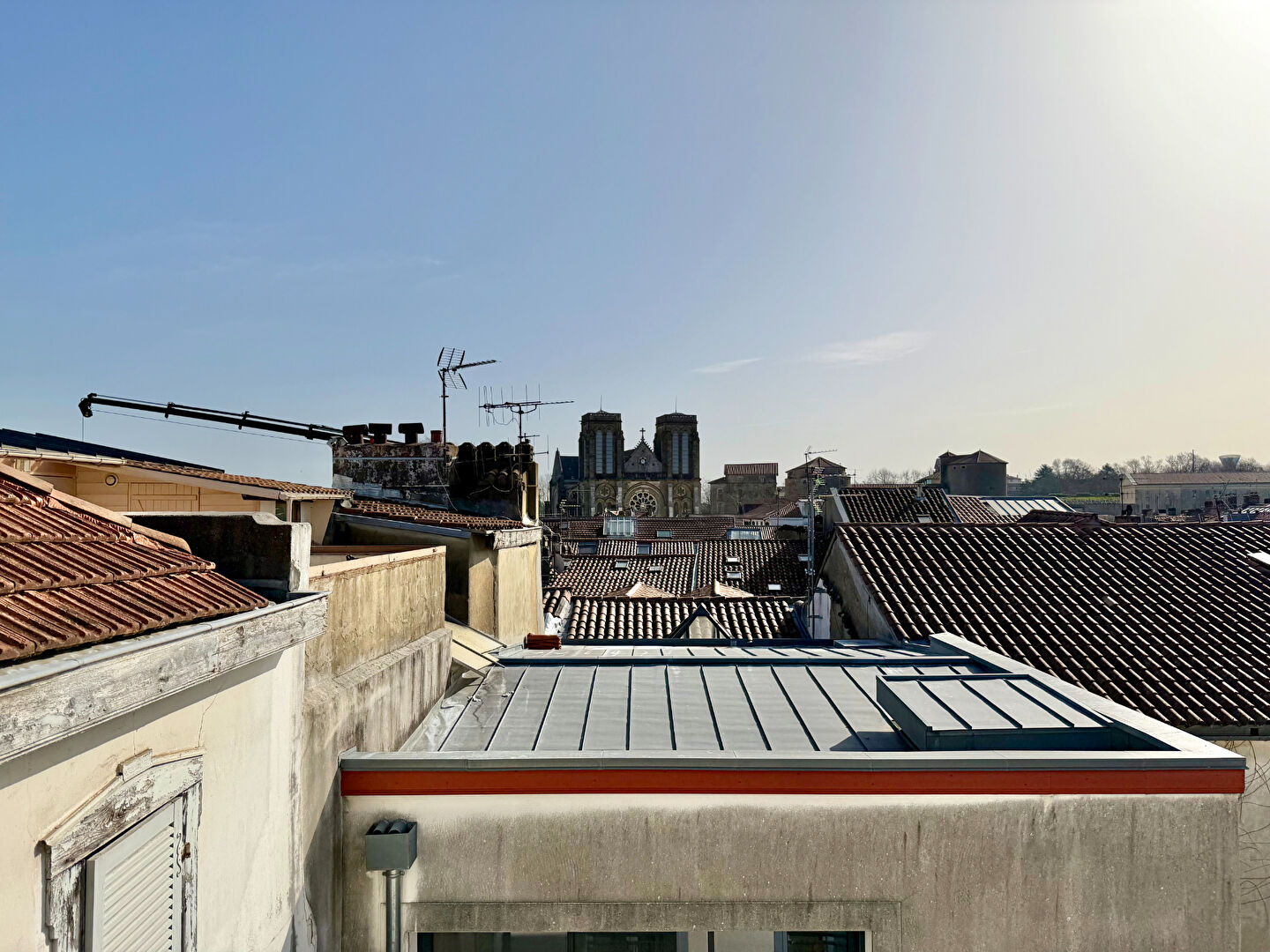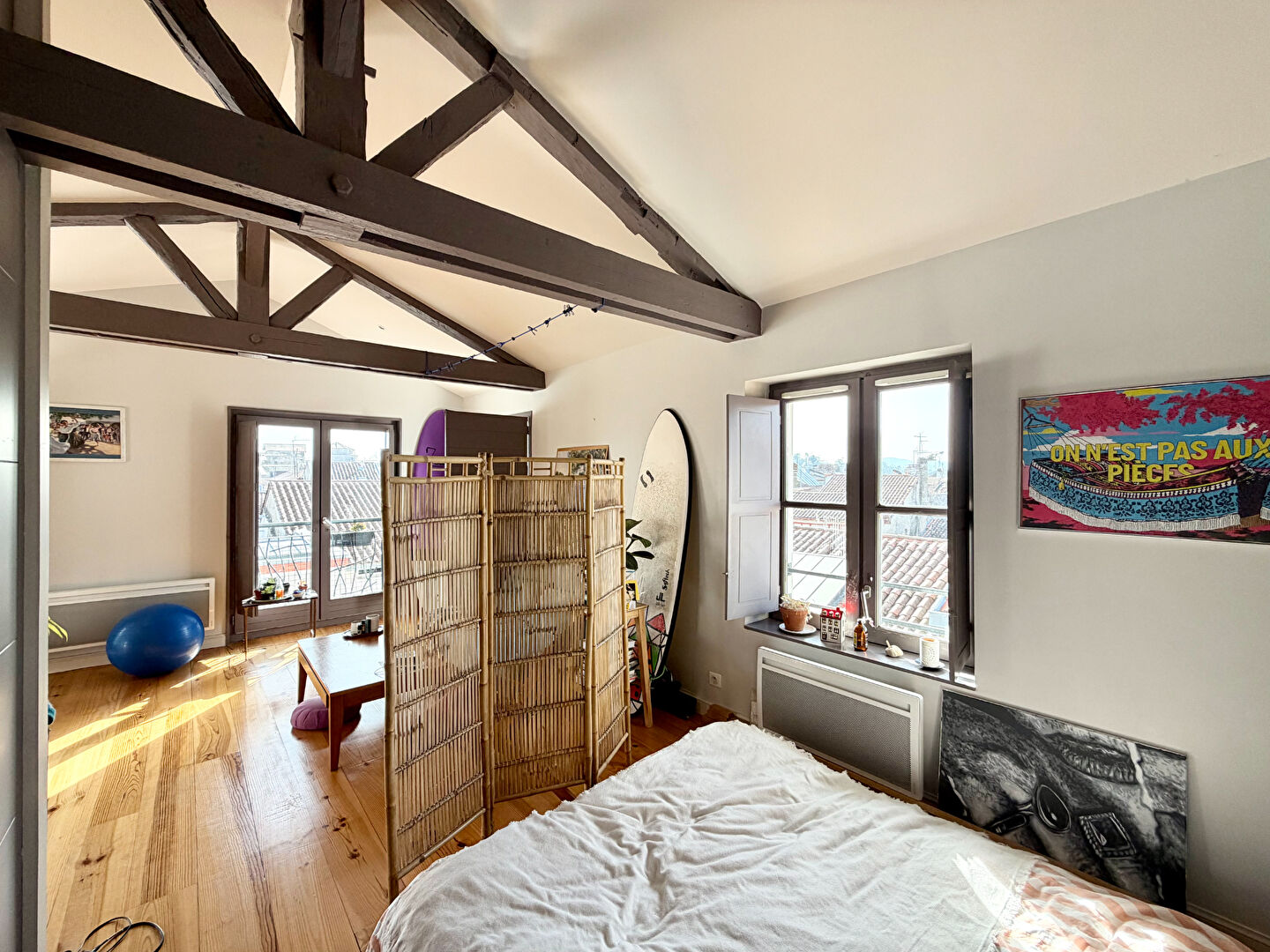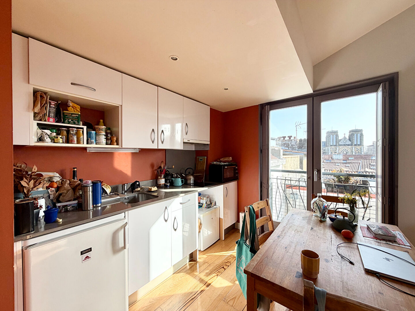 Dans l'hypercentre de Bayonne, rue Marengo, cet appartement de type studio vous ravira par sa luminosité et ses vues imprenables sur la cathédrale d'un côté, et les Pyrénées de l'autre. C'est niché au 5ème et dernier étage d'un immeuble traditionnel bayonnais entièrement rénové, que vous pourrez savourer des aspects de ce logement. L'entrée vous emmène directement dans la pièce de vie avec cuisine ouverte sur séjour, exposée sud-ouest, dont la cuisine vous offre une vue imprenable sur la cathédrale. Vous disposerez également d'un coin nuit avec de vastes rangements, dont il est possible de fermer cette pièce pour plus d'intimité. La salle d'eau avec douche à l'italienne et fenêtre comprend également les WC et emplacement machine à laver. Vous apprécierez notamment ses vastes volumes, sa vue panoramique, sa luminosité grâce a ses grandes fenêtres et son exposition Sud-Ouest, ainsi que so plafond cathédrale permettant d'admirer la charpente de cette très belle bâtisse traditionnelle. Copropriété de 12 lots - dont 10 lots habitation. Charges annuelles : 600 euros.