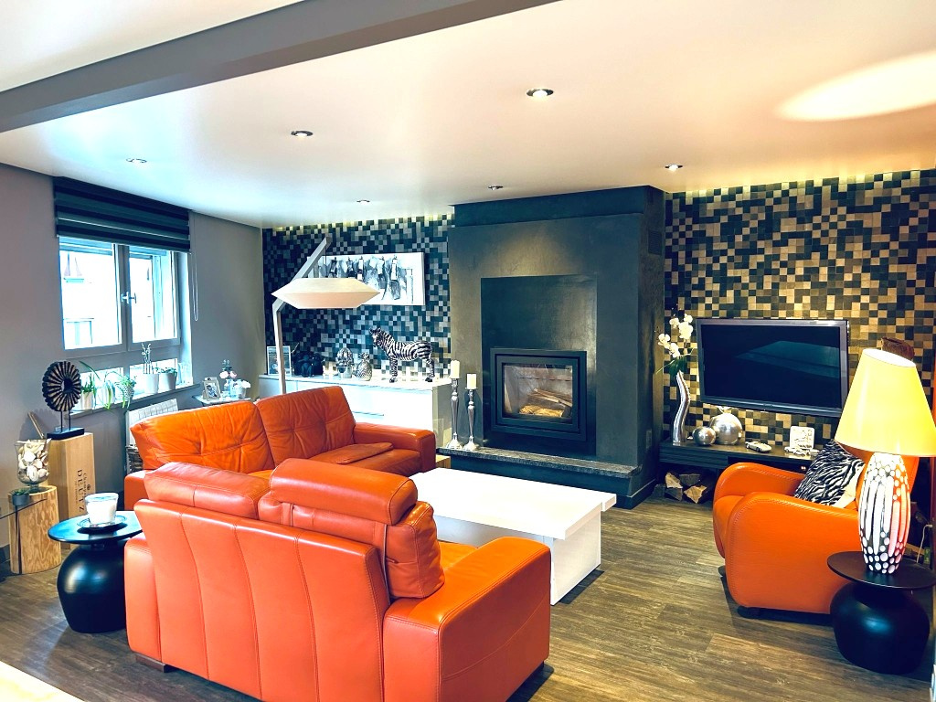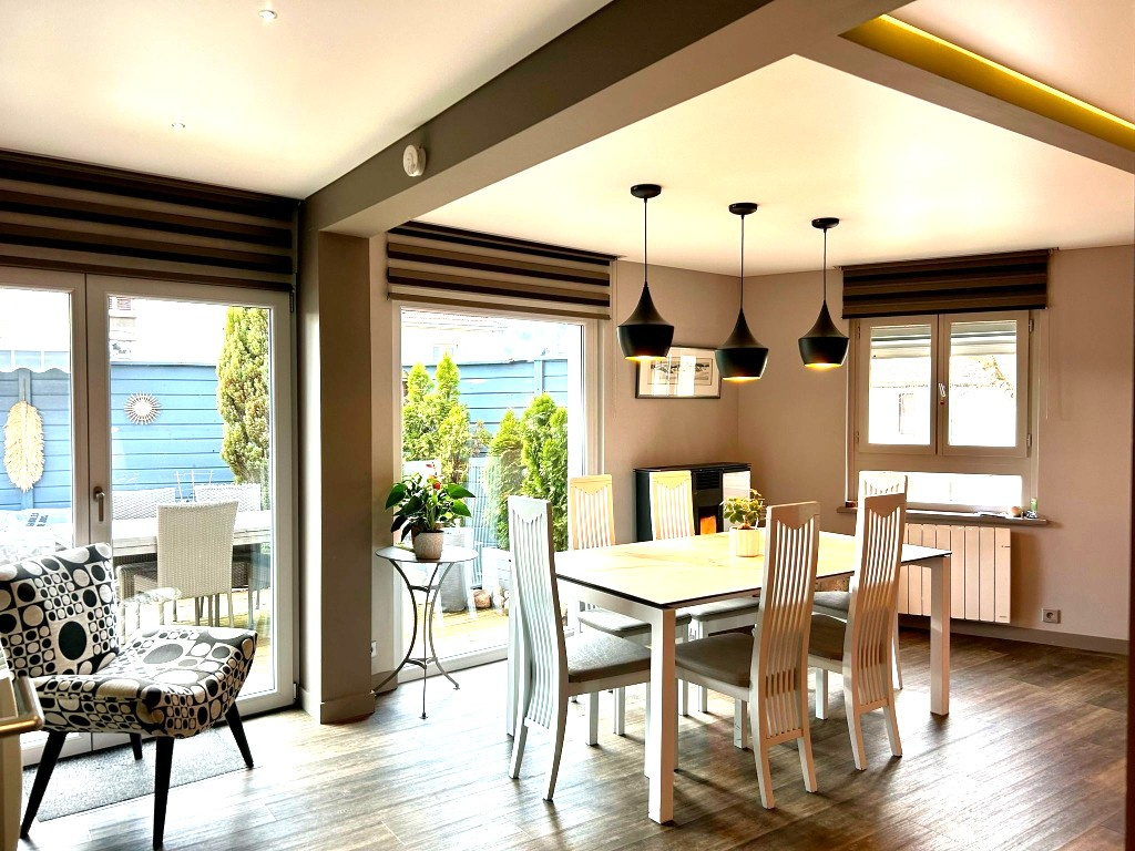 Grande et belle pièce ouverte sur salle à manger (plafond tendu avec éclairage intégré) baie vitrée donnant sur une terrasse très agréable d'une surface de 35m2 et salon équipé d'un insert bois / poêle à pellets, une belle cuisine aménagée / équipée, une pièce office de bureau / chambre, salle d'eau avec douche / vasque sur meuble / sèche linge mural / rangements, wc suspendu séparé.
