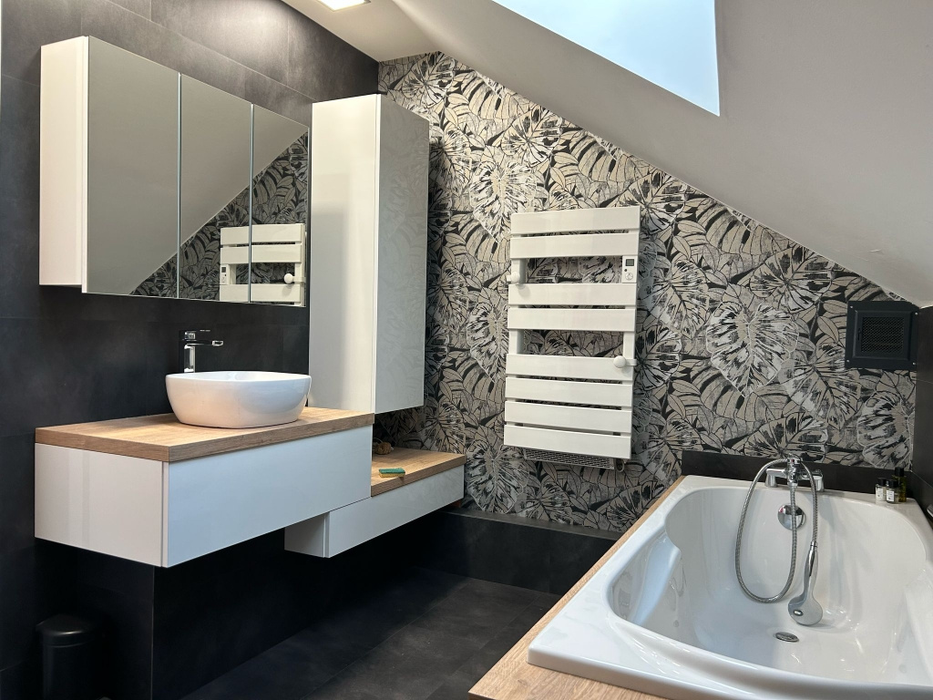 Mezzanine, grande chambre parentale avec grands placards / meuble télé / coin bureau, une salle de bains avec baignoire / vasque sur meuble / wc suspendu / sèche linge mural, deux chambres avec placards.