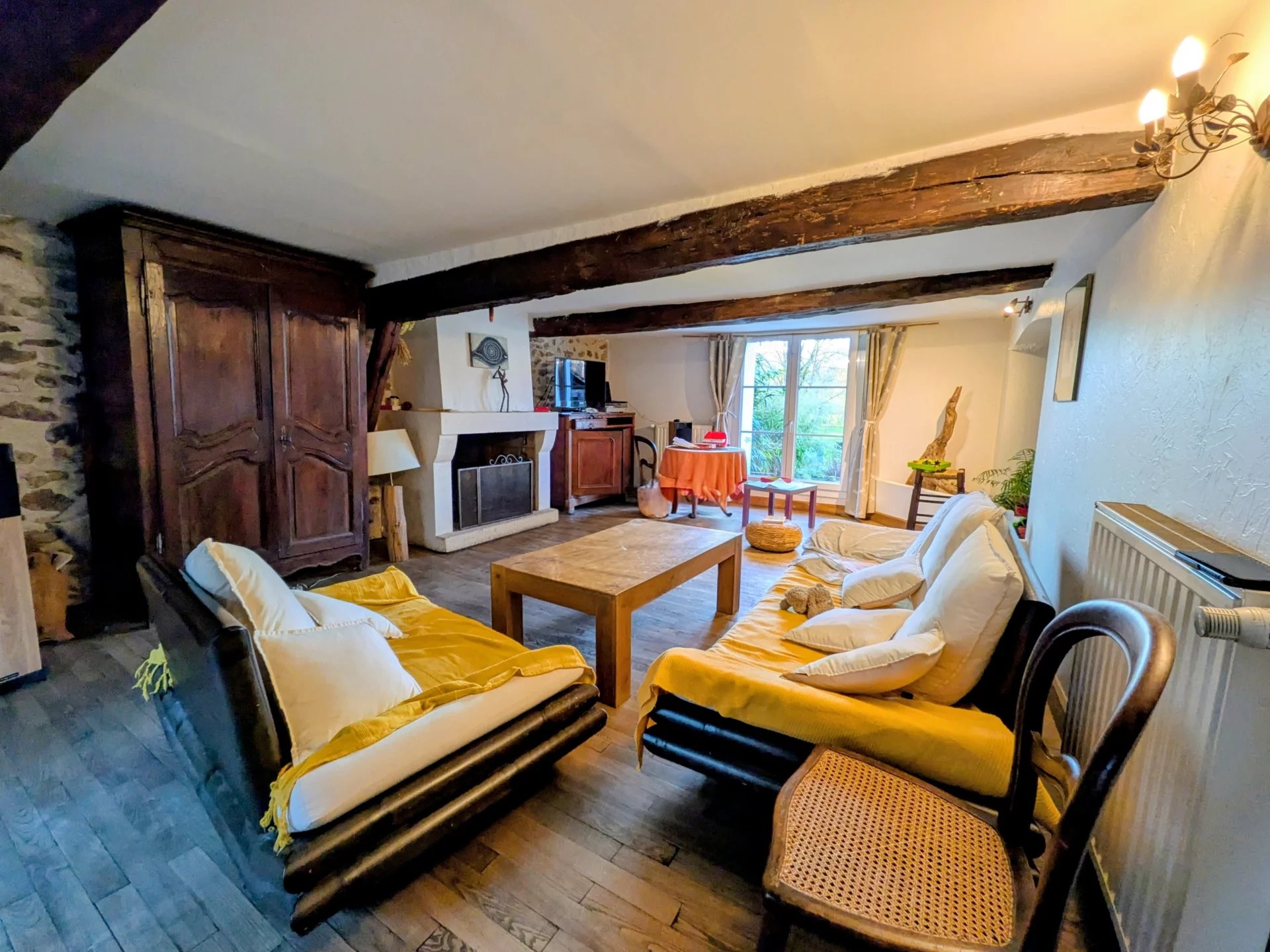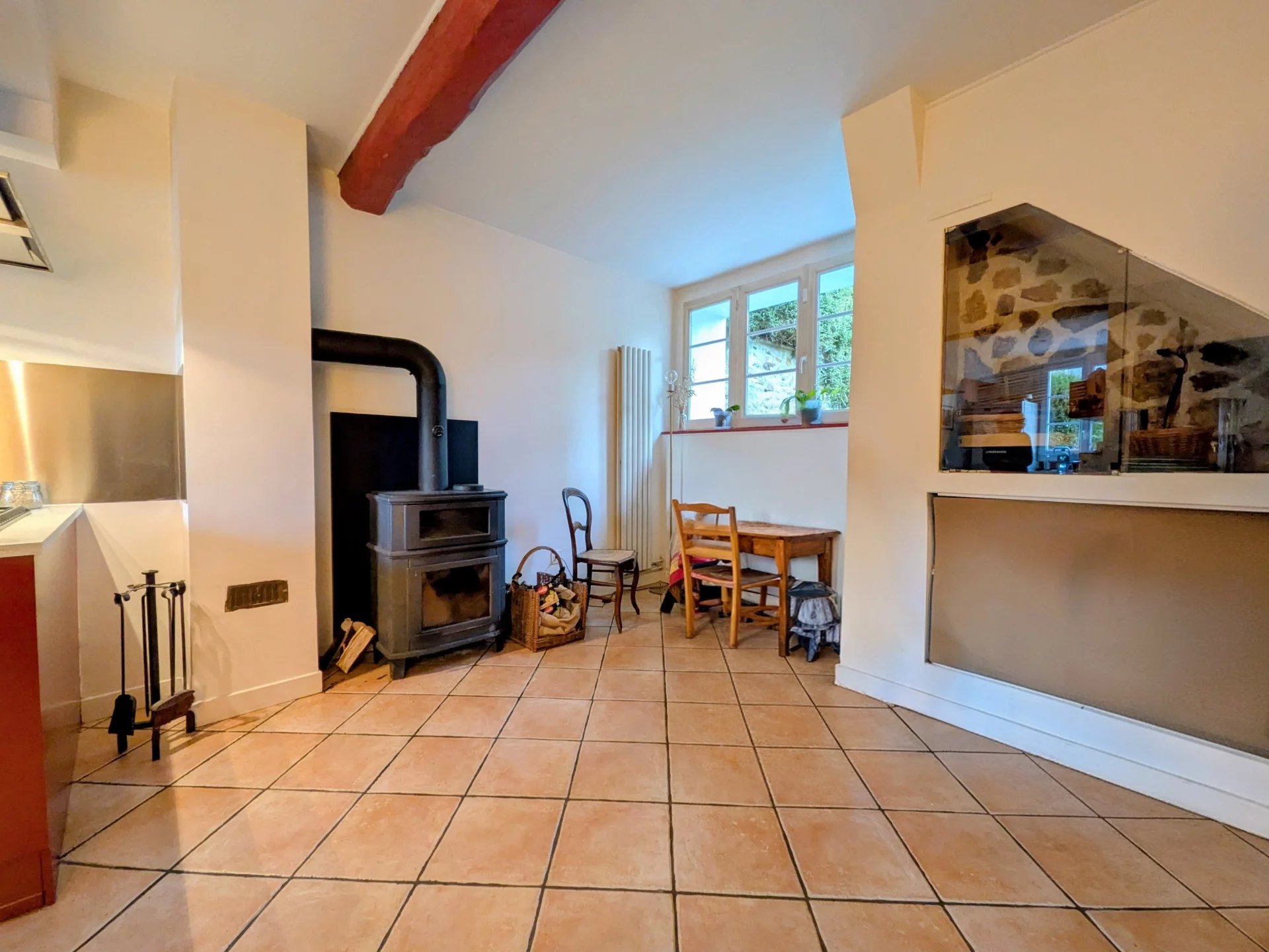 Vous découvrirez une entrée, une cuisine ouverte sur une salle à manger, un joli séjour plein de caractère avec sa cheminée à foyer ouvert, un coin buanderie / chaufferie avec wc.