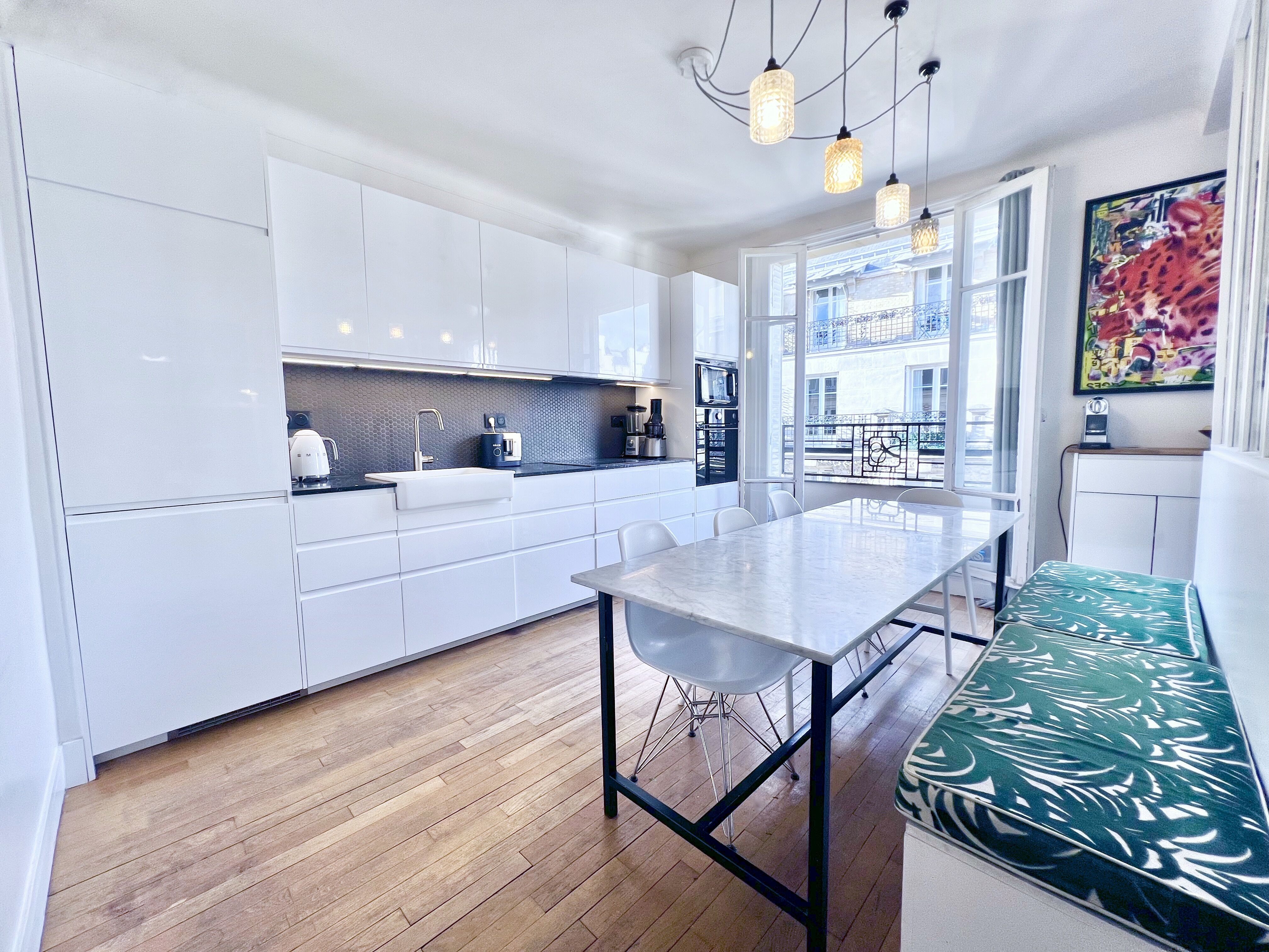 Ayant fait l'objet d'une rénovation récente très réussie, ce bien multiplie les atouts grâce à la luminosité offerte par ses nombreuses fenêtres, la verrière de type loft / atelier qui confère beaucoup de cachet à son espace de séjour, sa situation traversante en étage élevé, sa quadruple orientation, ses vues dégagées, son beau parquet en chêne massif, sa hauteur sous plafond de 2,70 m, ses nombreux rangements sur mesure et ses chambres au calme absolu sur cour.