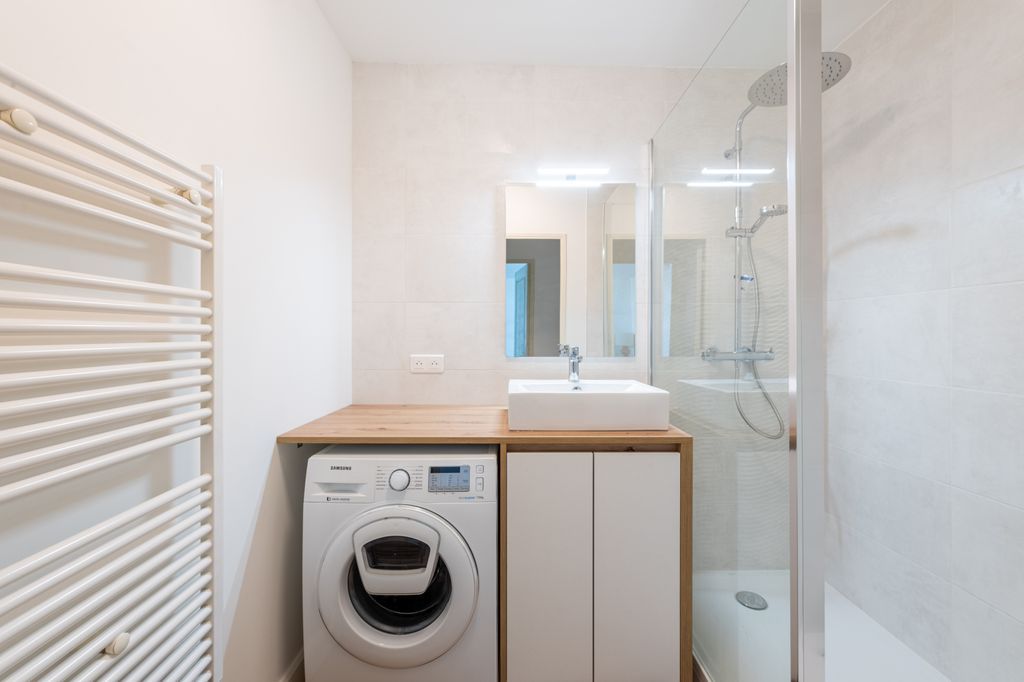 Une chambre avec un lit double de 140 cm ainsi que des placards de rangement. Une salle d'eau avec douche, meuble-vasque et lave-linge. Un WC séparé. Ce bien est loué avec un box sécurisé.
