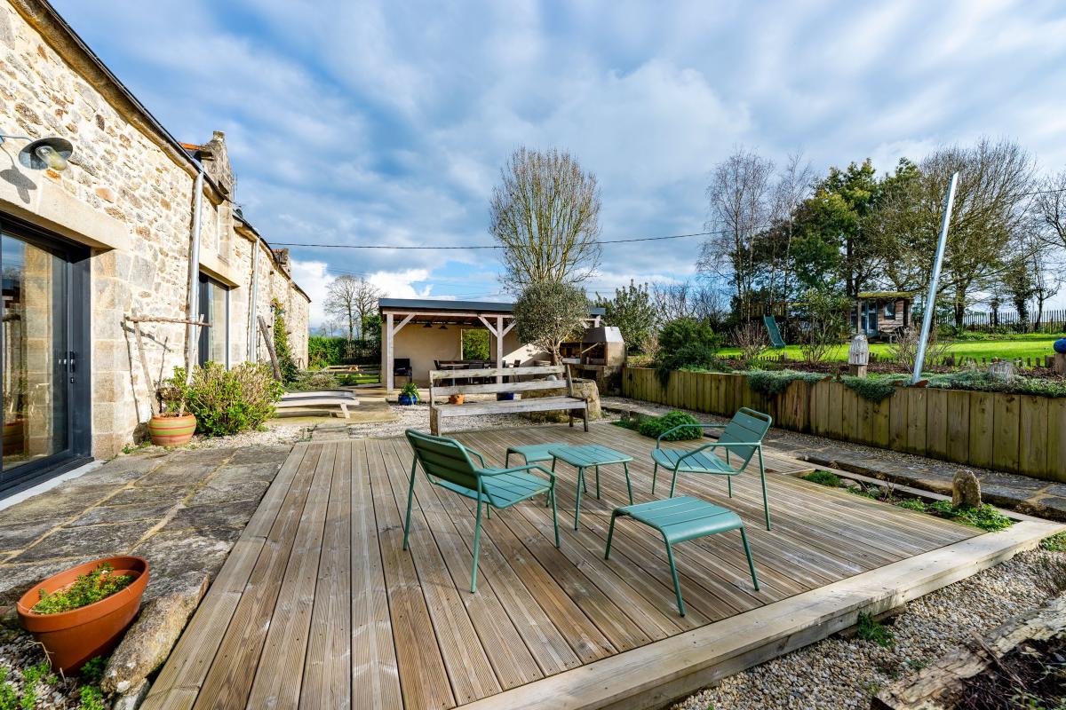 terrasse bois, cuisine d'été sous carport, terrain de pétanque, cabane pour enfants et espaces arborés.