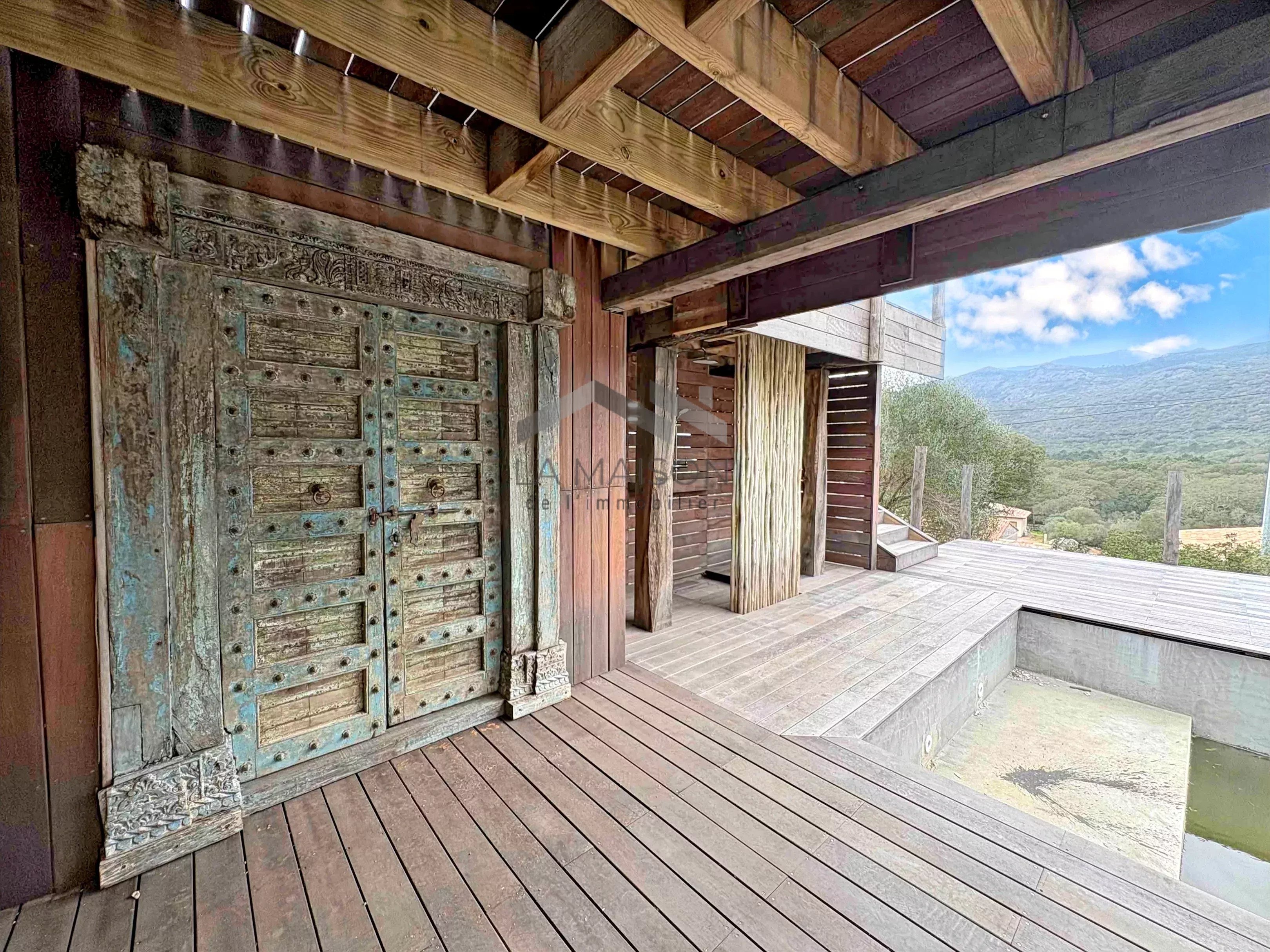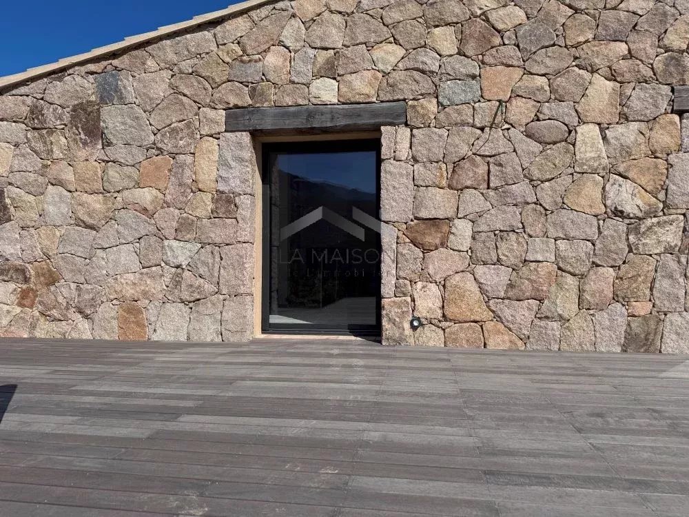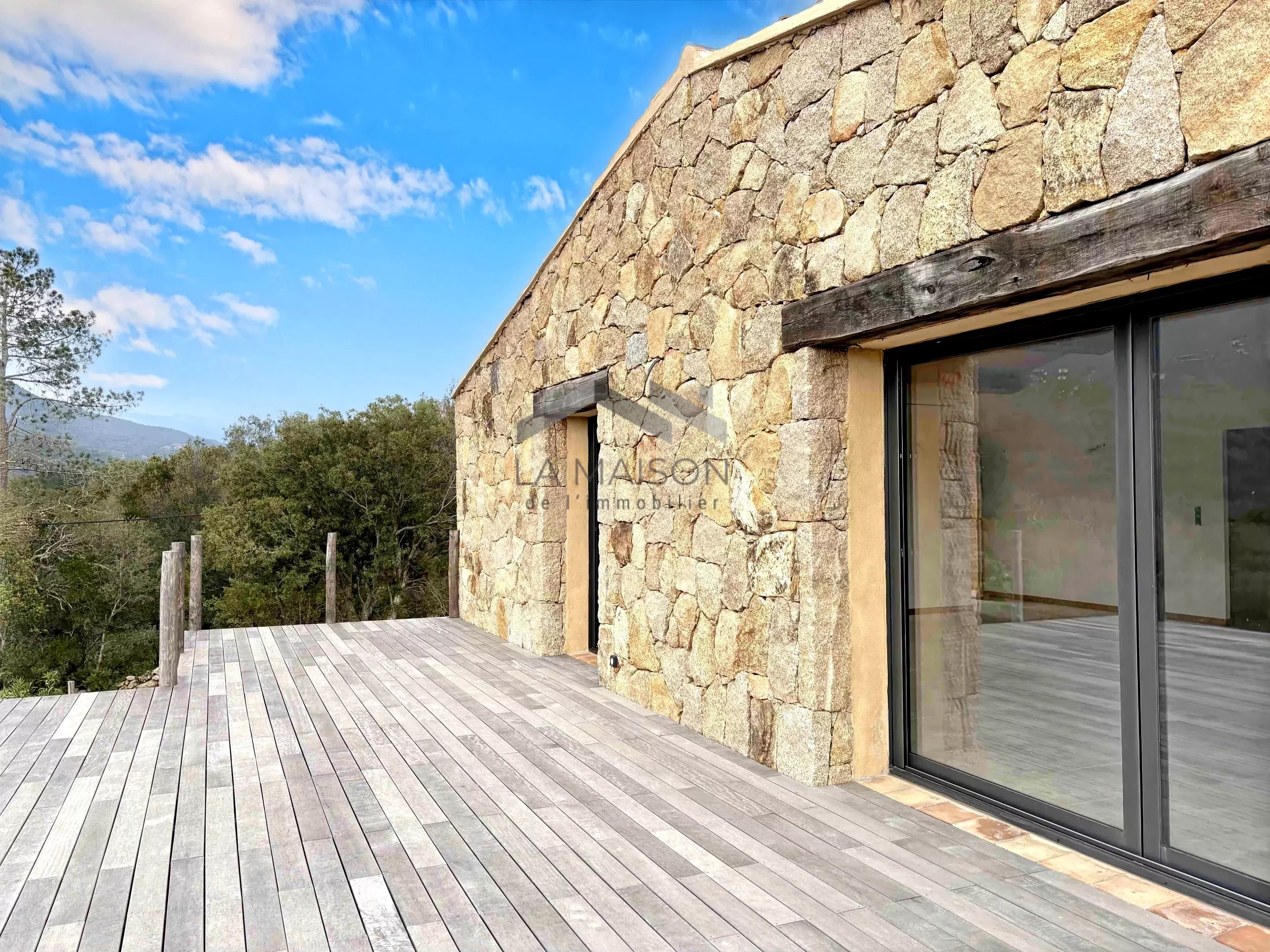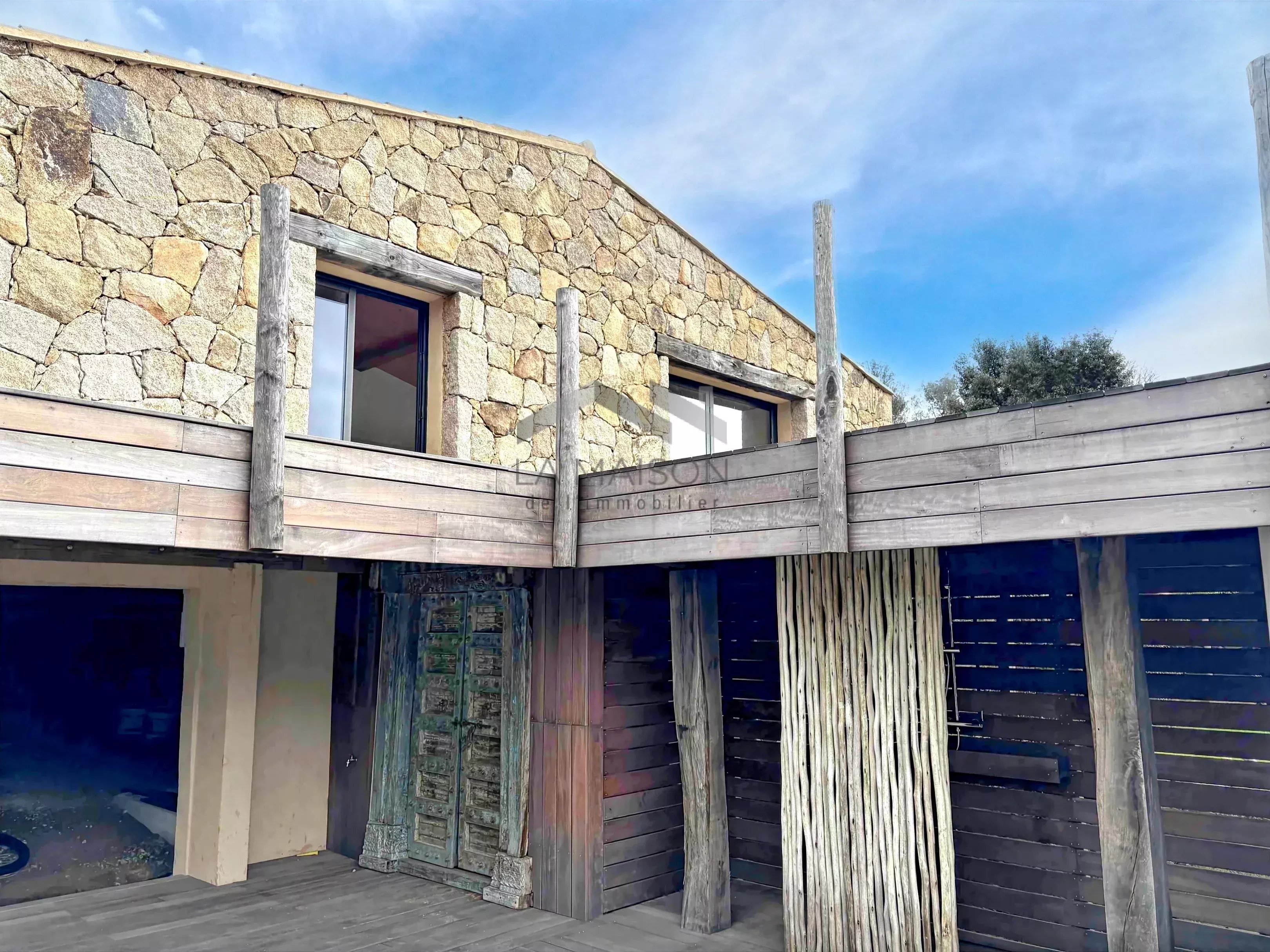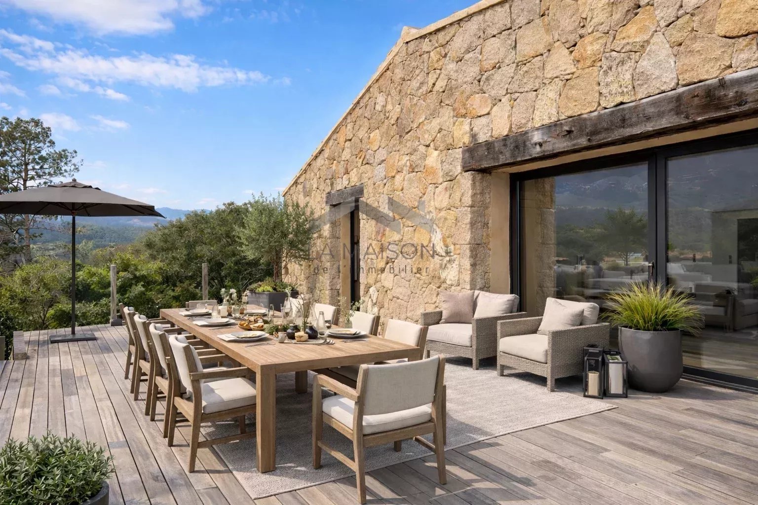 Bergerie contemporaine en pierre avec piscine – Sotta – Située à seulement 5 minutes du village de Sotta et 20 minutes de Porto-Vecchio, cette magnifique bergerie contemporaine en pierre développe une surface habitable d’environ 154 m² et bénéficie d’un environnement calme et privilégié, avec une vue panoramique dégagée sur les montagnes. La villa offre un bel espace de vie lumineux, composé d’un séjour spacieux ouvert sur l’extérieur, permettant de profiter pleinement de la terrasse et du cadre naturel environnant. La cuisine moderne entièrement équipée, à la fois fonctionnelle et conviviale, est complétée par un cellier attenant. L’espace nuit se compose de trois chambres confortables, ainsi que de deux salles d’eau avec WC, équipées de meubles en chêne massif, vasques à poser et sèche-serviettes. Un WC indépendant vient compléter l’ensemble pour plus de confort. À l’extérieur, la propriété dispose d’une superbe terrasse en bois exotique avec pergola, idéale pour profiter des beaux jours, ainsi que d’une piscine parfaitement intégrée dans son environnement naturel, offrant un espace de détente privilégié face aux montagnes. Prestations : Climatisation dans toutes les pièces Deux places de stationnement Matériaux de qualité et finitions soignées Cette bergerie moderne en pierre à Sotta séduit par son architecture typique, ses prestations de qualité et son cadre naturel exceptionnel, à proximité immédiate de Porto-Vecchio et des plages de l’Extrême-Sud. Un bien rare sur le secteur.