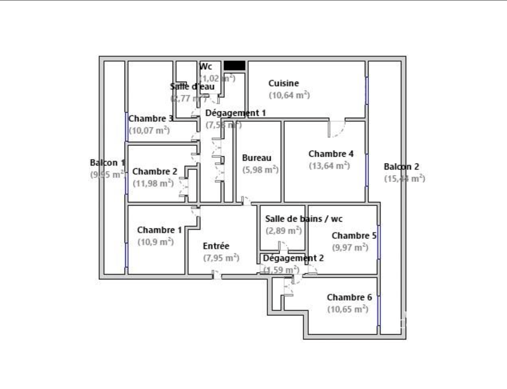 Le bien se compose d'une entrée, d'un salon lumineux, d'une cuisine indépendante, de 5 chambres, d'un bureau, d'une salle d'eau, d'une salle de bains avec WC, d'un WC séparé, ainsi que de deux balcons.