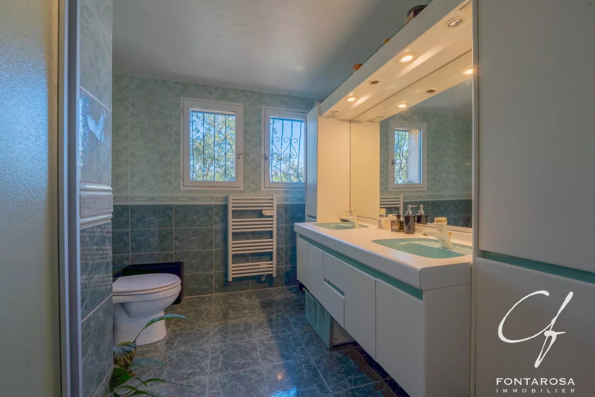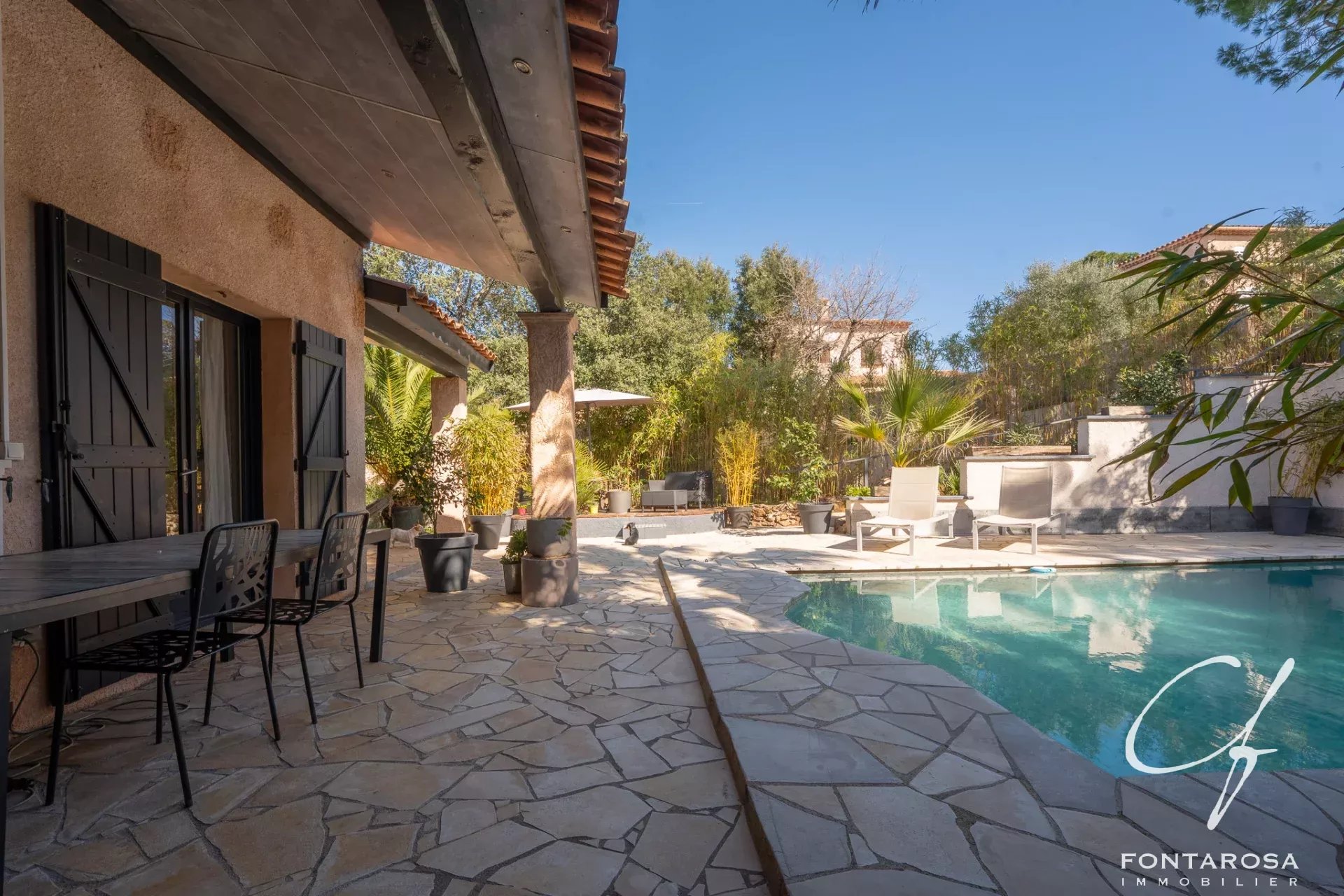 Costruita su un magnifico terreno paesaggistico e alberato. accuratamente mantenuto. la proprietà offre un ambiente di vita tranquillo e privilegiato. Gli spazi esterni invitano al relax con una bella piscina salata. perfettamente integrata nel giardino. così come un sistema di irrigazione automatico che facilita la manutenzione delle aree verdi.