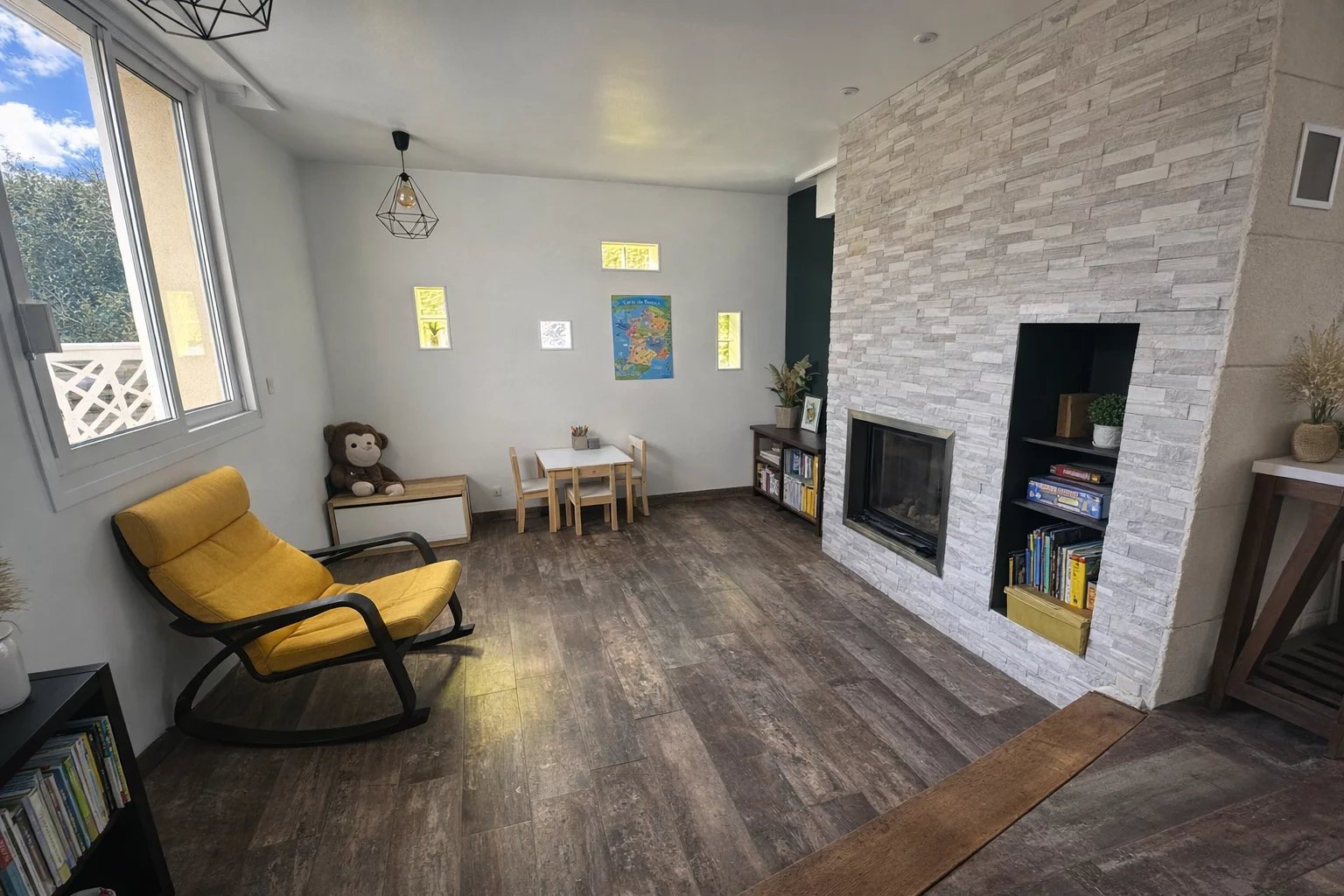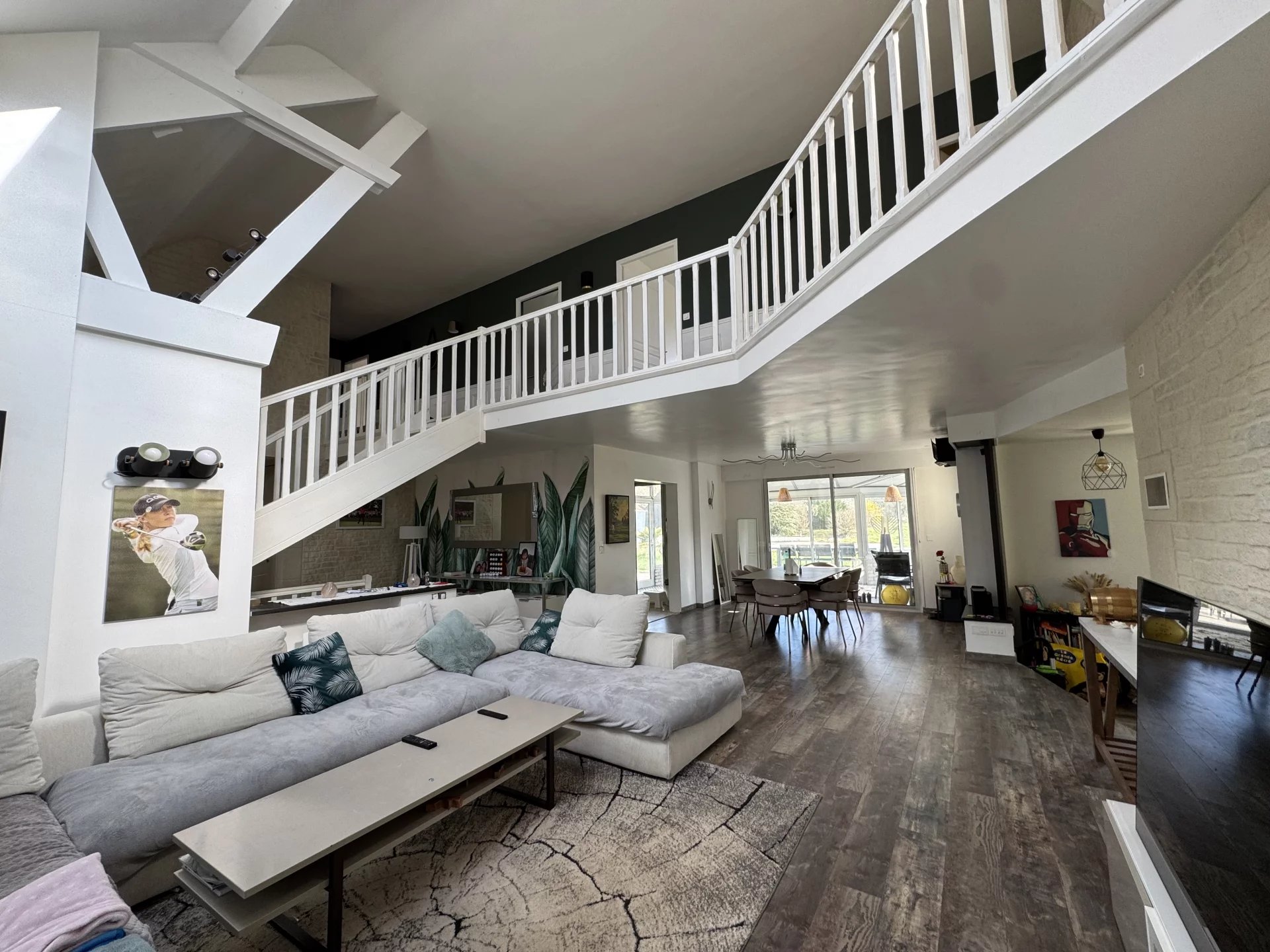 Au rez-de-chaussée, une entrée dessert un superbe salon en cathédrale, offrant une belle hauteur sous plafond et une luminosité exceptionnelle. Cet espace de vie se compose d’un grand séjour/salle à manger ouvert sur une cuisine aménagée et équipée, idéal pour partager des moments conviviaux.