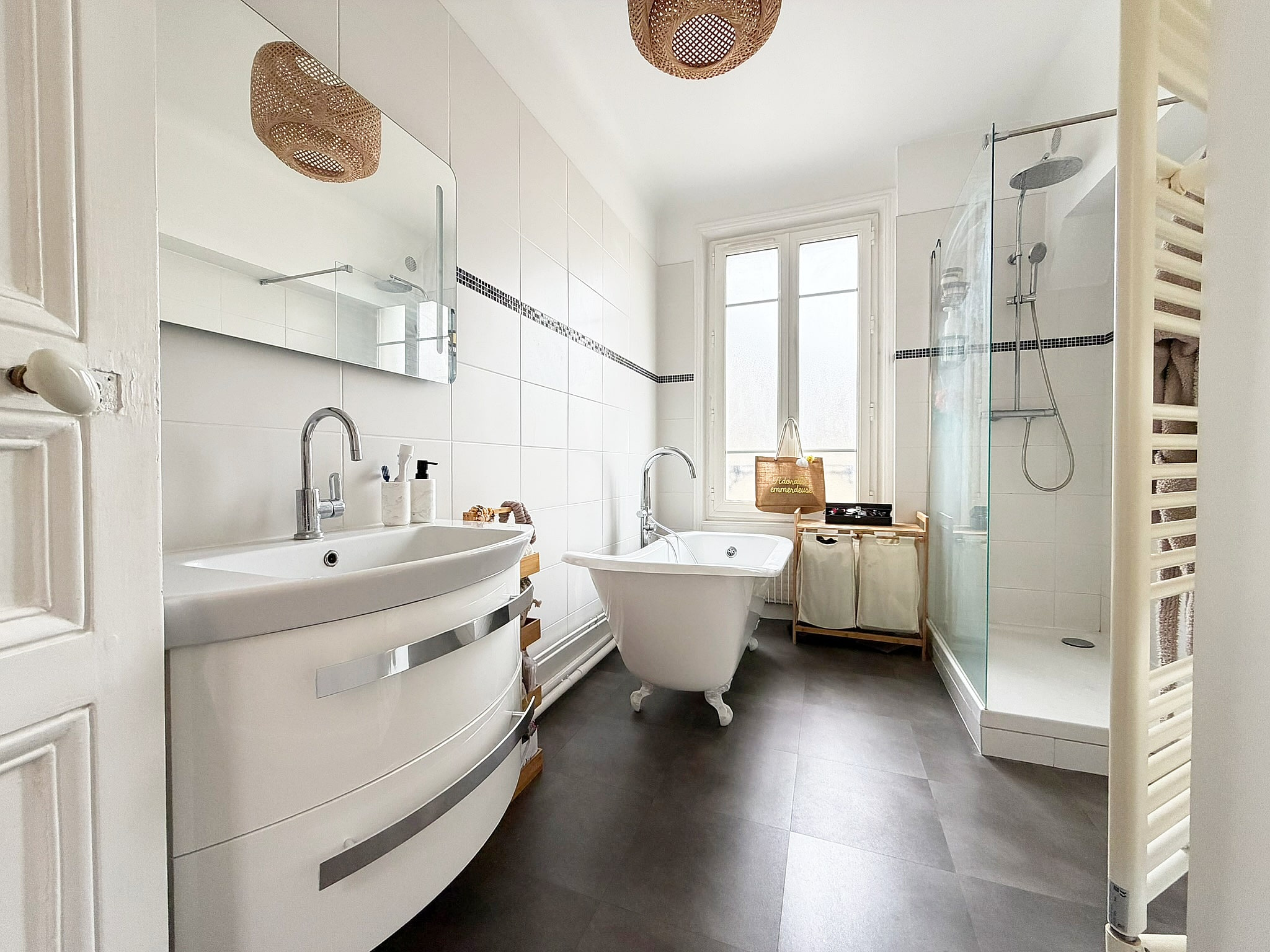 Entrée, vestibule avec deux grands dressings, salon-séjour, cuisine aménagée et équipée, 3 chambres, salle de bains avec baignoire et douche, 2 wc séparés, buanderie, pièce lingerie avec dressing.