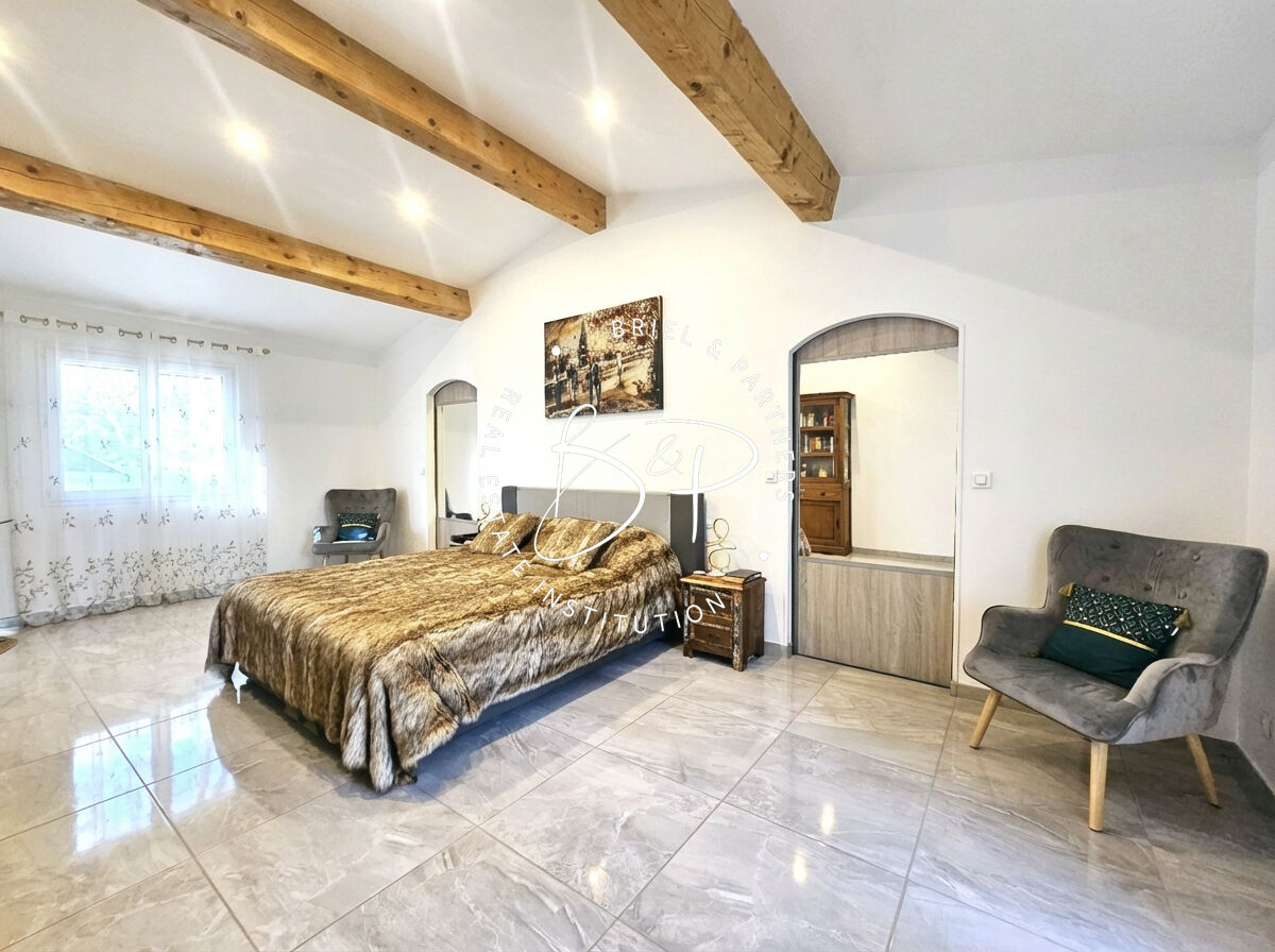 A Lorgues, sur un terrain plat et joliment arboré de 3 791 m², cette villa développe environ 183 m² habitables et offre des espaces généreux baignés de lumière. La pièce de vie constitue le coeur de la maison avec près de 56 m² dédiés au séjour et à la salle à manger. Orientée SUD, elle profite d'une belle luminosité tout au long de la journée et s'organise autour d'une cheminée avec insert. La cuisine ouverte, contemporaine et entièrement équipée, s'intègre harmonieusement à l'ensemble. Le rez-de-chaussée dispose également d'une suite parentale confortable, de 42 m² comprenant un dressing ainsi qu'une salle de bains. Un WC et une salle d'eau supplémentaires. A l'étage, l'espace nuit propose trois chambres de belles dimensions accompagnées d'une salle d'eau. La maison est équipée d'une climatisation réversible dans toutes les pièces, assurant chauffage et fraîcheur selon les saisons. A l'extérieur, le jardin entièrement clôturé et paysager accueille une piscine, une cuisine d'été avec bar ainsi que plusieurs terrasses propices aux moments de détente. Un garage fermé, un carport et des espaces de stationnement permettent d'accueillir plusieurs véhicules. Soigneusement entretenue, cette propriété conjugue charme provençal et confort actuel, dans un environnement agréable. Virginie FAURIAUX (EI) Agent Commercial - Numéro RSAC : 878424357 - DRAGUIGNAN.