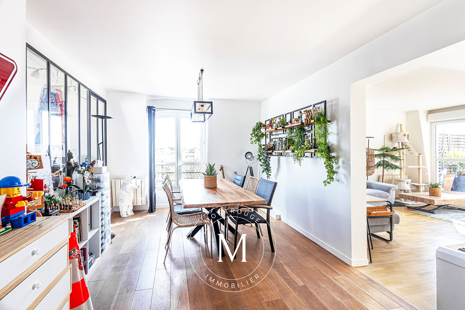 Montrouge Immobilier est heureux de vous présenter un appartement familiale de 5 pièces, au dernier étage d'un immeuble récent, et doté d'une terrasse de 100 m² en accès direct et de plain pieds. C'est un bien rare sur le marché, et une vue sur tous les monuments de Paris, entre Tour Eiffel, Sacré Coeur et Tour Montparnasse... Seul sur son étage, l'appartement propose aujourd'hui 3 chambres et 1 bureau. L'une des chambre est une suite parentale complète avec dressings et salle de douche privative. Toutes situées côté nuit, cet espace compte également une salle de bain et un espace dressings indépendant. Ensuite, la salle à manger, le salon et la cuisine, qui ouvrent sur l'exceptionnelle terrasse de 100 m², aménagée et arborée. Notre coup de coeur va aux deux chiliennes installées pour profiter tous les jours de la vue Tour Eiffel ! L'appartement est clair, fonctionnel, au calme et se vit telle une maison perchée. Une cave et un parking complète ce bien. Prix 1 550 000 euros, dont 50 000 euros d'honoraires agence charge acquéreur. TF 1687 euros. Charges mensuelles 300 euros. DPE D et B. Contactez-nous pour une visite du lundi au samedi. (3.33 % honoraires TTC à la charge de l'acquéreur.) Copropriété de 23 lots - dont 23 lots habitation. Charges annuelles : 3600 euros. Mélodie CARRAS (EI) Agent Commercial - Numéro RSAC : 891269177 - NANTERRE.
