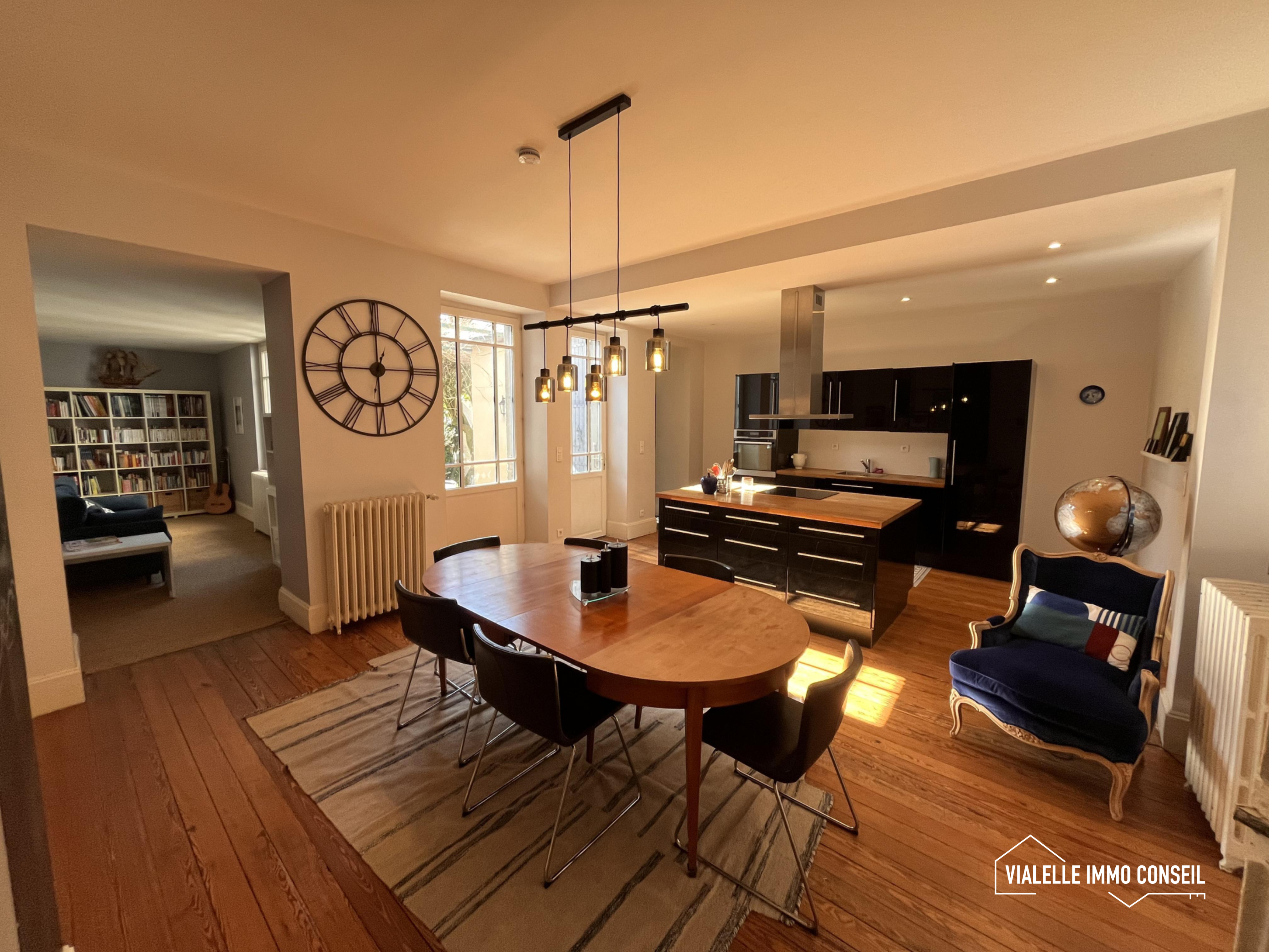 Espace de vie au rez de chaussé rénové avec goût comprenant une vaste entrée donnant sur un salon de près de 30m2. La cheminée présente dans cette pièce est fonctionnelle et apporte un côté chaleureux à cet espace. Un deuxième sas dessert l'espace cuisine/salle à manger. Ce vaste espace lumineux donne sur un petit jardin privatif au calme. Une Bibliothèque est également située dans le prolongement du séjour. Au milieu de la maison, se trouve un bel escalier d'époque en bois massif qui donne sur les espaces nuits ( R+1 , R+2 ) et sur une grande cave de 96m2.