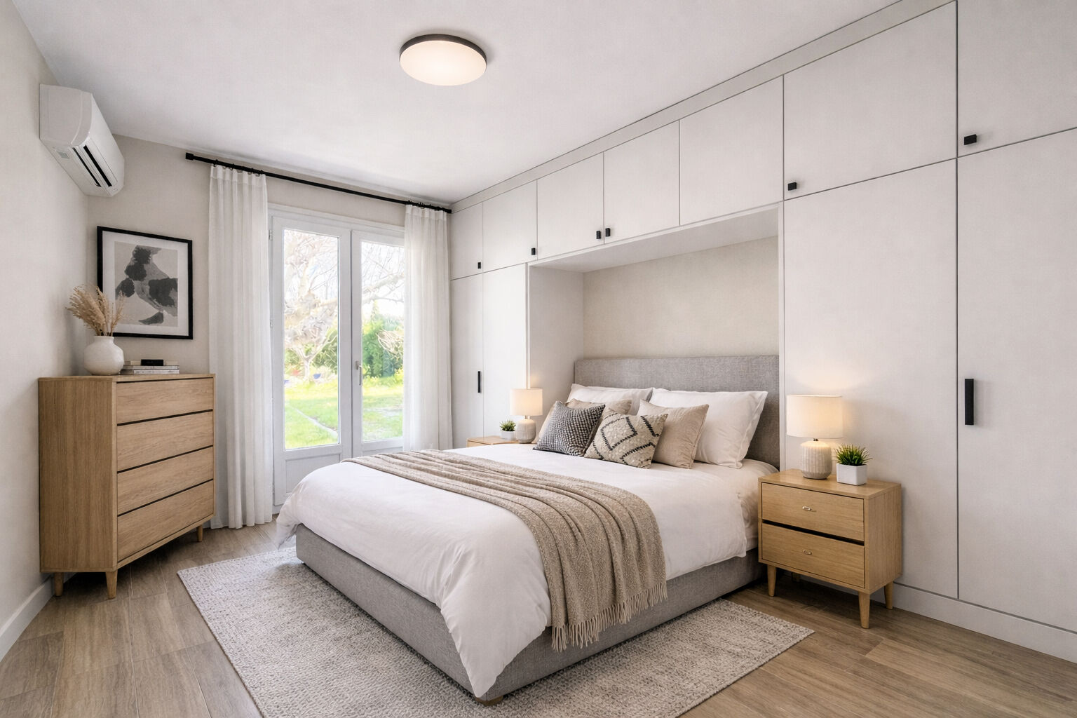 Proposition d'aménagement virtuel (photos : séjour, cuisine, chambre et salle de bains )
