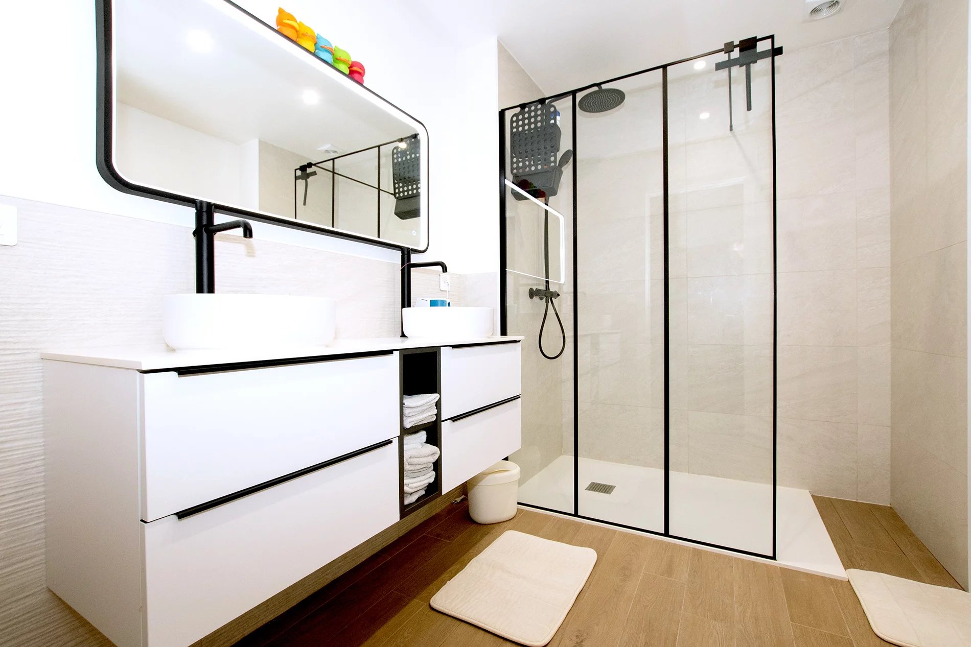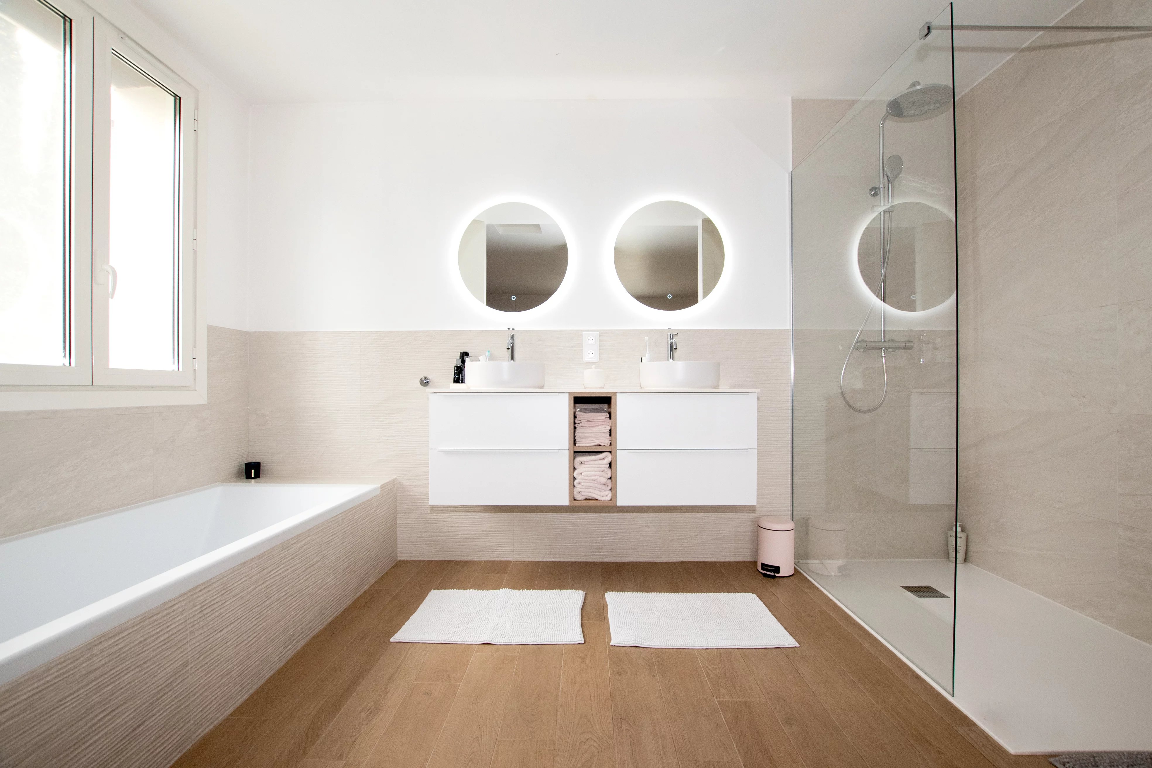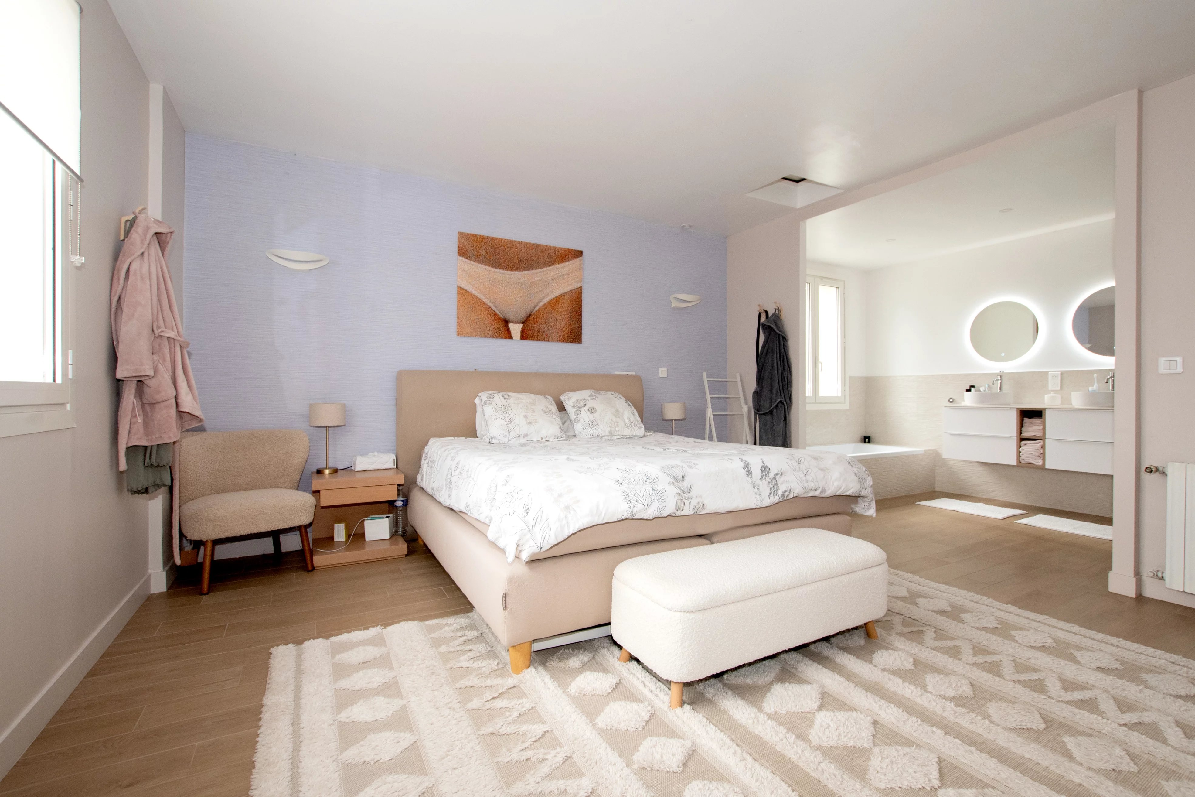 L'étage se compose de quatre chambres spacieuses, dont une suite parentale avec dressing et salle de bain complète (baignoire et douche). Une salle d'eau familiale indépendante avec double vasque dessert les autres chambres, dont deux bénéficient d'un accès direct au jardin. L'ensemble de la maison est équipé de la climatisation et de nombreux rangements intégrés.
