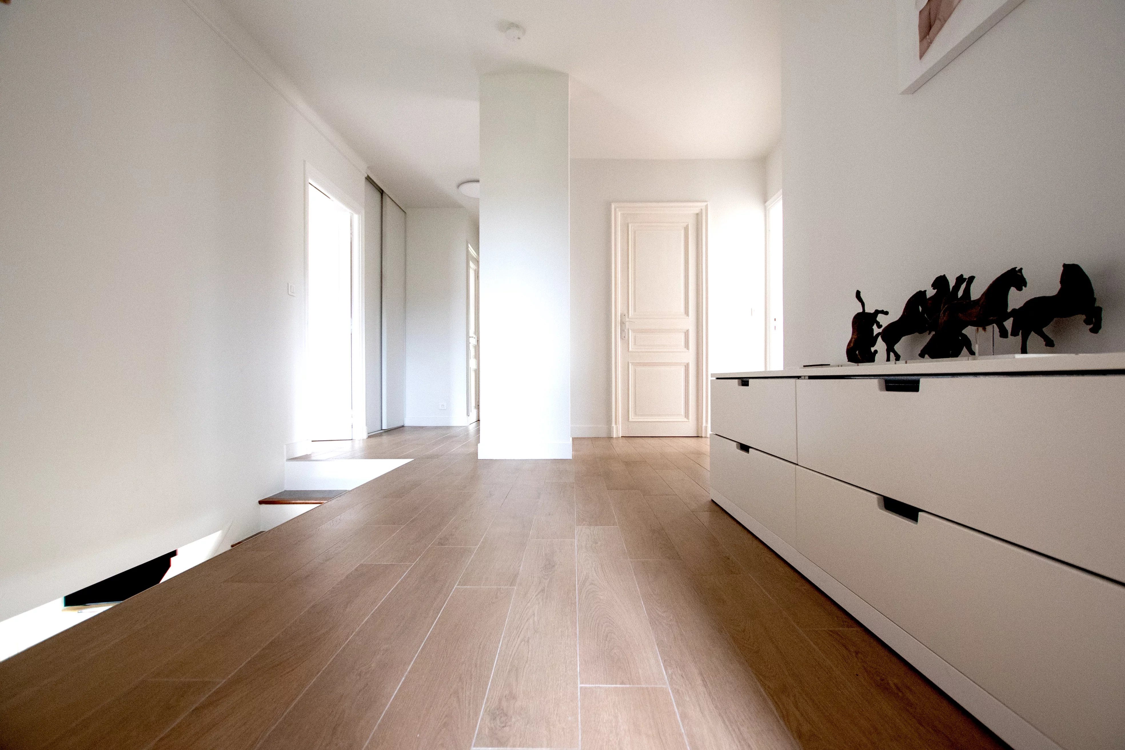 Le rez-de-chaussée s'articule autour d'une pièce de réception de 76 m² comprenant une cheminée, un salon et un espace salle à manger dédié. Cet espace communique avec une cuisine moderne de 20 m² entièrement équipée, une arrière-cuisine (cellier) et une buanderie. Un bureau polyvalent, pouvant servir de cinquième chambre avec la possibilité de créer une salle d'eau attenante, complète ce niveau. Les espaces extérieurs sont mis en valeur par une terrasse couverte de 13,5 m² et une terrasse en bois de 28 m² installée en 2023, offrant un accès direct au jardin.
