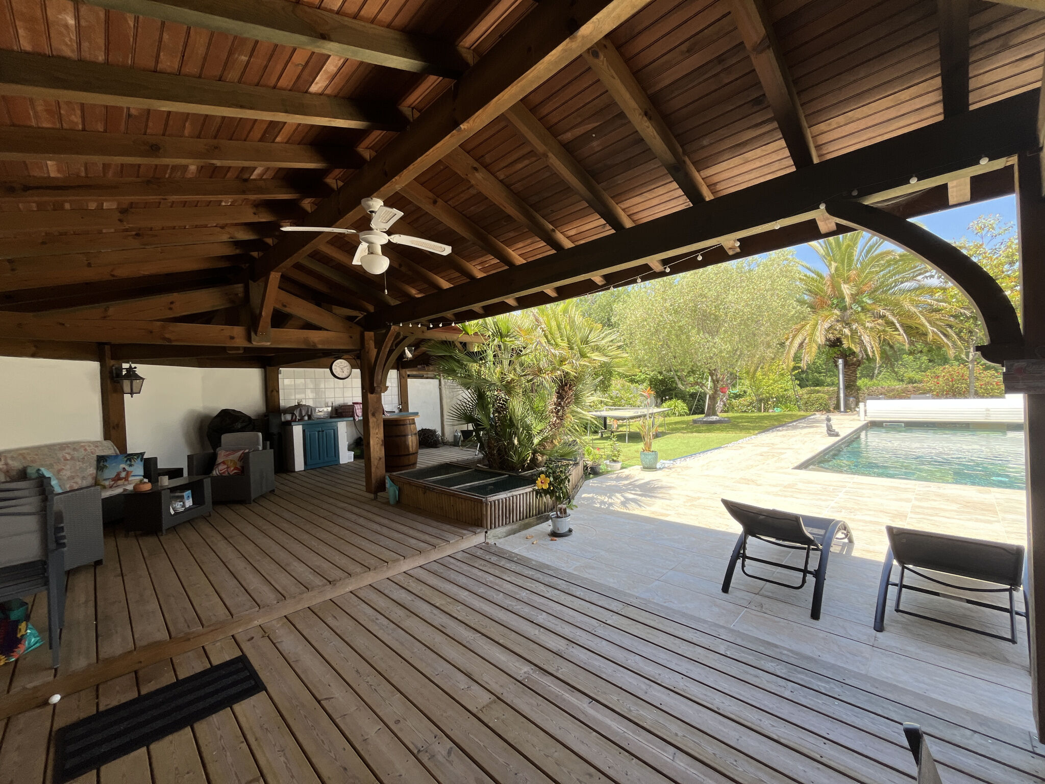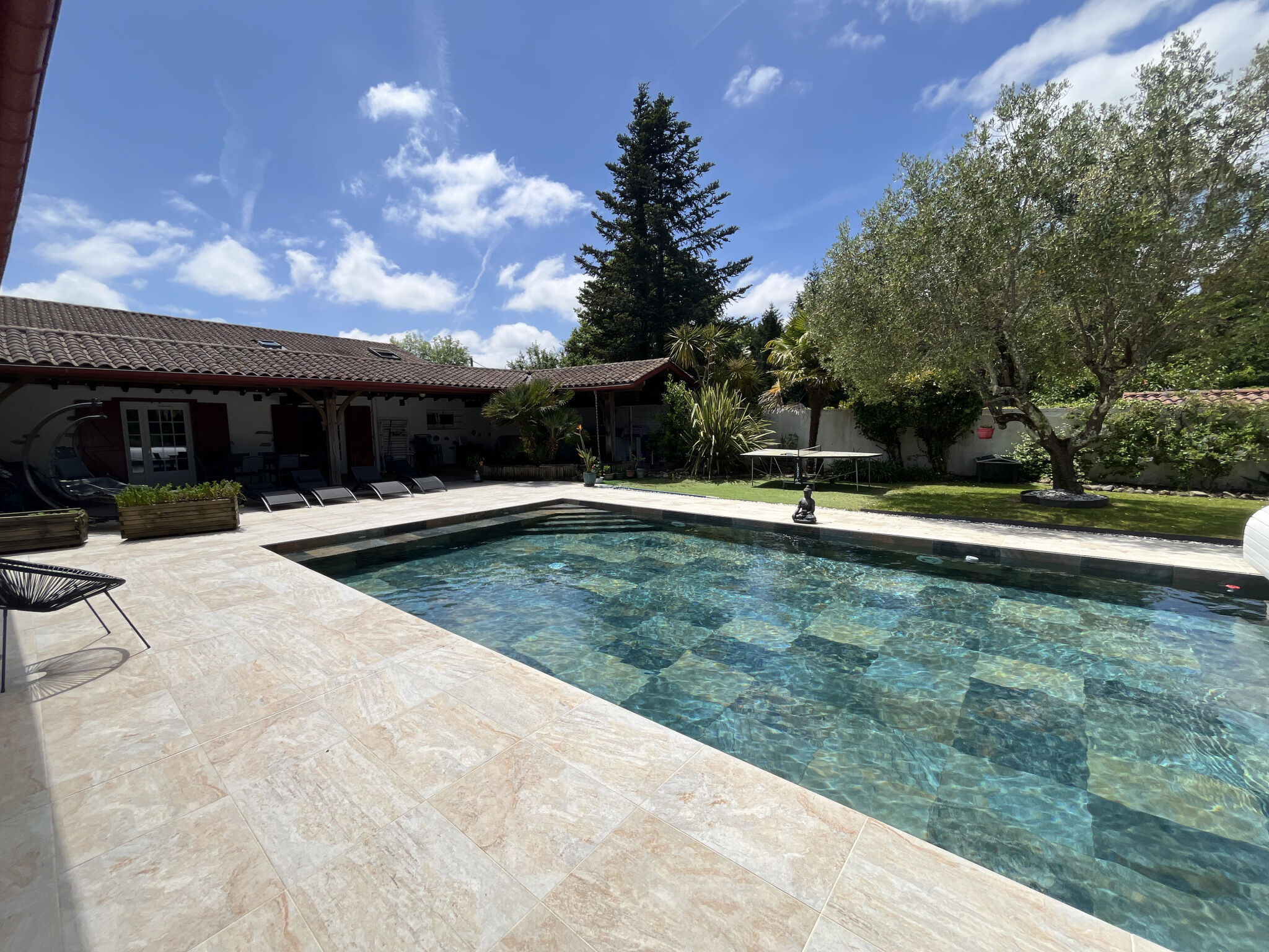RETOUR A LA VENTE de ce magnifique corps de ferme du XVIIe siècle composé de deux bâtisses, chargées d'histoire et rénovées avec goût, se situe au calme, à Mouguerre, à seulement 10 minutes de Bayonne. L'ensemble, articulé autour d'un ravissant patio avec piscine chauffée et sécurisée (9x5m), comprend deux habitations distinctes : - La maison principale, d'environ 185 m², allie charme d'antan avec les pierres et les poutres typiques, et confort moderne. Elle offre de grands espaces de vie, une cuisine neuve équipée, un salon chaleureux avec cheminée, un bureau, deux chambres, et une salle d'eau en rdc. À l'étage, trois chambres, une salle d'eau avec WC,- La dépendance, d'environ 76 m², est enregistrée gîte de France. et propose un logement contemporain avec un grand espace de vie de 39 m², une chambre en rdc, une mezzanine avec salle d'eau et espace nuit, et bénéficie également d'une climatisation réversible et d'un système de pompe à chaleur, tout comme la maison principale. Les extérieurs sont tout aussi séduisants et offrent differents espaces de détente : plus de 200 m² de terrasses autour de la piscine, terrain de pétanque, parfait pour les moments de convivialité. Garage, abri voitures, atelier, vaste parkingUn havre de paix, à seulement 3 minutes des écoles, à quelques minutes de l'autoroute A63 / A64, du collège et des commerces, l'aéroport de Biarrtz et la gare de Bayonne sont à environ15 minutes. Une propriété rare et authentique, idéale pour une grande famille, un projet commun, ou une activité d'accueil. À découvrir sans tarder ! 1.Informations LOI ALUR :