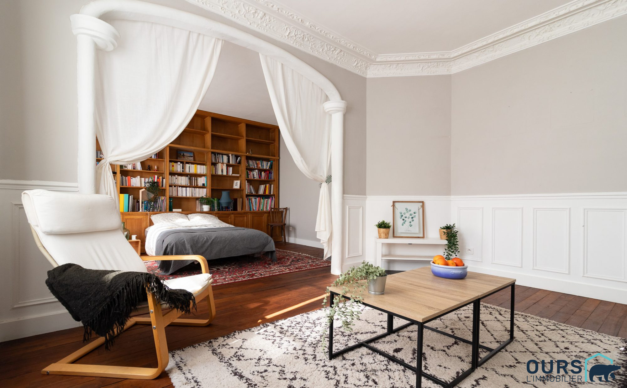 Baigné de lumière grâce à son orientation plein Sud et à ses nombreuses ouvertures, son agencement est vraiment agréable : il se compose d'une entrée distribuant d'un côté un beau séjour et une chambre de taille équivalente pourvue d'une superbe bibliothèque. Ces deux pièces peuvent également se présenter sous la forme d'une grande et spacieuse pièce de vie.