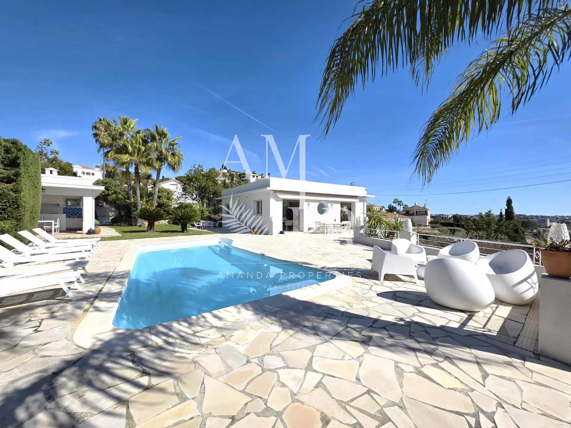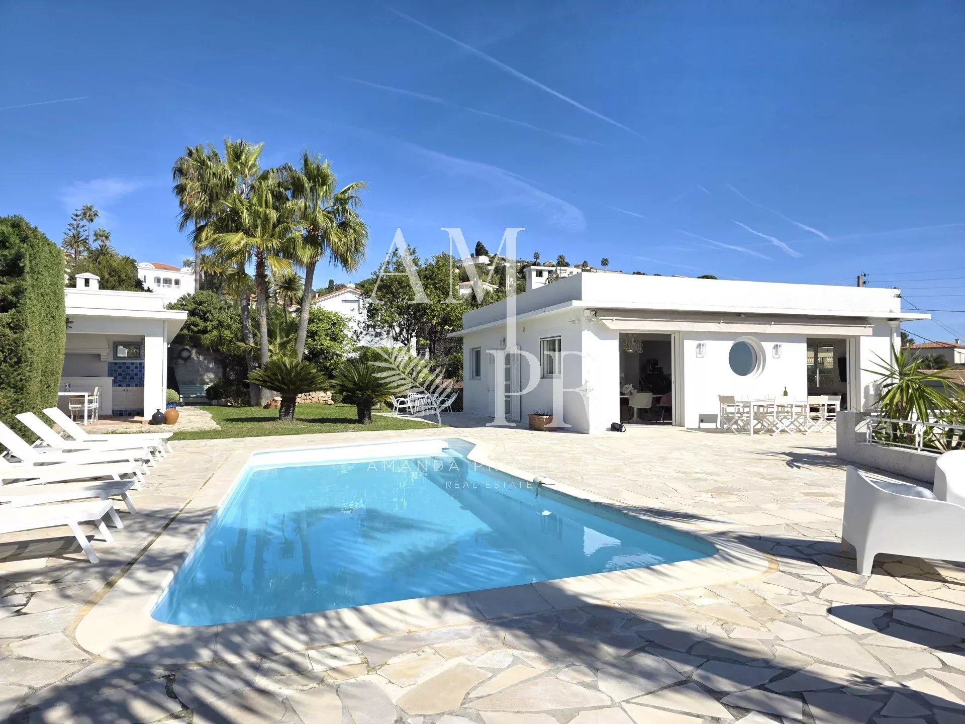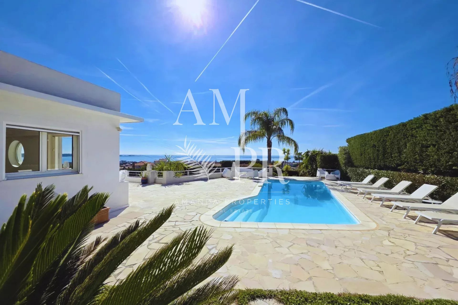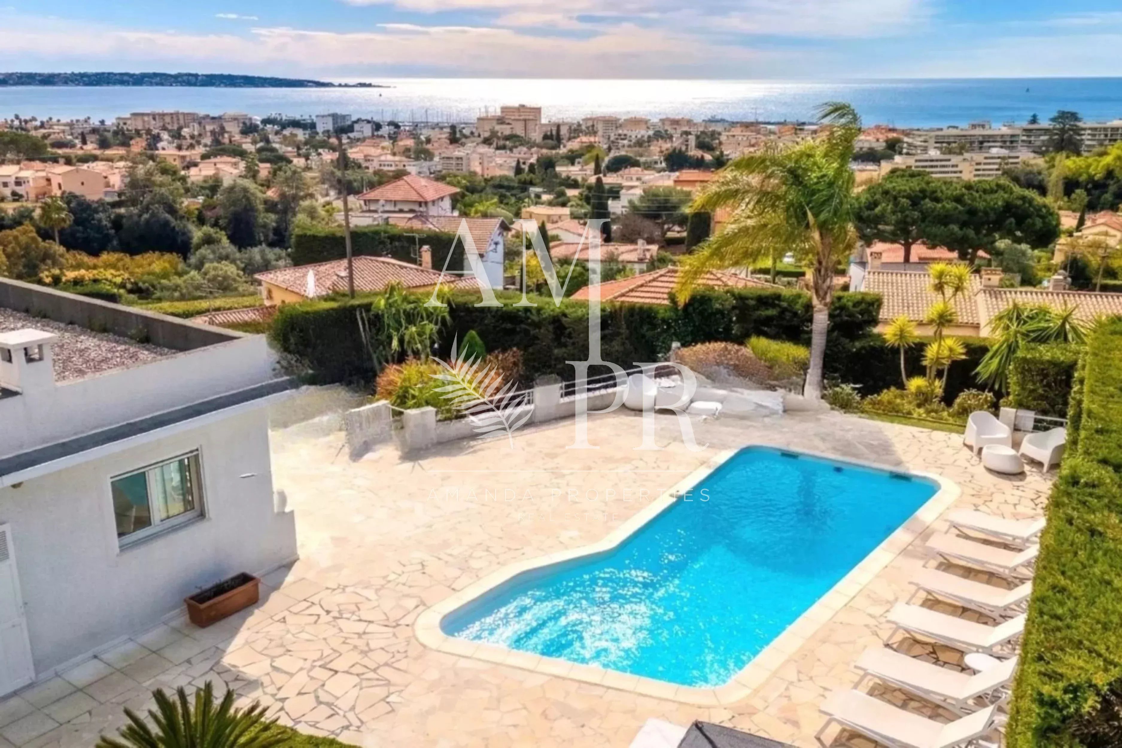 Amanda Properties vous propose, à deux pas du centre de Golfe-Juan et à seulement 2 minutes des plages, du port et des commerces, cette élégante villa de style californien d’environ 170 m², édifiée sur un terrain d’environ 1 000 m². Bénéficiant d’un emplacement exceptionnel, la propriété offre une vue mer panoramique spectaculaire sur le Golfe-Juan, les Îles de Lérins et le Cap d’Antibes. La villa se compose de quatre chambres en suite, chacune disposant de sa propre salle de douche ou salle de bains, garantissant confort et intimité. Les espaces de vie lumineux s’ouvrent sur l’extérieur et comprennent une cuisine américaine moderne entièrement équipée, prolongée par un vaste séjour donnant sur les terrasses et la piscine. À l’extérieur, un agréable espace de détente avec piscine et pool house permet de profiter pleinement du cadre méditerranéen et de la vue mer. La propriété dispose également d’un garage ainsi que de plusieurs places de stationnement extérieures. Une villa rare sur le secteur, idéale en résidence principale, secondaire ou investissement locatif offrant calme, proximité immédiate des commodités et panorama d’exception.