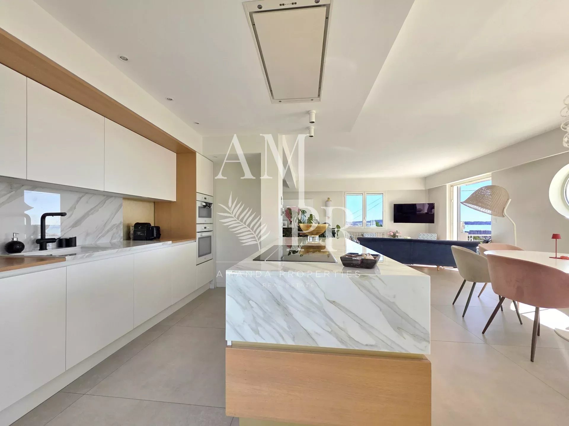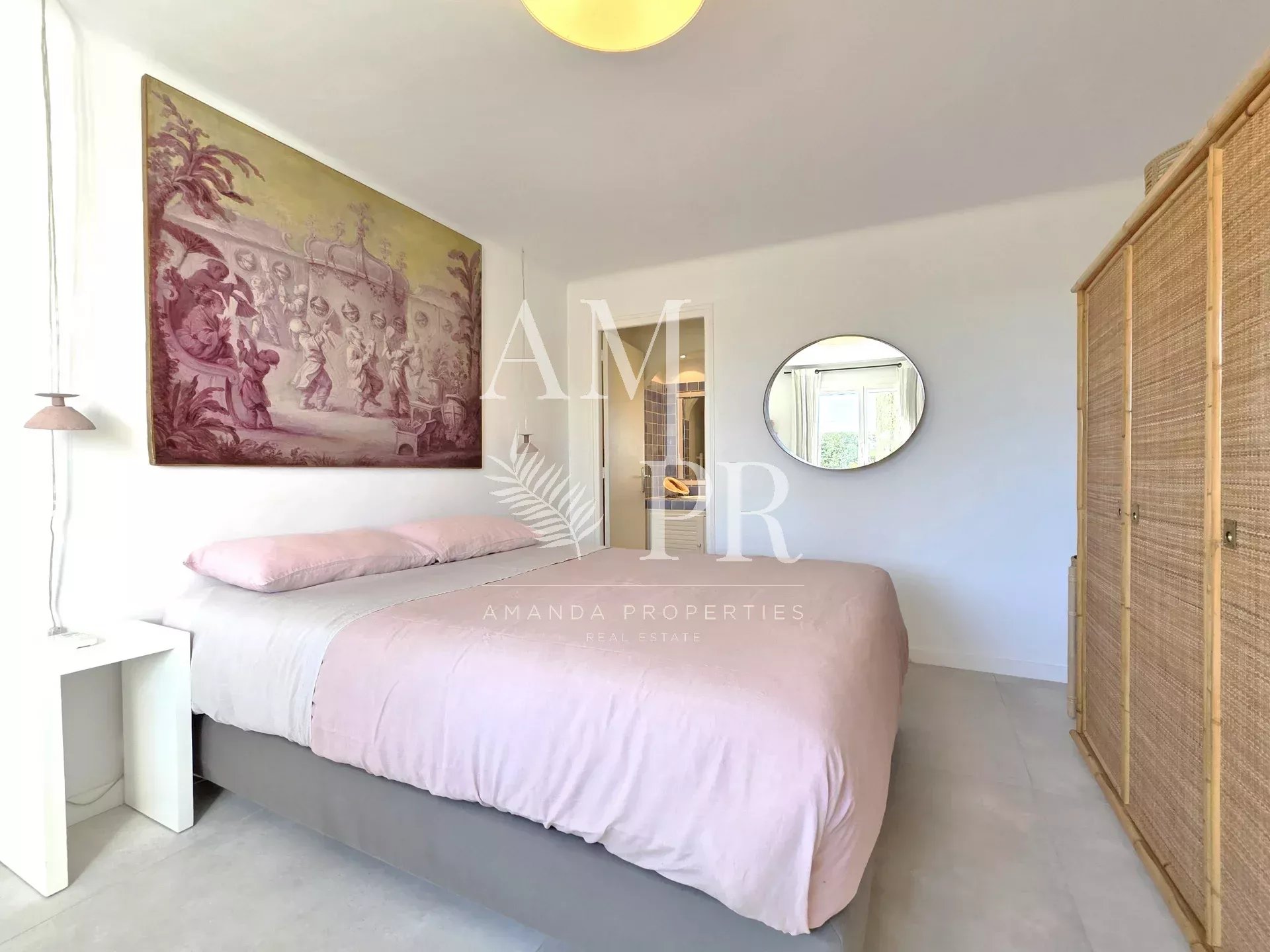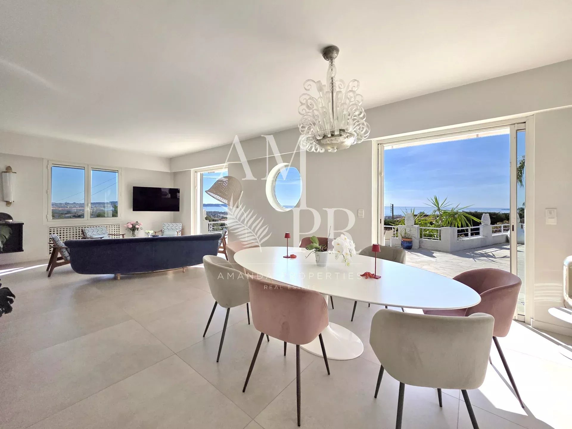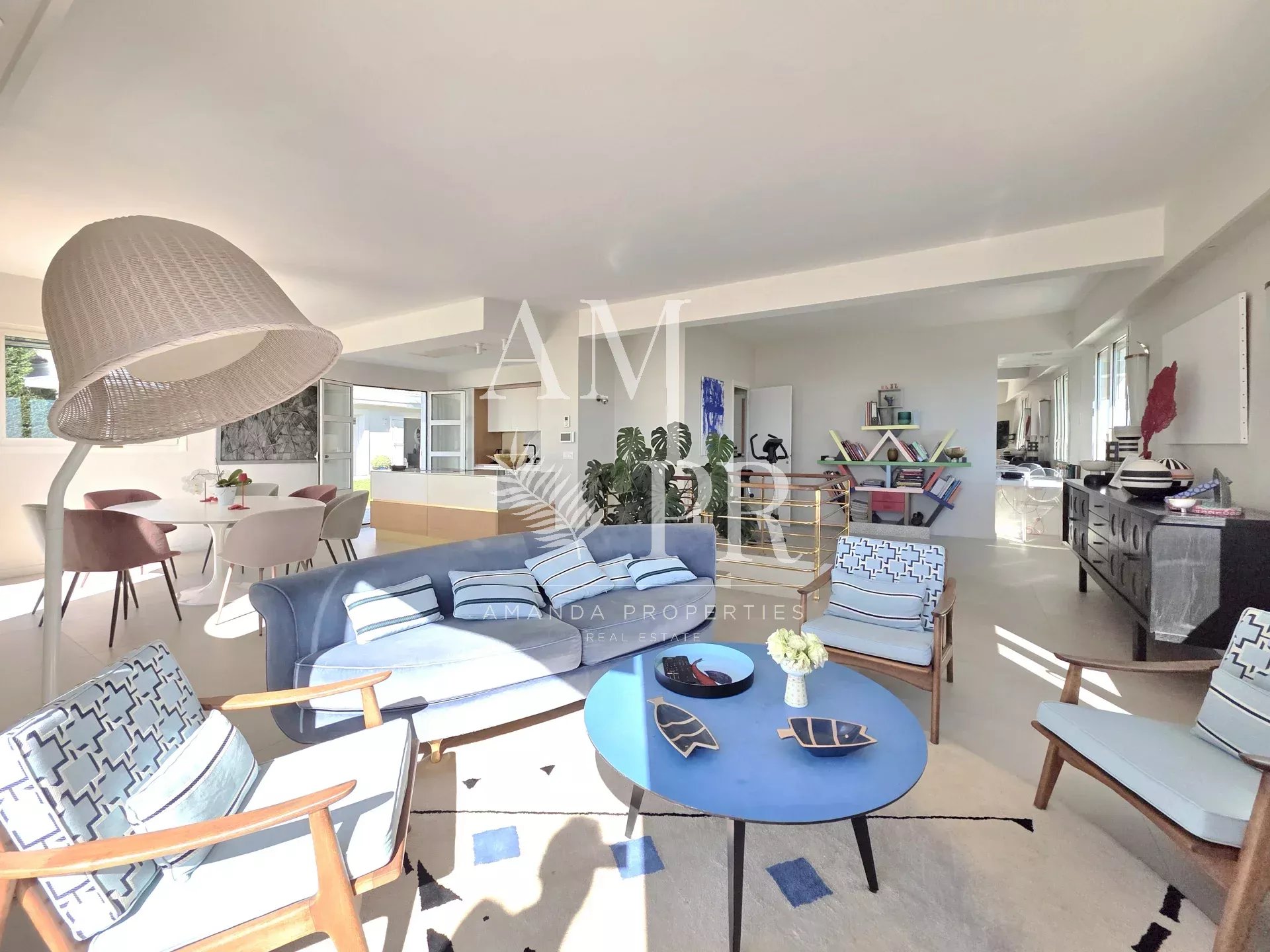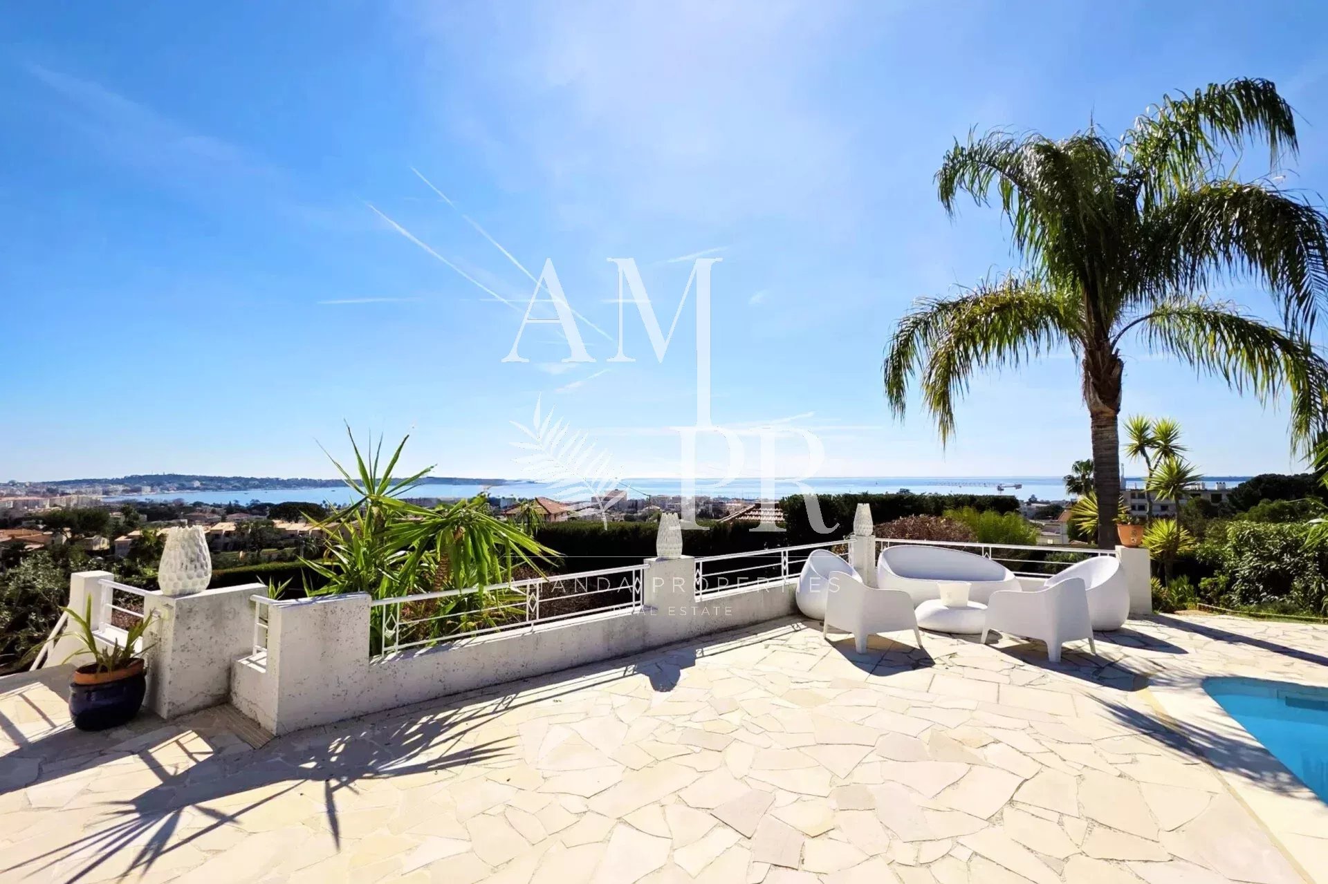 Amanda Properties vous propose, à deux pas du centre de Golfe-Juan et à seulement 2 minutes des plages, du port et des commerces, cette élégante villa de style californien d’environ 170 m², édifiée sur un terrain d’environ 1 000 m². Bénéficiant d’un emplacement exceptionnel, la propriété offre une vue mer panoramique spectaculaire sur le Golfe-Juan, les Îles de Lérins et le Cap d’Antibes. La villa se compose de quatre chambres en suite, chacune disposant de sa propre salle de douche ou salle de bains, garantissant confort et intimité. Les espaces de vie lumineux s’ouvrent sur l’extérieur et comprennent une cuisine américaine moderne entièrement équipée, prolongée par un vaste séjour donnant sur les terrasses et la piscine. À l’extérieur, un agréable espace de détente avec piscine et pool house permet de profiter pleinement du cadre méditerranéen et de la vue mer. La propriété dispose également d’un garage ainsi que de plusieurs places de stationnement extérieures. Une villa rare sur le secteur, idéale en résidence principale, secondaire ou investissement locatif offrant calme, proximité immédiate des commodités et panorama d’exception.