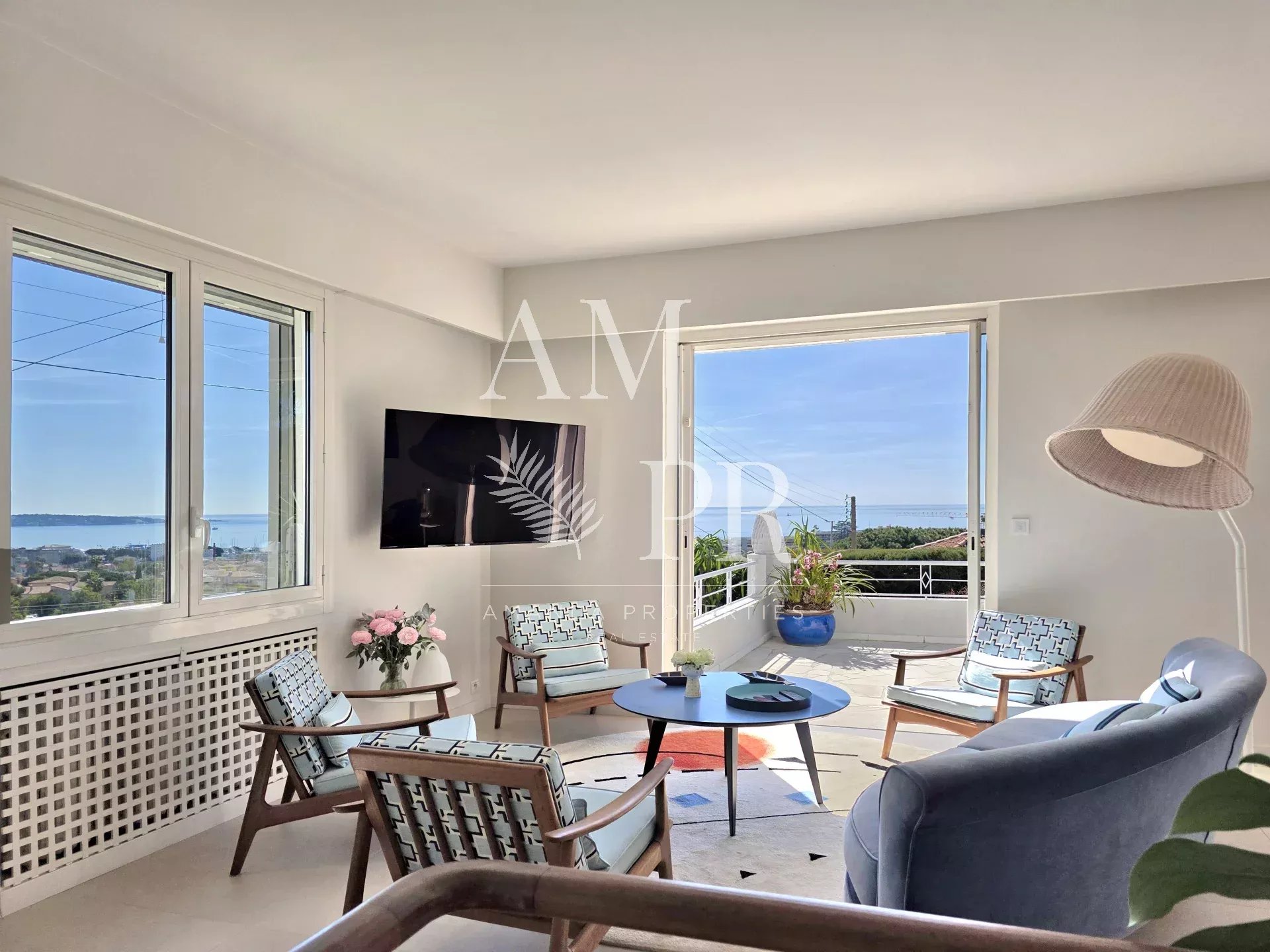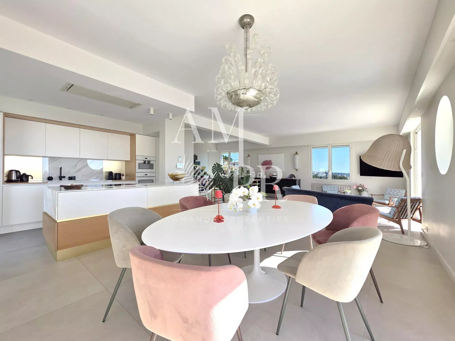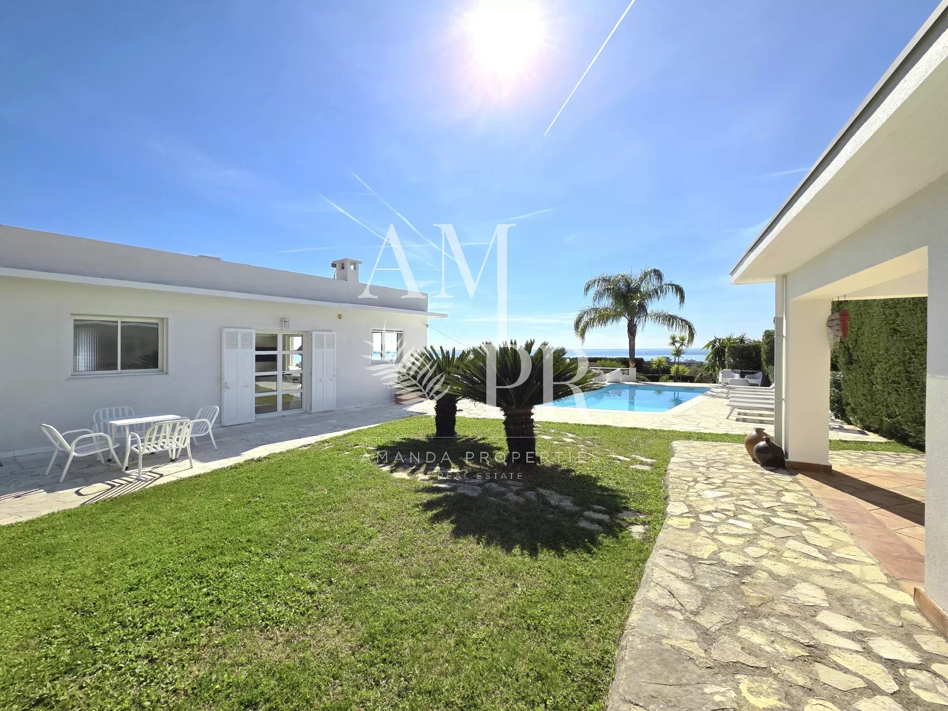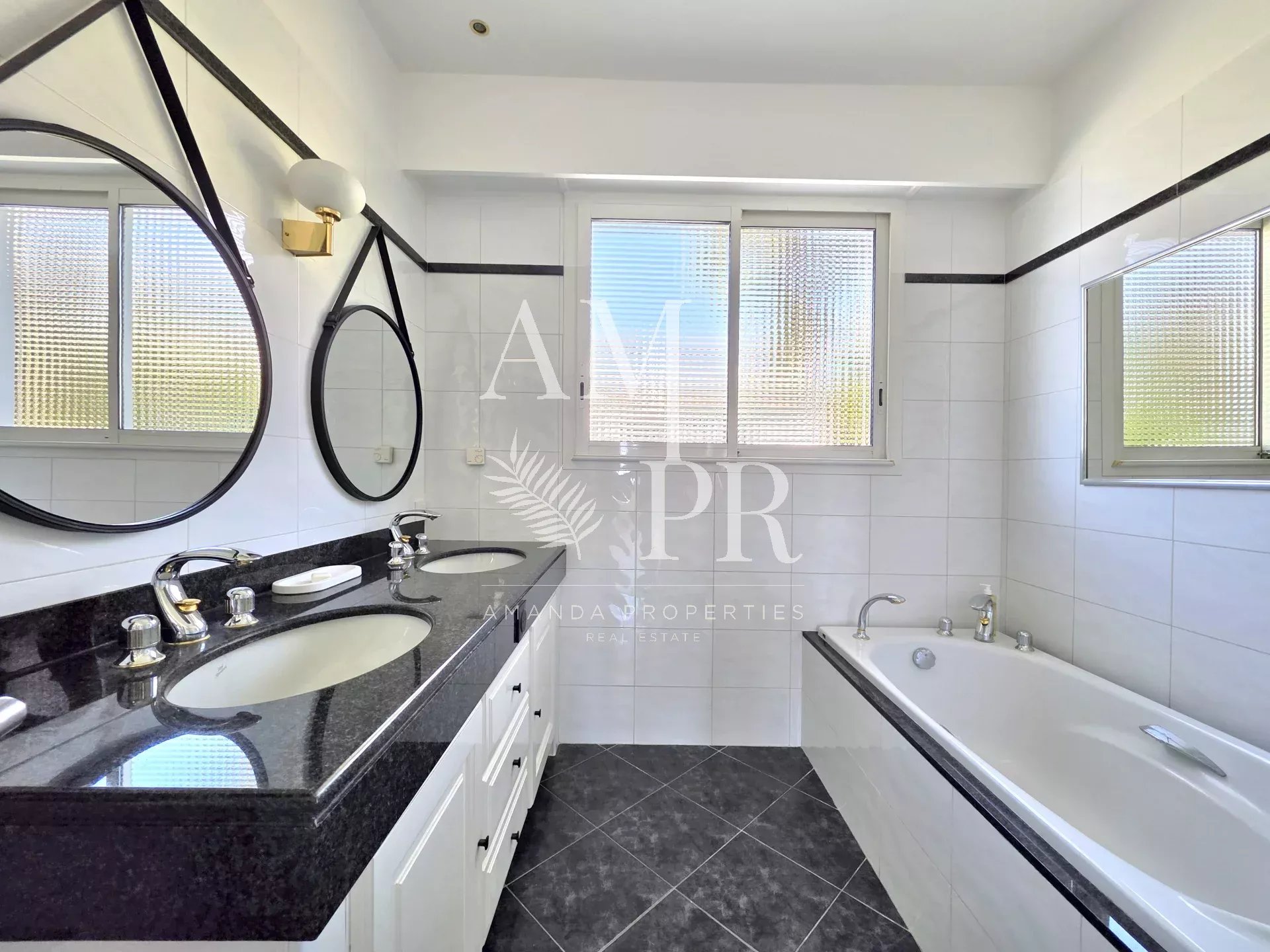 Amanda Properties vous propose, à deux pas du centre de Golfe-Juan et à seulement 2 minutes des plages, du port et des commerces, cette élégante villa de style californien d’environ 170 m², édifiée sur un terrain d’environ 1 000 m². Bénéficiant d’un emplacement exceptionnel, la propriété offre une vue mer panoramique spectaculaire sur le Golfe-Juan, les Îles de Lérins et le Cap d’Antibes. La villa se compose de quatre chambres en suite, chacune disposant de sa propre salle de douche ou salle de bains, garantissant confort et intimité. Les espaces de vie lumineux s’ouvrent sur l’extérieur et comprennent une cuisine américaine moderne entièrement équipée, prolongée par un vaste séjour donnant sur les terrasses et la piscine. À l’extérieur, un agréable espace de détente avec piscine et pool house permet de profiter pleinement du cadre méditerranéen et de la vue mer. La propriété dispose également d’un garage ainsi que de plusieurs places de stationnement extérieures. Une villa rare sur le secteur, idéale en résidence principale, secondaire ou investissement locatif offrant calme, proximité immédiate des commodités et panorama d’exception.