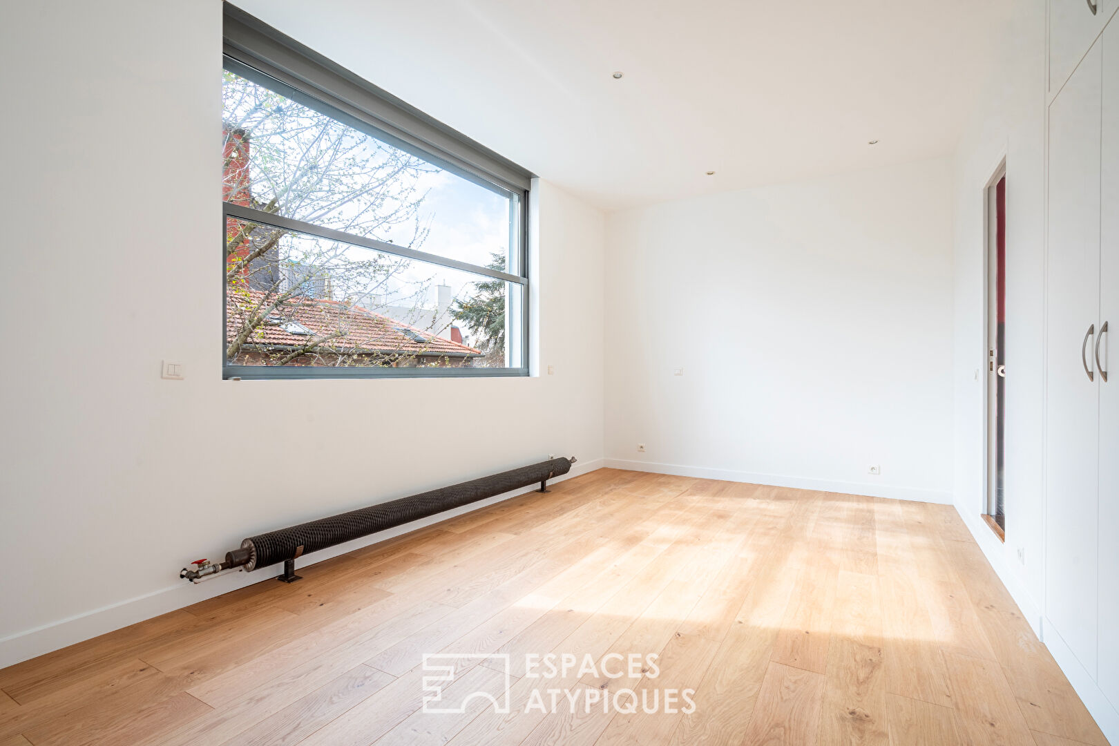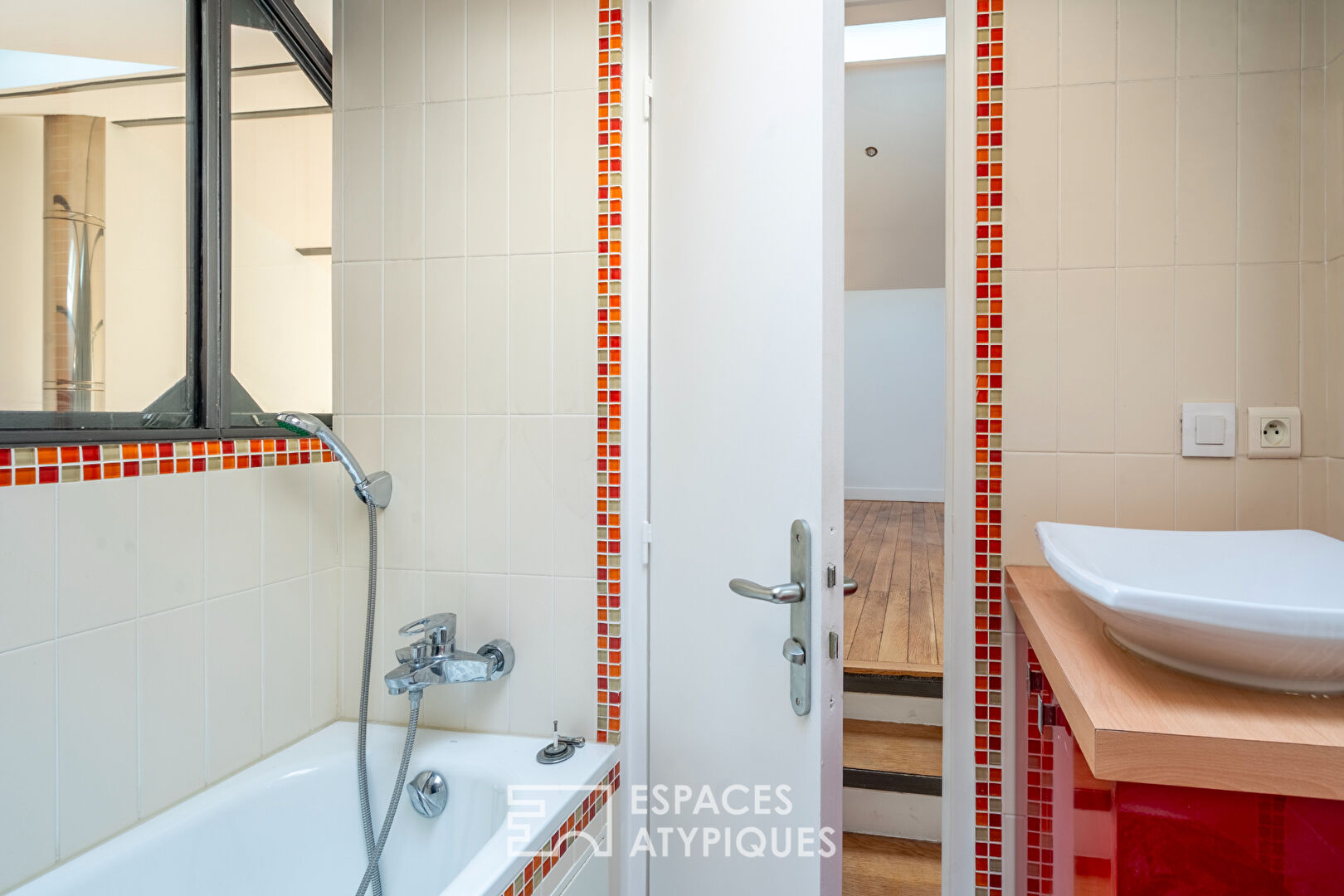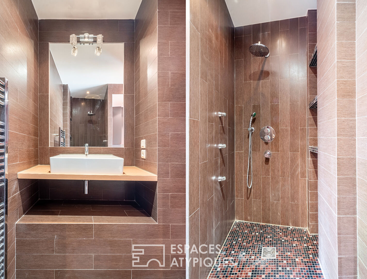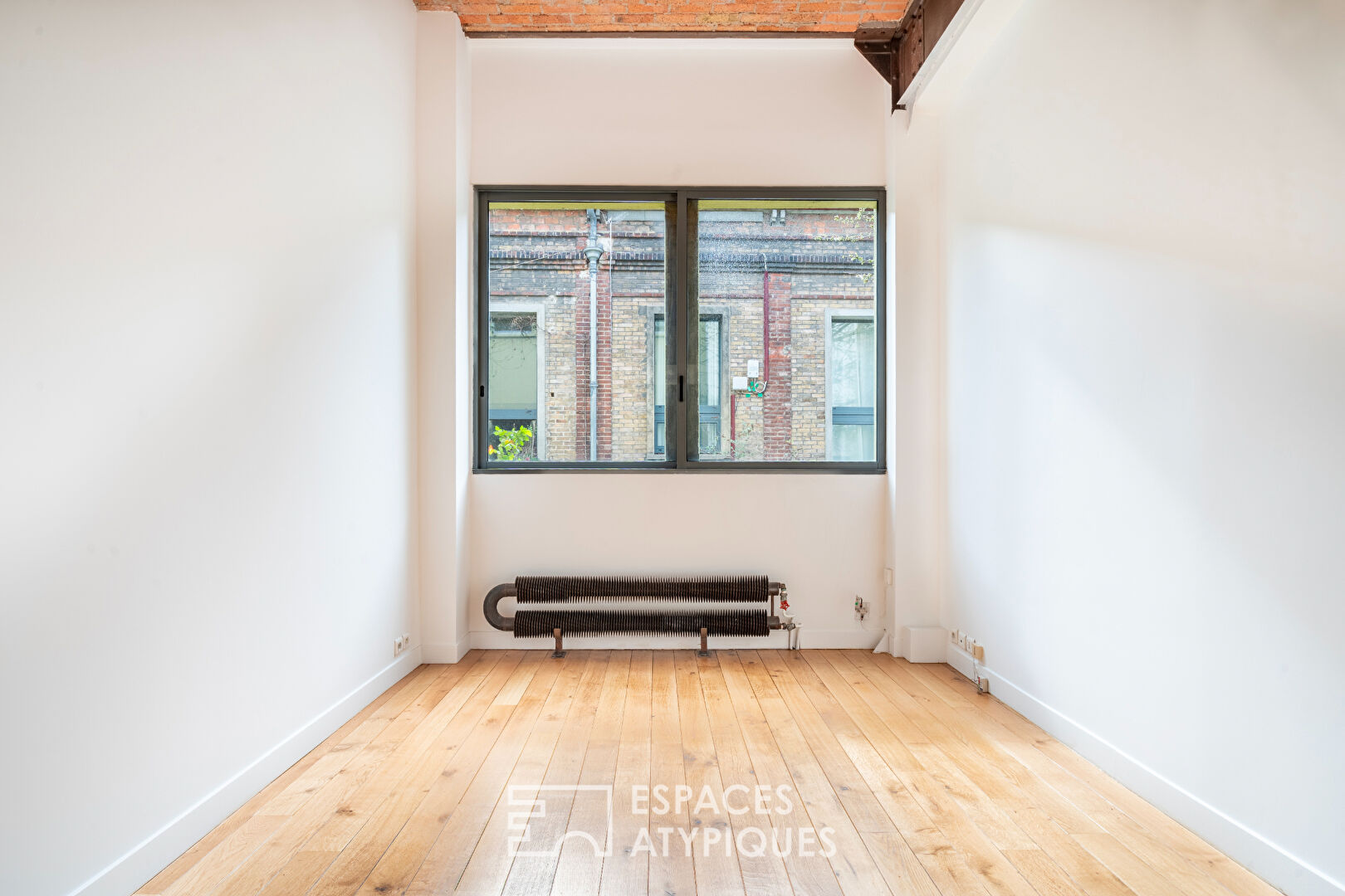 A proximité immédiate de Paris, entre le Parc de la Villette et le Parc Diderot, à l'abri d'une charmante voie privée végétalisée, ce loft de 171 m² au sol (157,36 m² Carrez) à la destination mixte, prend place au sein d'une ancienne distillerie réhabilitée par architecte. Dès l'entrée, agrémentée de rangements sur mesure, le ton est donné. Un espace d'accueil distribue deux pièces en enfilade totalisant près de 40 m², complétées par une salle d'eau et un WC invités. Cet ensemble indépendant, bénéficiant d'une belle hauteur sous plafond vouté, se prête idéalement à une activité professionnelle, un espace de réception ou un studio autonome. A l'étage, un spectaculaire séjour traversant sous une hauteur impressionnante de 5,50 mètre, orienté plein Sud, ouvre largement sur l'extérieur grâce à de grandes baies vitrées. La cuisine aménagée, ouverte sur la pièce de vie, s'intègre harmonieusement à cet espace agrémenté d'une cheminée. La structure métallique apparente confère au lieu un caractère industriel affirmé. Dans le prolongement, une suite parentale de 22 m² avec dressing, salle d'eau et WC complète ce niveau. Un escalier hélicoïdal en bois et métal mène à une seconde chambre avec salle de bains et WC, ainsi qu'à une terrasse de 31 m², exposée plein Sud, offrant une vue dégagée et un cadre de vie privilégié. Une buanderie, une chaufferie et de nombreux espaces de rangement accompagnent l'ensemble. Ce lieu de vie unique au design épuré se caractérise par le calme, la luminosité et les volumes. L'association des matériaux tels que le bois, la brique, le métal et le verre confèrent à l'ensemble un esprit contemporain, idéale pour recevoir ou vivre en famille. Un stationnement complète ce bien soumis au statut de la copropriété. Métro ligne 7 : Quatre Chemins à 450m RER E : Pantin à 950m CLASSE ENERGIE : D / CLASSE CLIMAT : D Montant moyen estimé des dépenses annuelles d'énergie pour un usage standard, établi à partir des prix de l'énergie des années 2021, 2022 et 2023 : entre 2 570 euros et 3 530 euros. Les informations sur les risques auxquels ce bien est exposé sont disponibles sur le site Géorisques : https://www.georisques.gouv.fr Contact : Grégory 06 60 65 34 66 RSAC : 822 473 120 Paris Copropriété de 41 lots - dont 31 lots habitation. Charges annuelles : 1302 euros. Gregory Brasier (EI) Agent Commercial - Numéro RSAC : 822 473 120 - Paris.