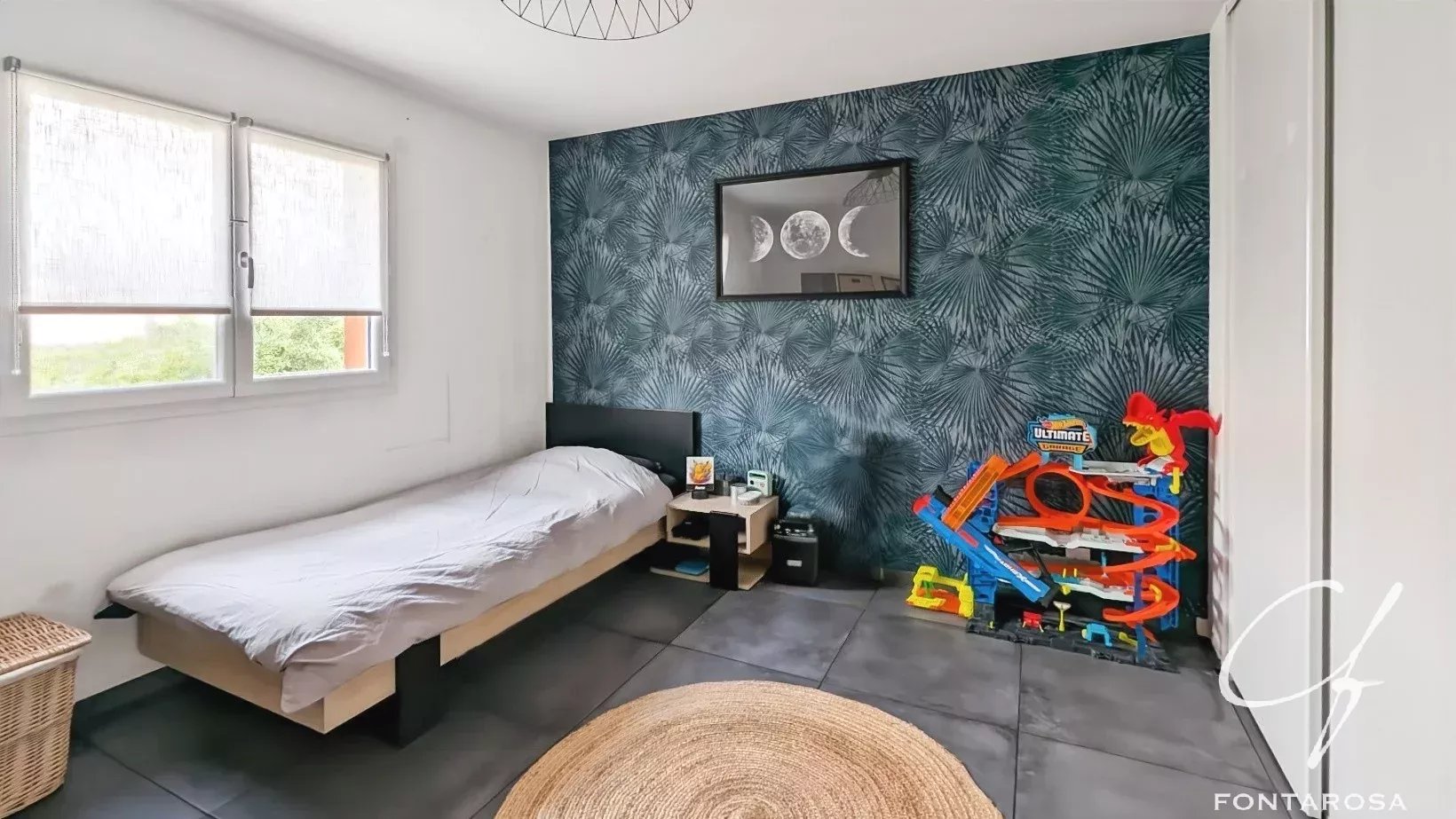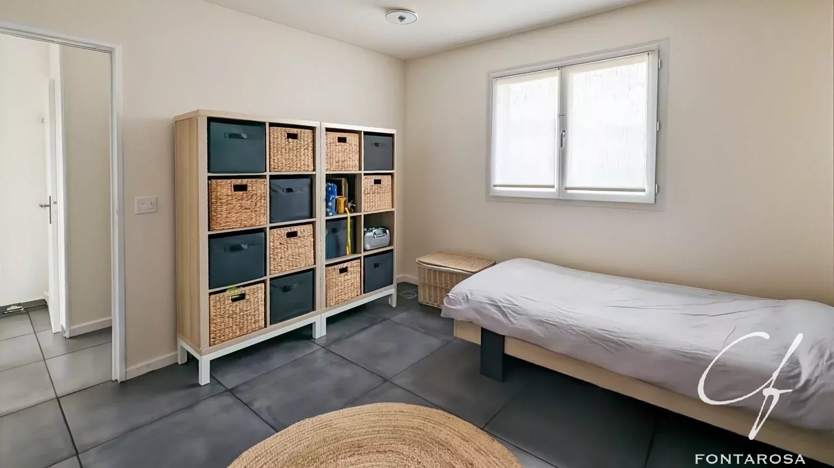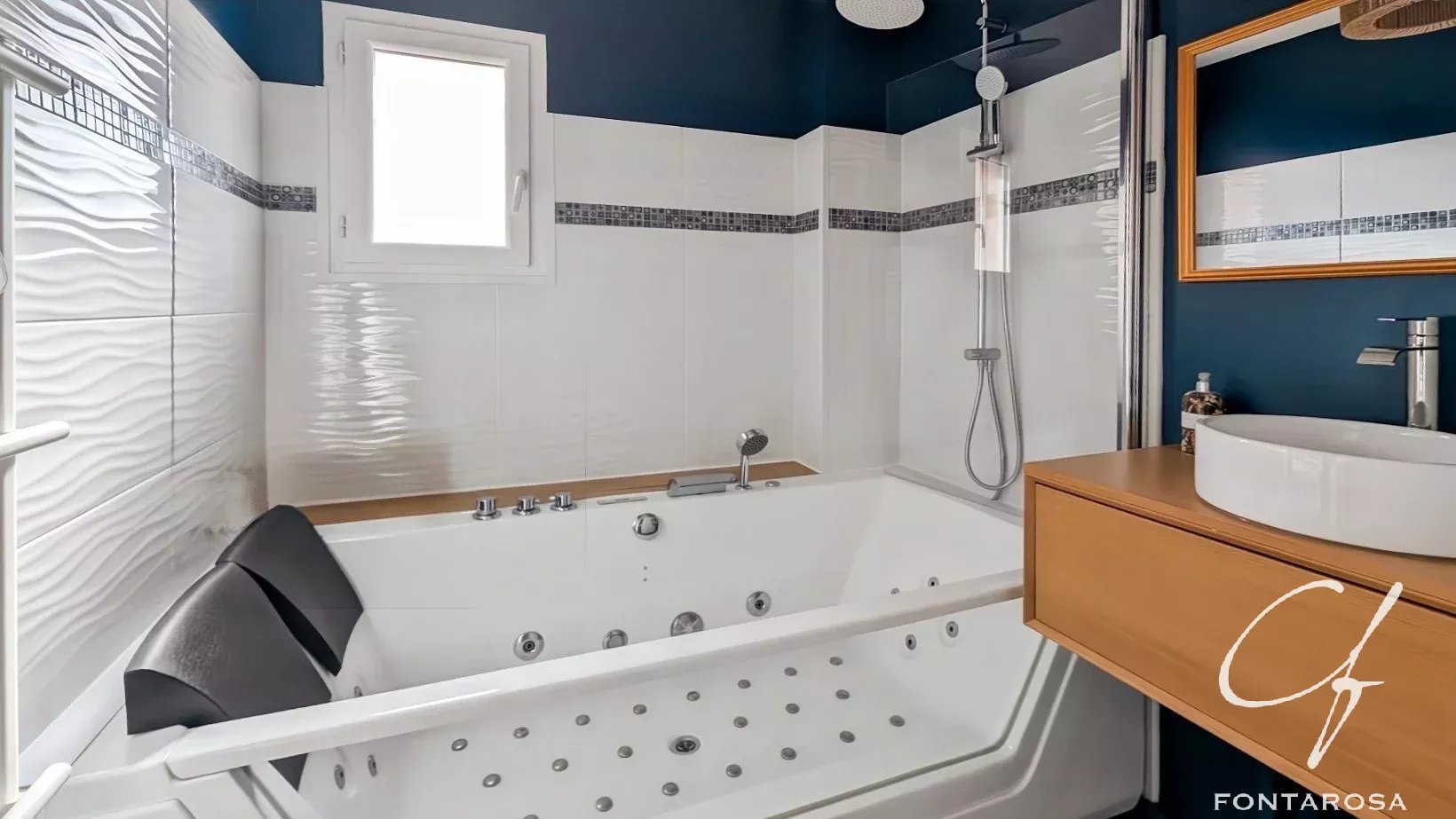 À l’étage, l’espace nuit se complète avec deux chambres supplémentaires et une salle de bain équipée d’une baignoire balnéo, apportant confort et bien-être au quotidien.