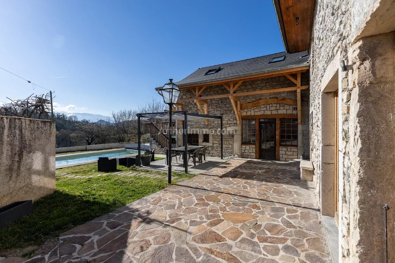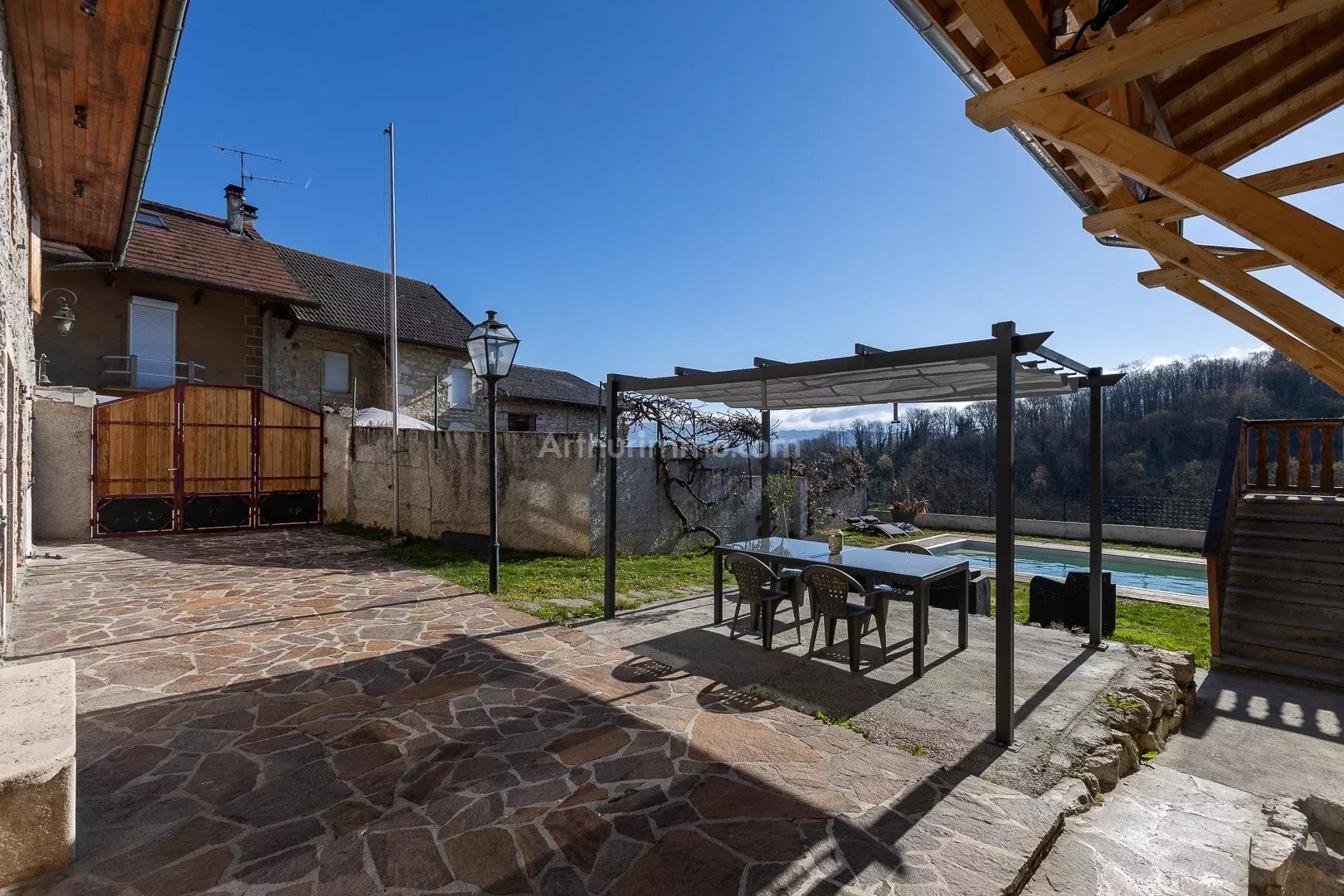Dans un environnement privilégié à Marignieu, à 30 minutes du lac du Bourget et des principaux axes entre Belley et Culoz, découvrez cette superbe bâtisse en pierre pleine de charme. La propriété développe 220 m² habitables (loi Carrez) et environ 428 m² de surface totale au sol incluant les annexes et offrant de nombreuses possibilités : grande maison familiale, activité touristique, gîte, chambres d’hôtes ou projet professionnel. 1 - La maison principale: Dès l’entrée, le charme de la pierre donne le ton. Au rez-de-chaussée : Une cuisine, une salle à manger conviviale, un salon chaleureux, un dégagement, une salle d’eau, des toilettes, un sauna, ainsi qu’une chaufferie/buanderie. Un vaste garage et un atelier complètent cet espace fonctionnel. Au 1er étage : Trois belles chambres dont une avec dressing, une salle de bain avec toilettes, un second dressing et des dégagements. Au 2e étage : Une mezzanine, un bureau, une chambre avec sa salle d’eau et ses toilettes, ainsi qu’un local technique non bruyant (VMC). Un espace supplémentaire de 58,5 m² reste à aménager, laissant libre cours à vos projets (suite parentale, appartement, espace bien-être, bureau, atelier…). 2 - Appartement indépendant : La propriété dispose également d’un appartement indépendant, idéal pour location saisonnière, gîte ou logement pour recevoir famille et amis en toute autonomie. Il comprend : Une salle de jeux actuellement, pouvant être transformée en pièce de vie Une chambre de 17,46 m² Une salle d’eau à terminer Des toilettes séparées déjà finalisées À l’étage, une mezzanine de 6,61 m² (19,04 m² au sol) complète cet espace. 3 - Espaces annexes et extérieurs : La propriété bénéficie également de plusieurs espaces annexes, dont caves et zones de stockage offrant un volume supplémentaire appréciable. 4 - À l’extérieur, vous profiterez d’une piscine et d’une vue dégagée, dans un environnement calme et agréable. Un bien rare, plein de charme et de possibilités, à découvrir sans tarder. Assainissement collectif Taxe foncière : 1 446€ Chauffage : chaudière à pellets avec silo de 4 tonnes, permettant une alimentation automatique de la chaudière sans aucune manutention. Cheminée avec insert. DPE: C Réf : 7221 Prix : 450 000€ Honoraires charge vendeur Visite virtuelle et vidéo sur notre site ou sur demande Les informations sur les risques auxquels ce bien est exposé sont disponibles sur le site Géorisques : georisques.gouv.fr Contact: Magalie Arthurimmo Belley, Morestel, Montalieu