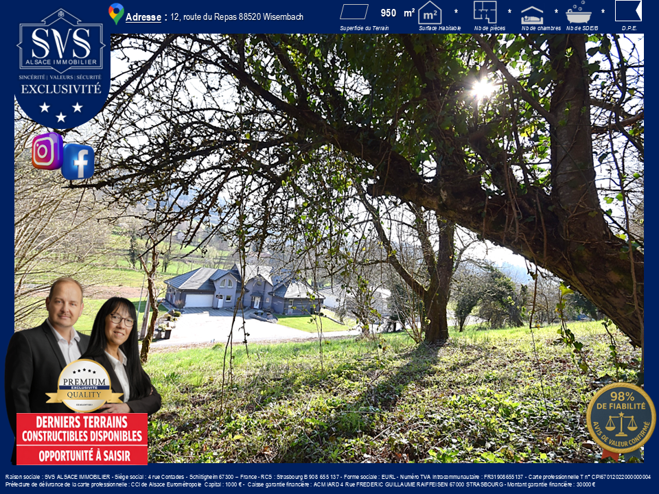 Raison sociale : SVS ALSACE IMMOBILIER - Siège social : 4 rue Contades - Schiltigheim 67300 France Antennes à Châtenois, Geudertheim, Val d'Argent, Val de Villé, Vosges, Mulhouse (Illzach), Colmar - RCS : Strasbourg B 908 655 137 - Forme sociale : EURL - Numéro TVA Intracommunautaire : FR31908655137 - Carte professionnelle T no CPI67012022000000004 Préfecture de délivrance de la carte professionnelle : CCI de Alsace Eurométropole Capital : 1000 EUR - Caisse garantie financière : ACM IARD 4 Rue FREDERIC GUILLAUME RAIFFEISEN 67000 STRASBOURG - Montant garantie financière : 30000 EUR
