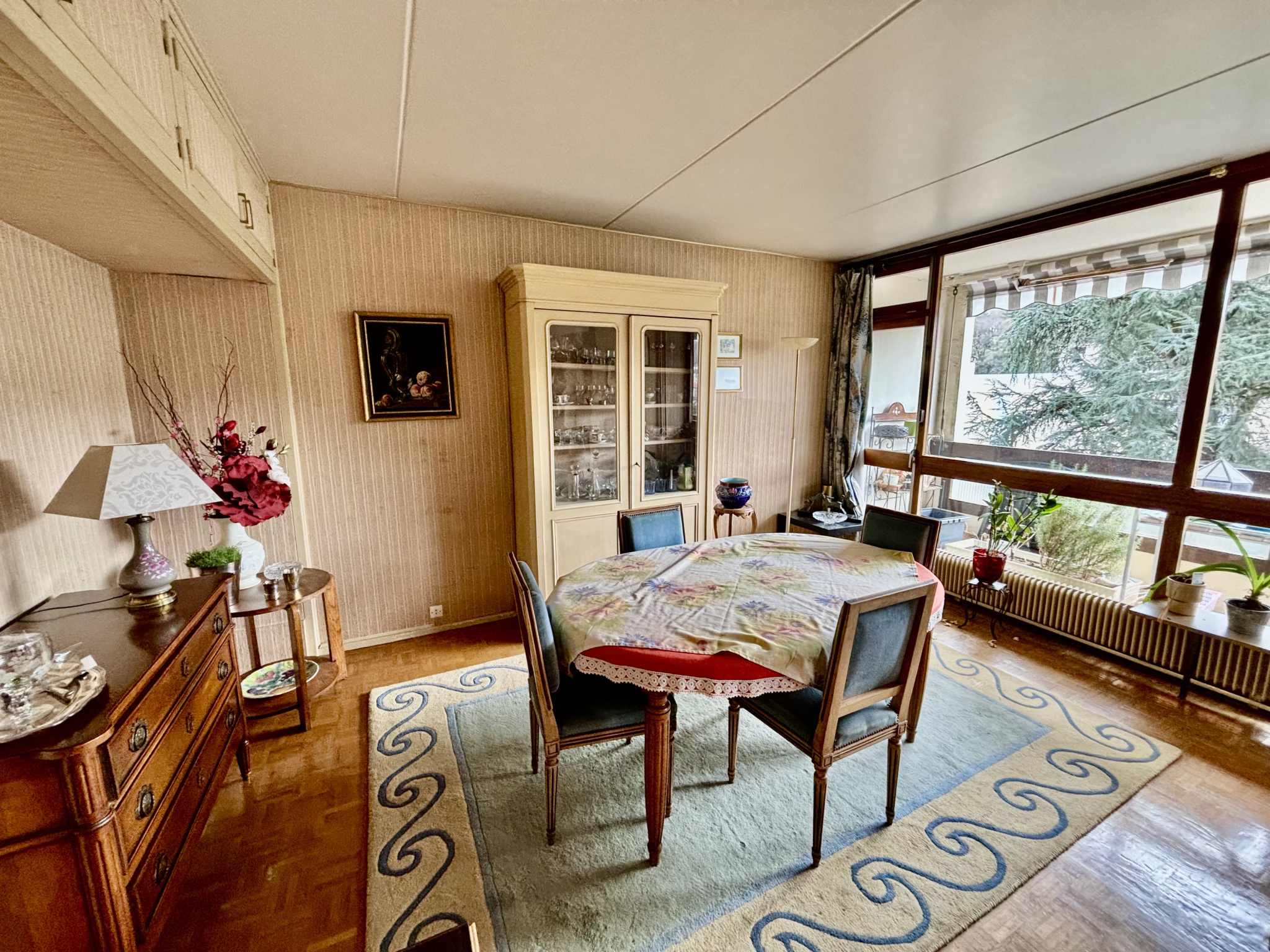 Appartement traversant de 107 m2 composé d'un lumineux salon, une salle à manger donnant sur un balcon exposé plein Sud et une cuisine.