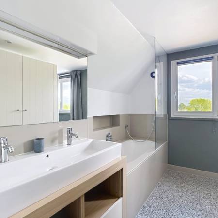 La maison principale séduit par ses volumes et son authenticité. Elle propose un beau séjour lumineux avec cheminée et poutres apparentes, une cuisine entièrement équipée, ainsi que cinq chambres, chacune disposant de sa salle d'eau privative avec douche et toilettes, garantissant confort et indépendance.