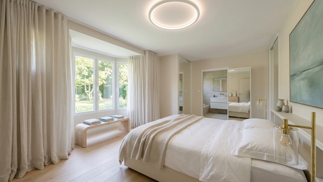 L'aile de repos (plage de vie de plain-pied) : Deux suites parentales magistrales avec bow-windows ouvrant sur la piscine. Chacune dispose de son double dressing et de sa salle d'eau/bains privative. Un bureau (ou chambre) complète ce niveau.