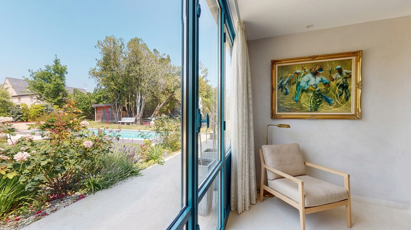 Nichée en retrait de la rue, à l'abri des regards sur un terrain paysagé de 1 500 m², cette propriété est une véritable ode à la lumière et à l'art de vivre breton.