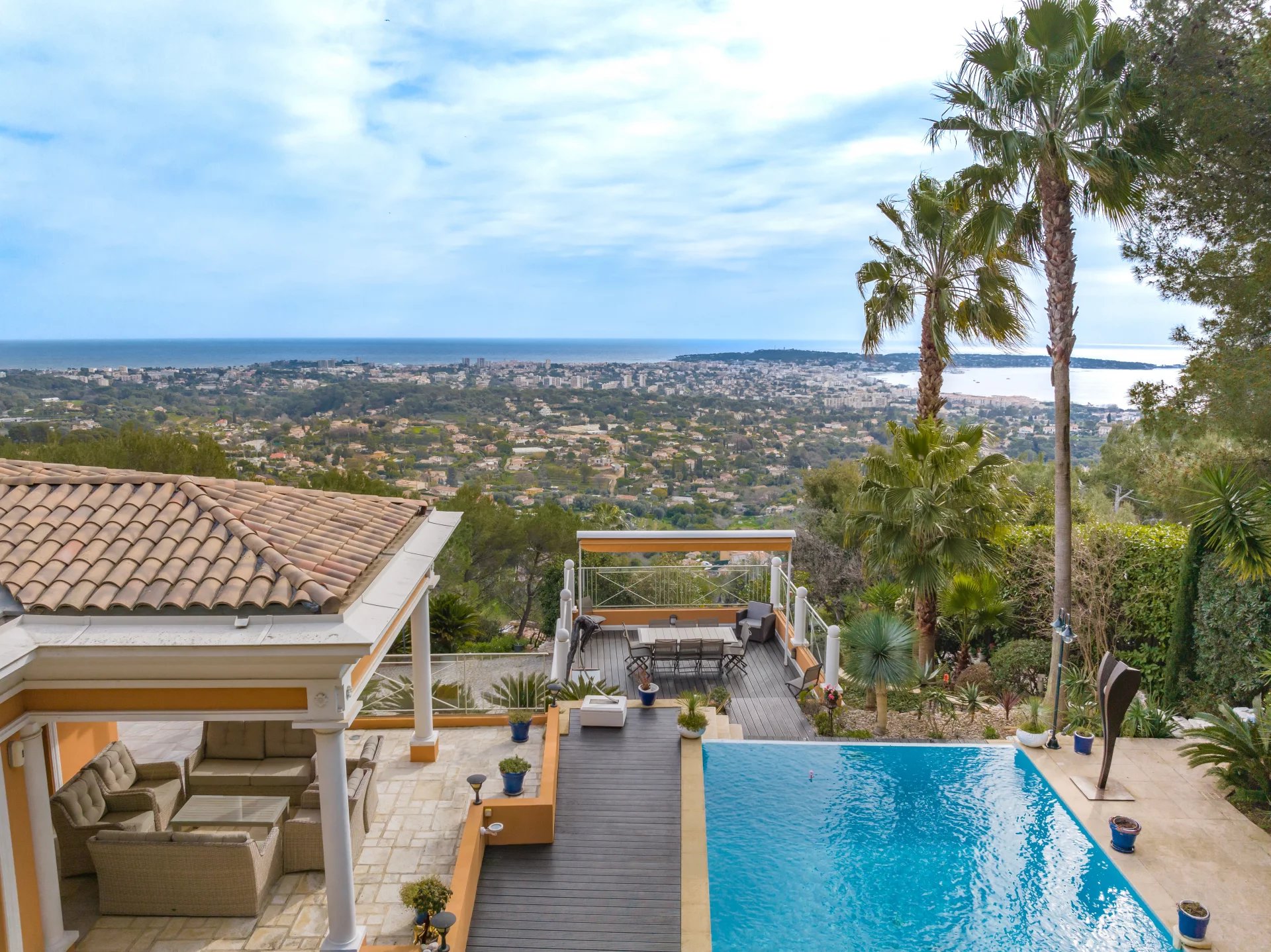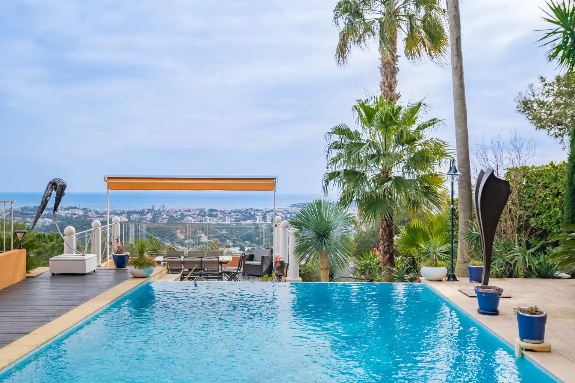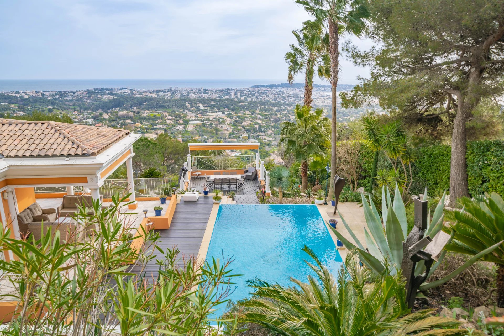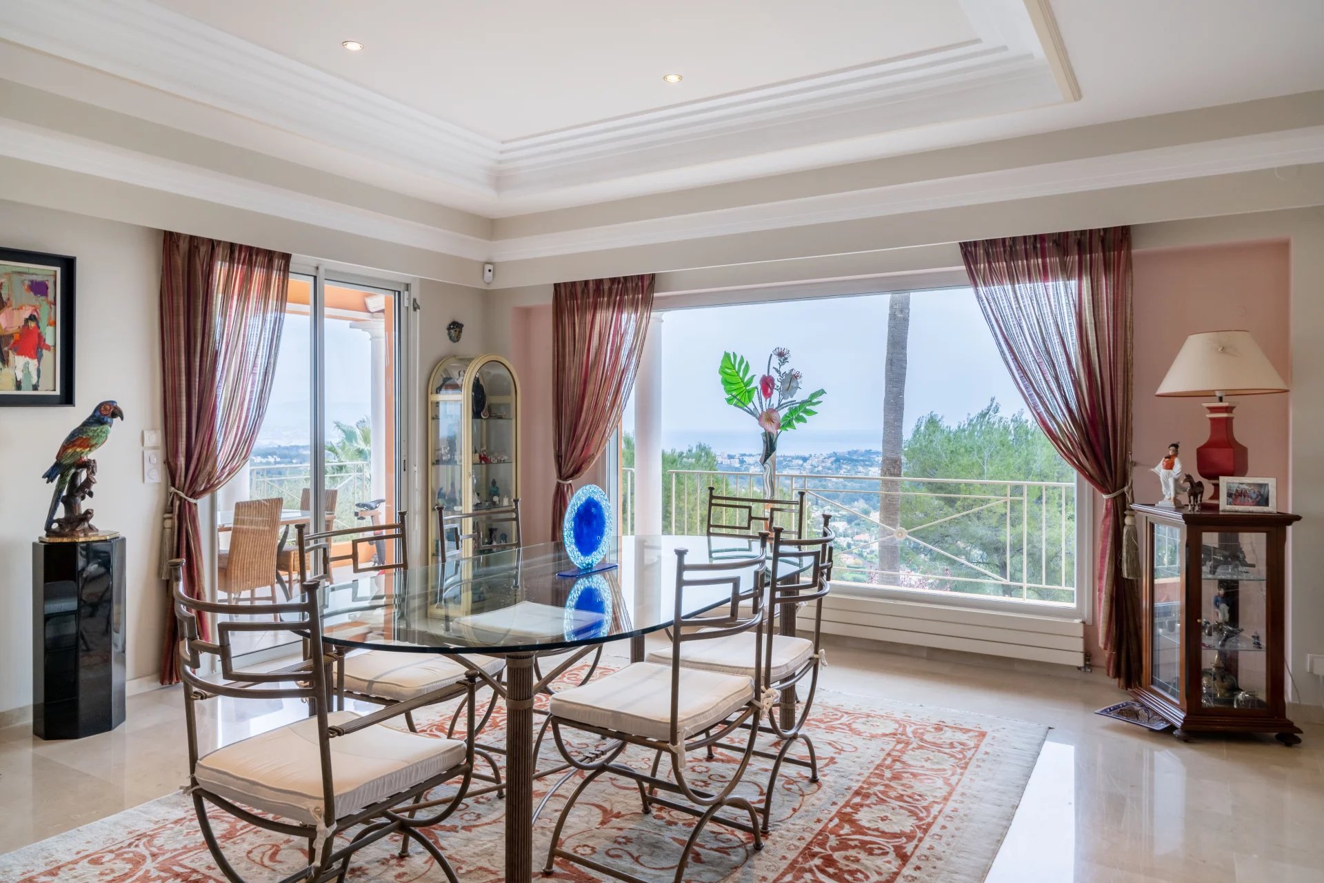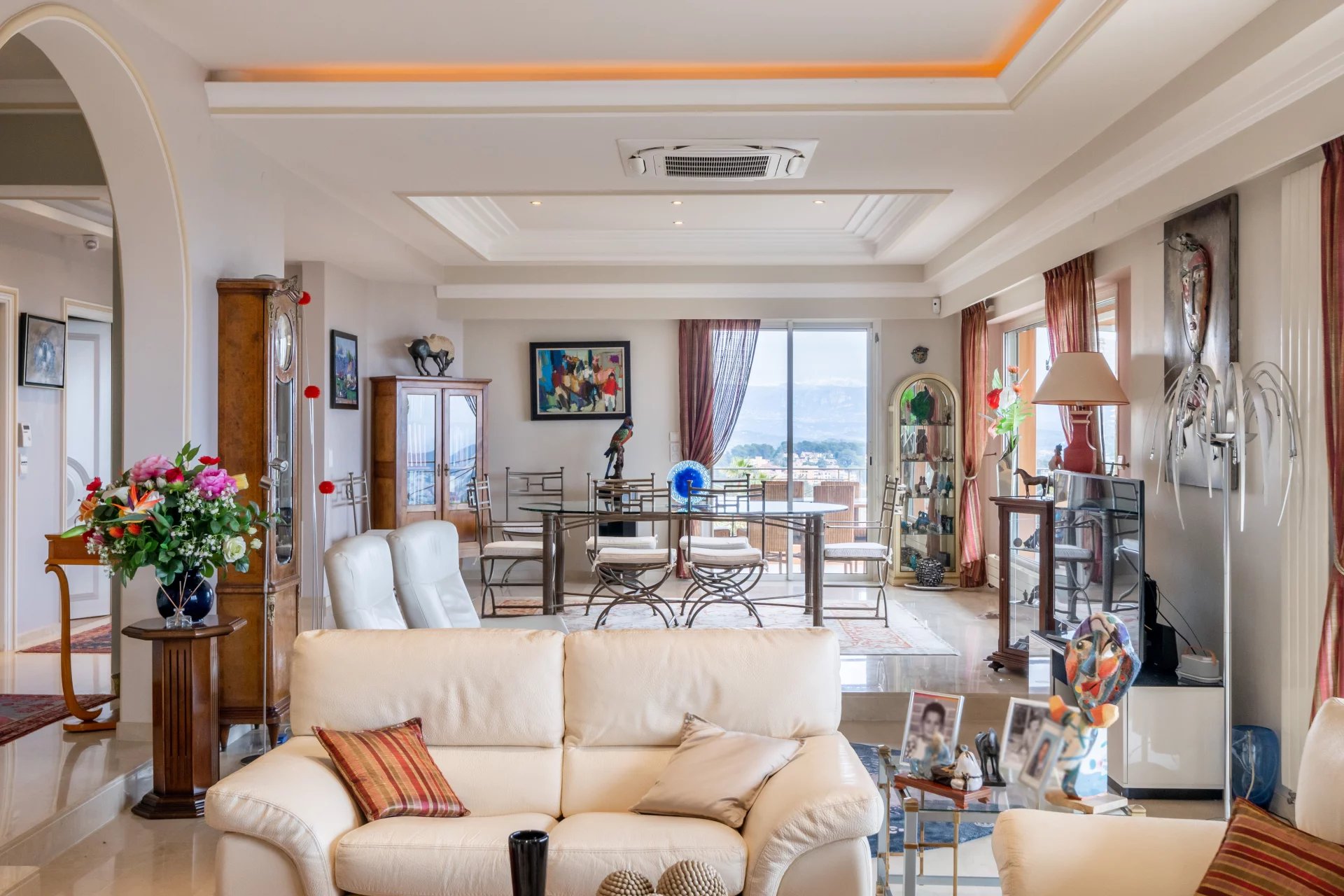 Située à Vallauris, cette élégante villa d’environ 345 m² habitables, complétée par 93 m² de surfaces annexes, s’implante sur un terrain paysager de 2 200 m², offrant une vue panoramique exceptionnelle sur la mer, les îles et les montagnes du Mercantour. La propriété se distingue par ses volumes généreux et sa luminosité, avec une vaste salle de réception, un grand salon / salle à manger, une cuisine indépendante entièrement équipée ainsi qu’un bureau. L’espace nuit comprend quatre chambres, dont une suite parentale avec dressing et salle de bains, complétées par plusieurs salles d’eau. Chaque chambre bénéficie d’une douche balnéo, apportant un confort supplémentaire. Un appartement indépendant de deux pièces vient enrichir l’ensemble, idéal pour accueillir des invités ou du personnel. Prestations • Ascenseur • Piscine à débordement • Pool house entièrement équipé • Climatisation réversible individuelle • Chauffage individuel par chaudière gaz • Production d’eau chaude par chaudière gaz et panneaux solaires • Assainissement par fosse septique • Absence de cheminée ⸻ Informations complémentaires Cette propriété rare conjugue confort, fonctionnalité et cadre de vie d’exception sur la Côte d’Azur. ⸻ Conditions de vente Le bien est vendu occupé, les occupants bénéficiant d’un droit d’usage et d’habitation viager attaché à leur personne, lequel s’éteindra automatiquement à leur décès. L’acquéreur se porte ainsi acquéreur de la nue-propriété et disposera de la pleine jouissance du bien à l’extinction de ce droit, sans indemnité ni formalité complémentaire.