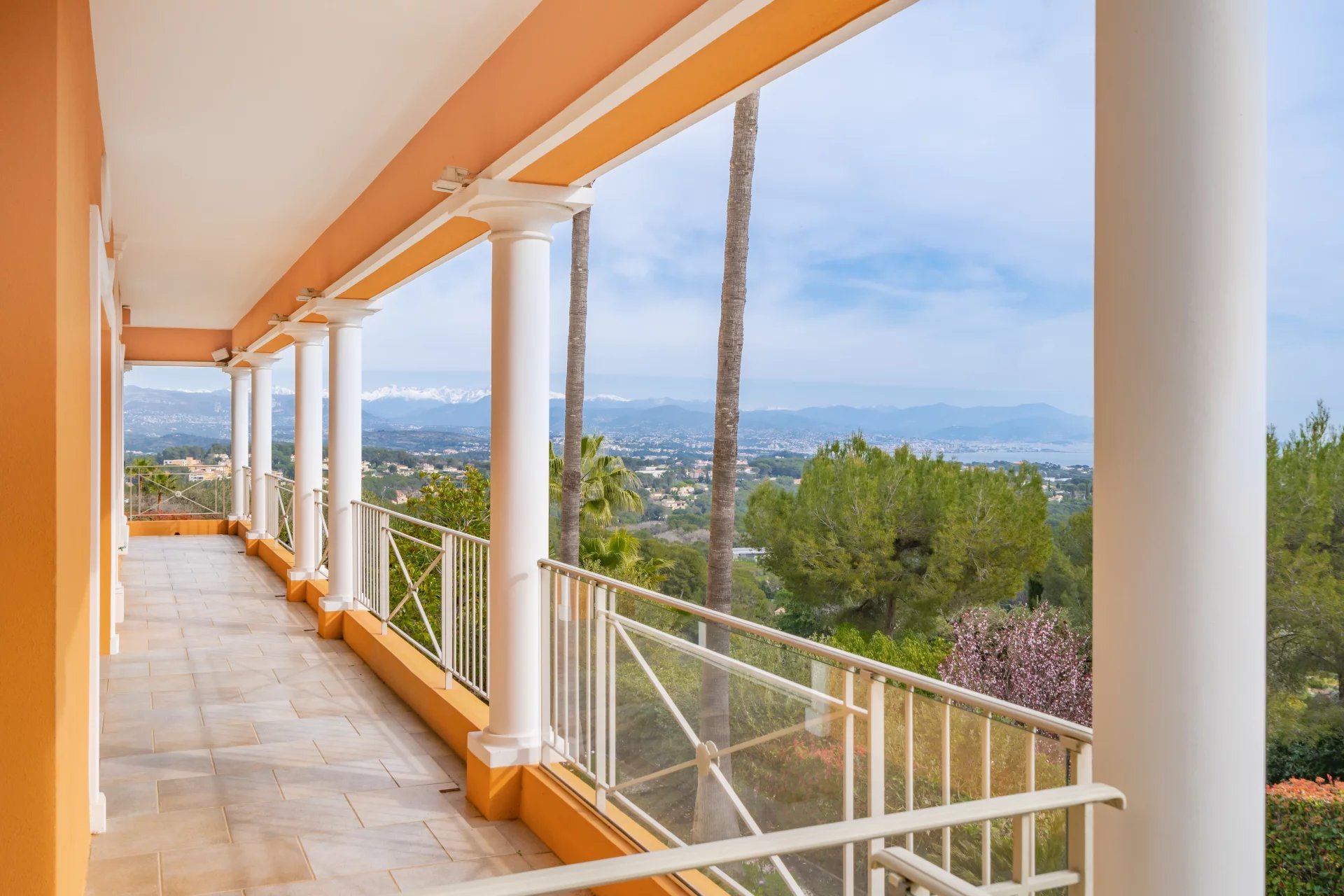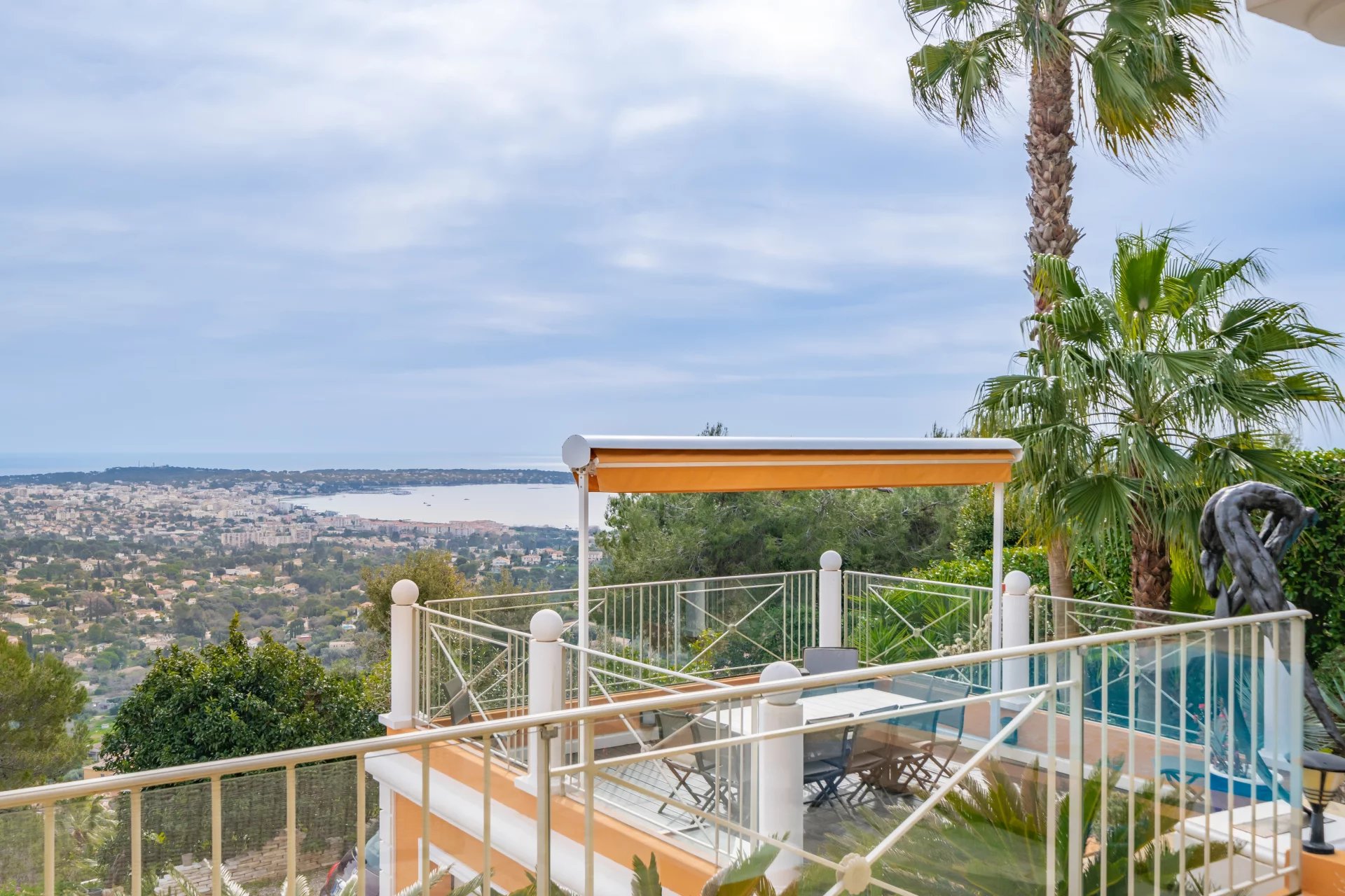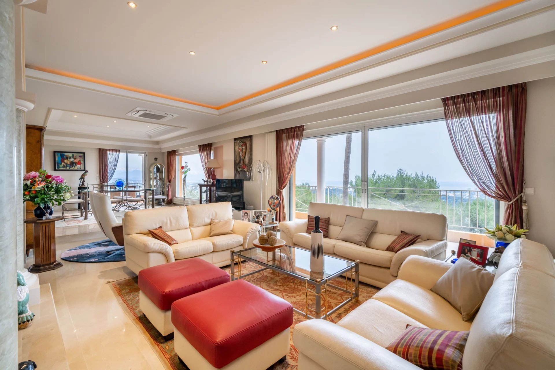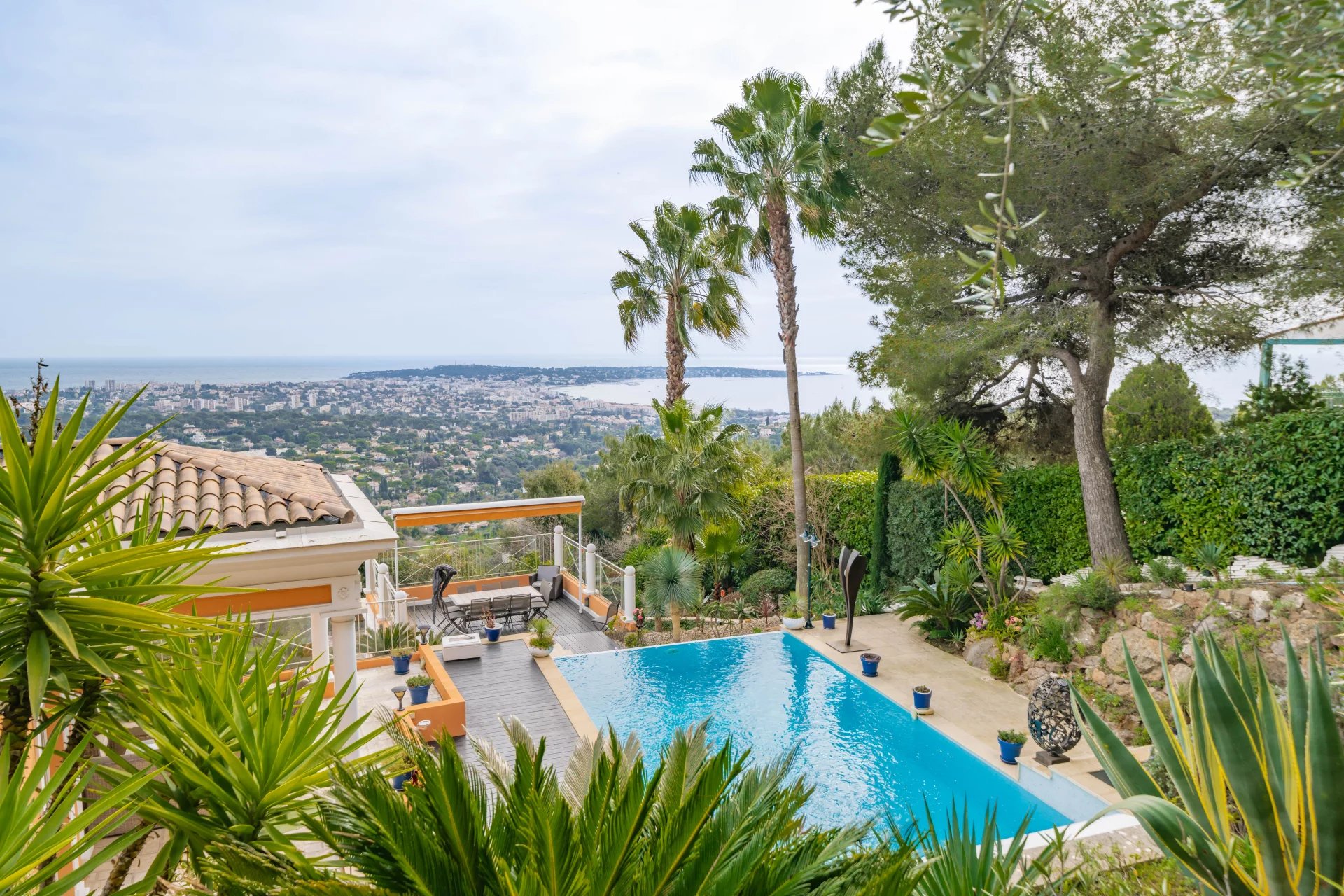 Située à Vallauris, cette élégante villa d’environ 345 m² habitables, complétée par 93 m² de surfaces annexes, s’implante sur un terrain paysager de 2 200 m², offrant une vue panoramique exceptionnelle sur la mer, les îles et les montagnes du Mercantour. La propriété se distingue par ses volumes généreux et sa luminosité, avec une vaste salle de réception, un grand salon / salle à manger, une cuisine indépendante entièrement équipée ainsi qu’un bureau. L’espace nuit comprend quatre chambres, dont une suite parentale avec dressing et salle de bains, complétées par plusieurs salles d’eau. Chaque chambre bénéficie d’une douche balnéo, apportant un confort supplémentaire. Un appartement indépendant de deux pièces vient enrichir l’ensemble, idéal pour accueillir des invités ou du personnel. Prestations • Ascenseur • Piscine à débordement • Pool house entièrement équipé • Climatisation réversible individuelle • Chauffage individuel par chaudière gaz • Production d’eau chaude par chaudière gaz et panneaux solaires • Assainissement par fosse septique • Absence de cheminée ⸻ Informations complémentaires Cette propriété rare conjugue confort, fonctionnalité et cadre de vie d’exception sur la Côte d’Azur. ⸻ Conditions de vente Le bien est vendu occupé, les occupants bénéficiant d’un droit d’usage et d’habitation viager attaché à leur personne, lequel s’éteindra automatiquement à leur décès. L’acquéreur se porte ainsi acquéreur de la nue-propriété et disposera de la pleine jouissance du bien à l’extinction de ce droit, sans indemnité ni formalité complémentaire.