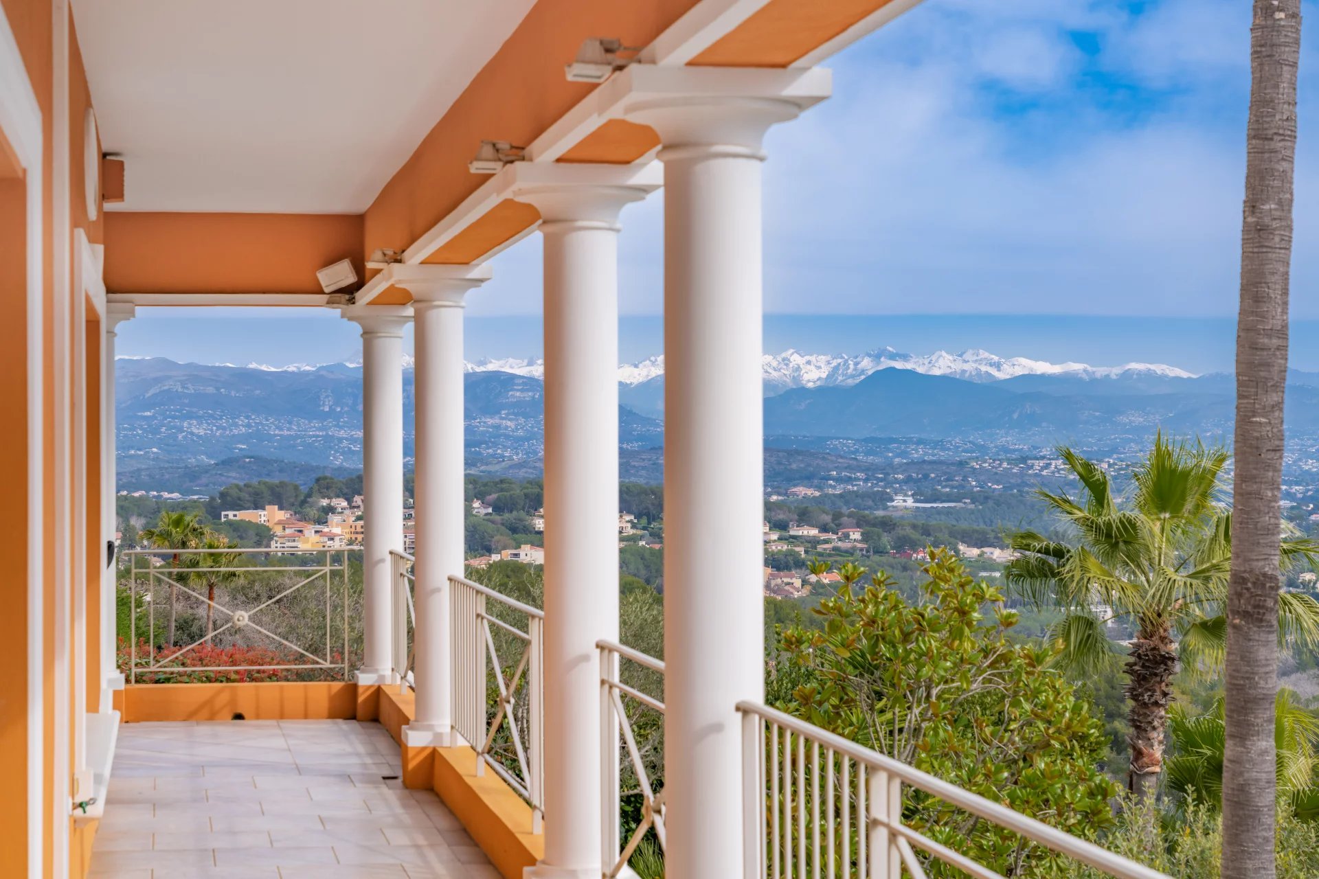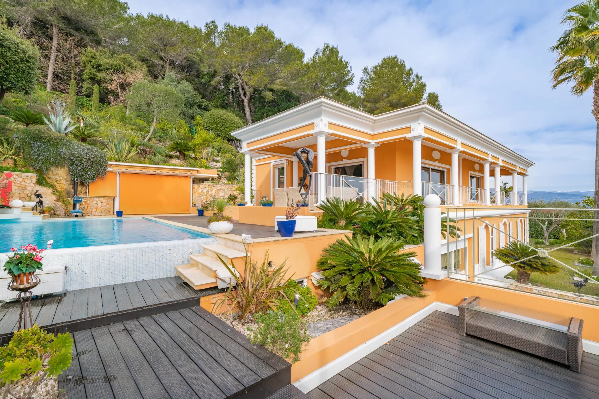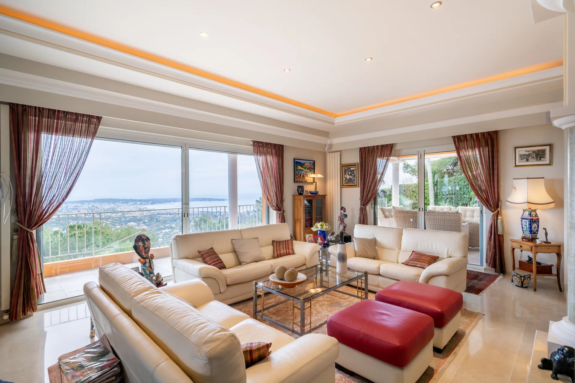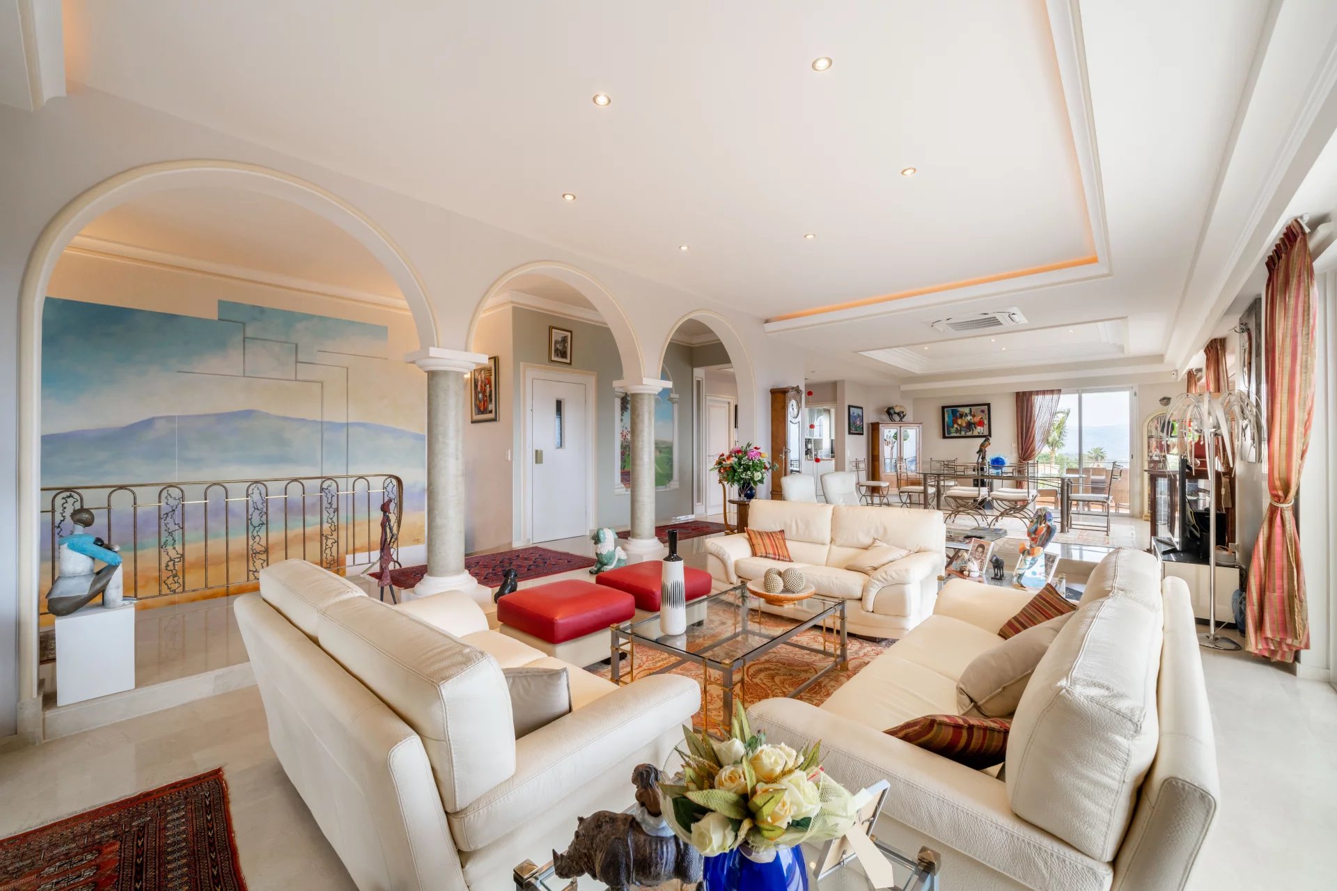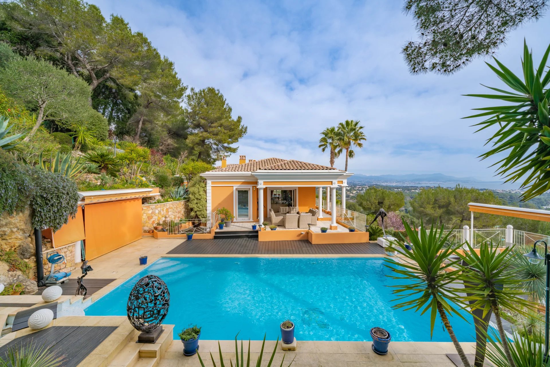Située à Vallauris, cette élégante villa d’environ 345 m² habitables, complétée par 93 m² de surfaces annexes, s’implante sur un terrain paysager de 2 200 m², offrant une vue panoramique exceptionnelle sur la mer, les îles et les montagnes du Mercantour. La propriété se distingue par ses volumes généreux et sa luminosité, avec une vaste salle de réception, un grand salon / salle à manger, une cuisine indépendante entièrement équipée ainsi qu’un bureau. L’espace nuit comprend quatre chambres, dont une suite parentale avec dressing et salle de bains, complétées par plusieurs salles d’eau. Chaque chambre bénéficie d’une douche balnéo, apportant un confort supplémentaire. Un appartement indépendant de deux pièces vient enrichir l’ensemble, idéal pour accueillir des invités ou du personnel. Prestations • Ascenseur • Piscine à débordement • Pool house entièrement équipé • Climatisation réversible individuelle • Chauffage individuel par chaudière gaz • Production d’eau chaude par chaudière gaz et panneaux solaires • Assainissement par fosse septique • Absence de cheminée ⸻ Informations complémentaires Cette propriété rare conjugue confort, fonctionnalité et cadre de vie d’exception sur la Côte d’Azur. ⸻ Conditions de vente Le bien est vendu occupé, les occupants bénéficiant d’un droit d’usage et d’habitation viager attaché à leur personne, lequel s’éteindra automatiquement à leur décès. L’acquéreur se porte ainsi acquéreur de la nue-propriété et disposera de la pleine jouissance du bien à l’extinction de ce droit, sans indemnité ni formalité complémentaire.
