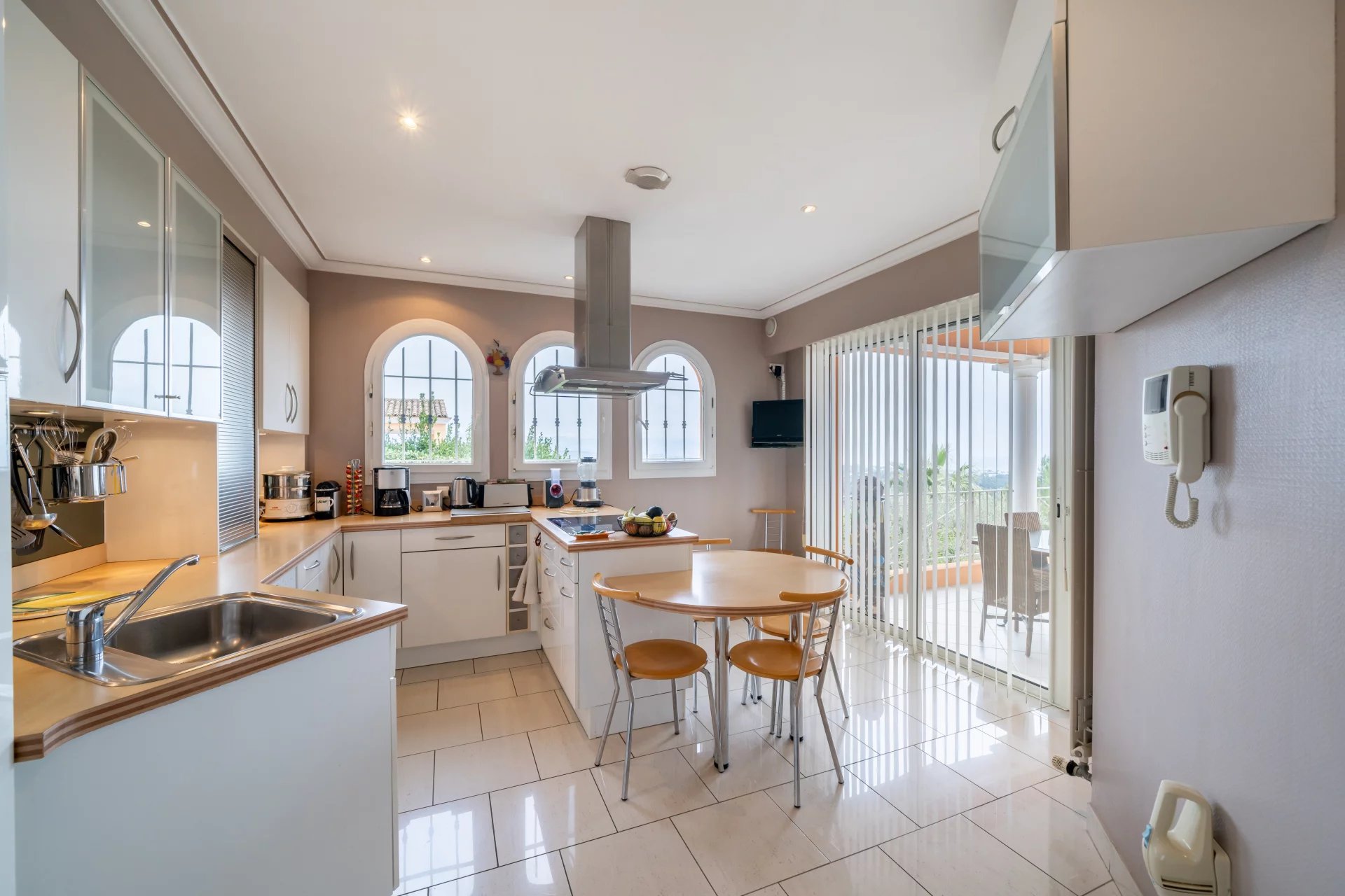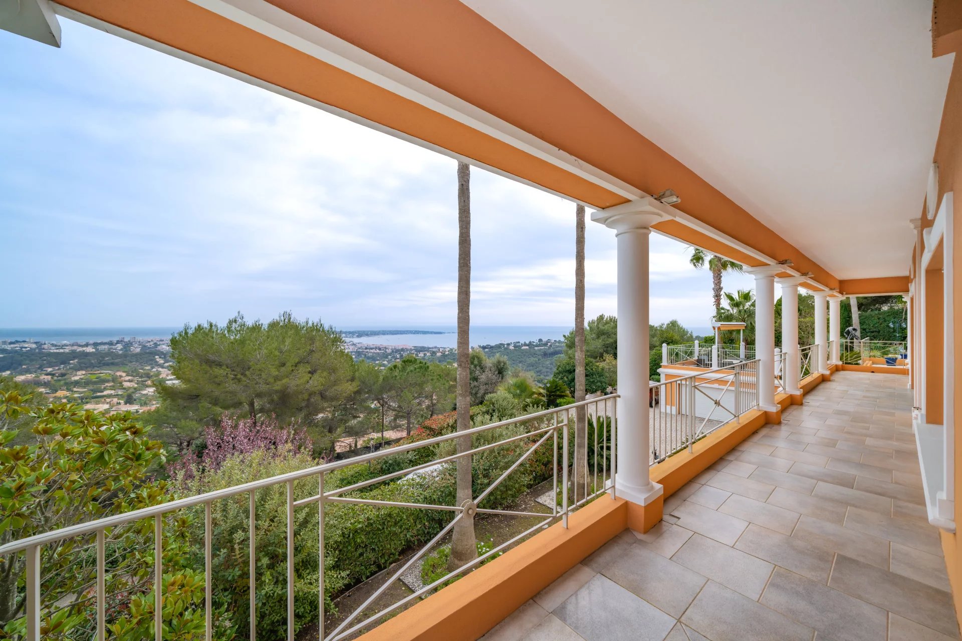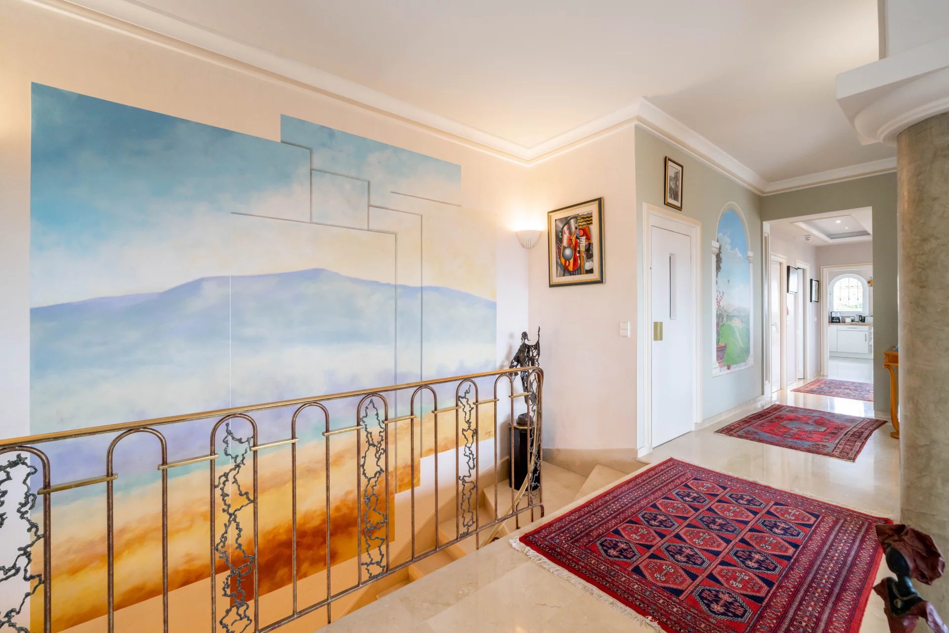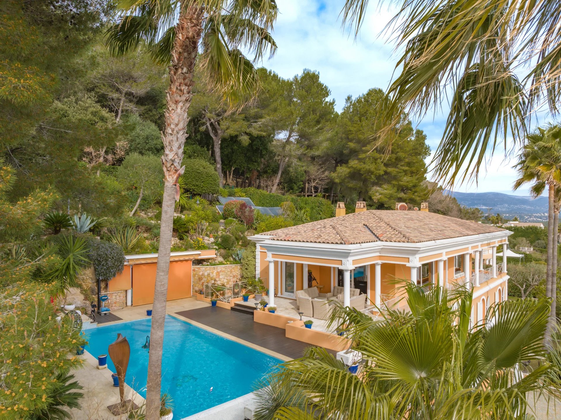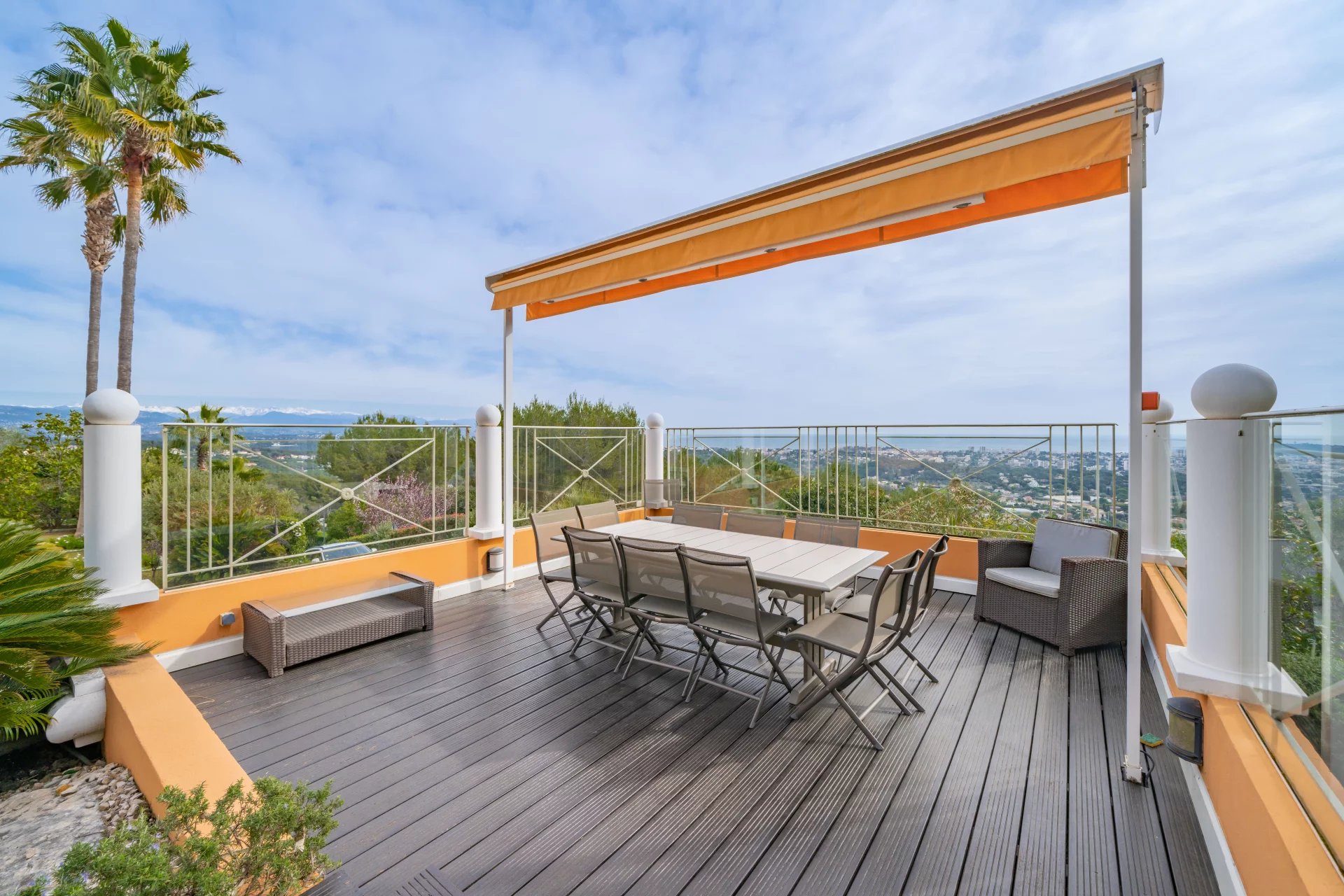 Située à Vallauris, cette élégante villa d’environ 345 m² habitables, complétée par 93 m² de surfaces annexes, s’implante sur un terrain paysager de 2 200 m², offrant une vue panoramique exceptionnelle sur la mer, les îles et les montagnes du Mercantour. La propriété se distingue par ses volumes généreux et sa luminosité, avec une vaste salle de réception, un grand salon / salle à manger, une cuisine indépendante entièrement équipée ainsi qu’un bureau. L’espace nuit comprend quatre chambres, dont une suite parentale avec dressing et salle de bains, complétées par plusieurs salles d’eau. Chaque chambre bénéficie d’une douche balnéo, apportant un confort supplémentaire. Un appartement indépendant de deux pièces vient enrichir l’ensemble, idéal pour accueillir des invités ou du personnel. Prestations • Ascenseur • Piscine à débordement • Pool house entièrement équipé • Climatisation réversible individuelle • Chauffage individuel par chaudière gaz • Production d’eau chaude par chaudière gaz et panneaux solaires • Assainissement par fosse septique • Absence de cheminée ⸻ Informations complémentaires Cette propriété rare conjugue confort, fonctionnalité et cadre de vie d’exception sur la Côte d’Azur. ⸻ Conditions de vente Le bien est vendu occupé, les occupants bénéficiant d’un droit d’usage et d’habitation viager attaché à leur personne, lequel s’éteindra automatiquement à leur décès. L’acquéreur se porte ainsi acquéreur de la nue-propriété et disposera de la pleine jouissance du bien à l’extinction de ce droit, sans indemnité ni formalité complémentaire.