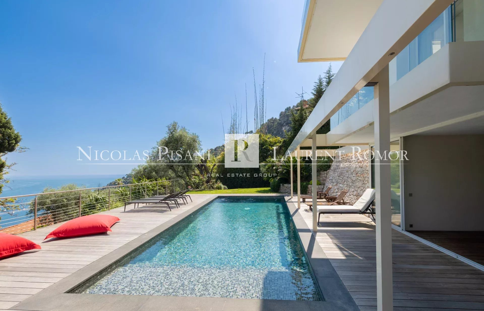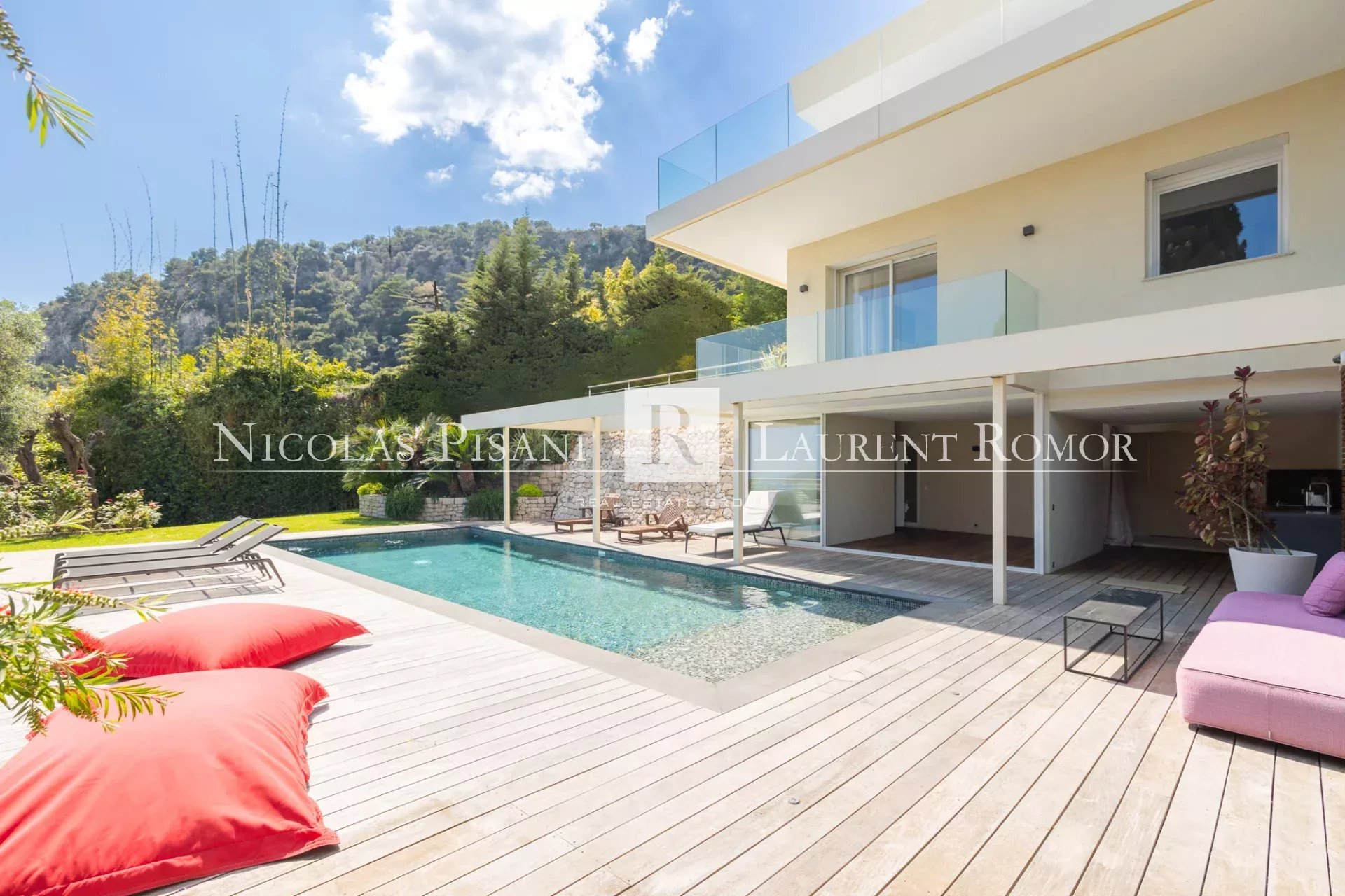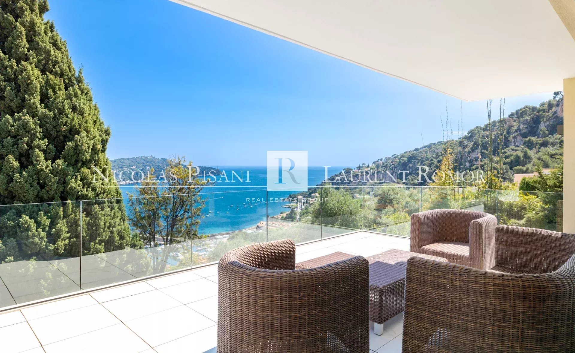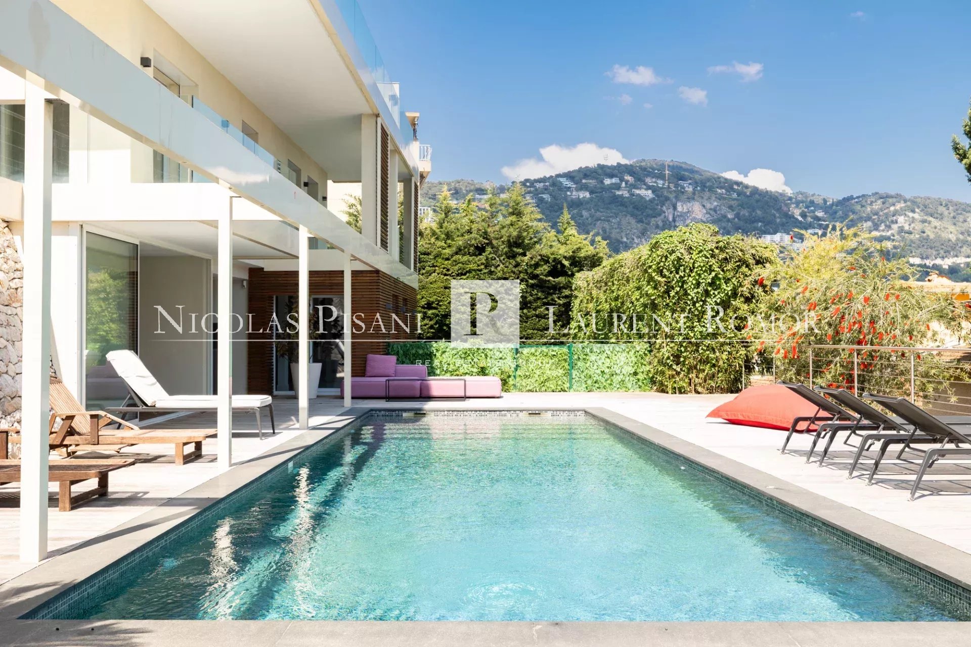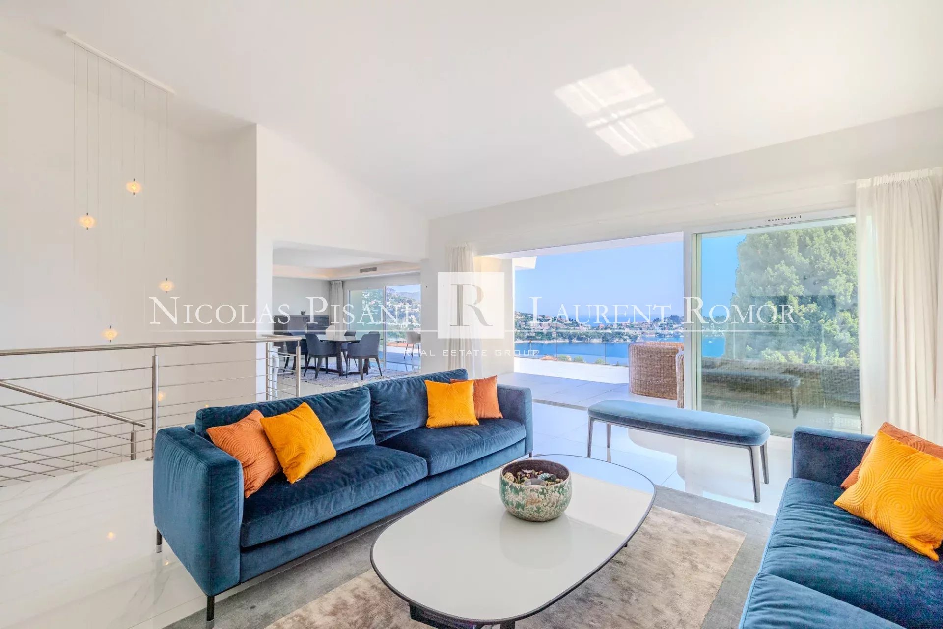 Villa d'exception édifiée sur un terrain arboré de 1200m², au calme absolu. Idéalement située, entre la basse et la moyenne corniche, la propriété, d'une superficie totale de 351m² et de 294m² habitables, a été rénovée en 2021 avec des prestations haut de gamme et raffinées. La villa comprend, un hall d'entrée, un vaste séjour - salle à manger, une cuisine ouverte entièrement équipée et aménagée. Le tout formant une pièce de vie de 96m² ouvrant sur une belle terrasse qui surplombe la rade de Villefranche et le Cap Ferrat et offre une vue panoramique époustouflante. A l'étage inférieur, vous trouverez une chambre de maître avec salle de bain, wc et dressing, 3 autres chambres en suite avec salles d'eau et wc privatifs. Enfin, en rez-de-jardin, une salle de sport ouvrant sur la terrasse et la piscine chauffée et pouvant être aménagée en appartement indépendant. Cette villa bénéficie de prestations luxueuses telles qu'une magnifique cave à vin, un bel espace piscine avec sa cuisine d'été, des dressings, un ascenseur desservant tous les étages, un vaste garage de 33m² avec accès direct à la villa et plusieurs places de parkings extérieurs. Honoraires à la charge du vendeur