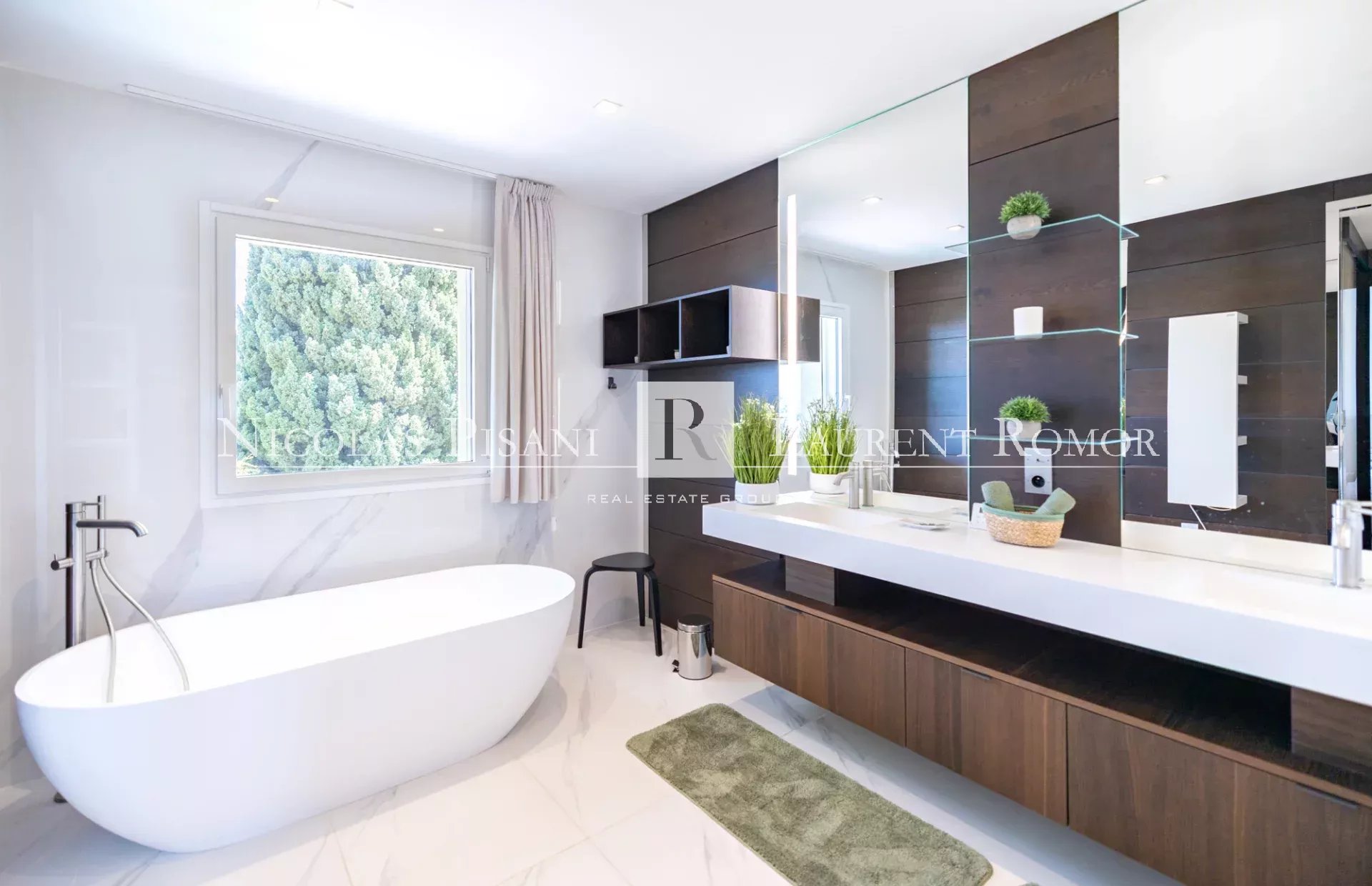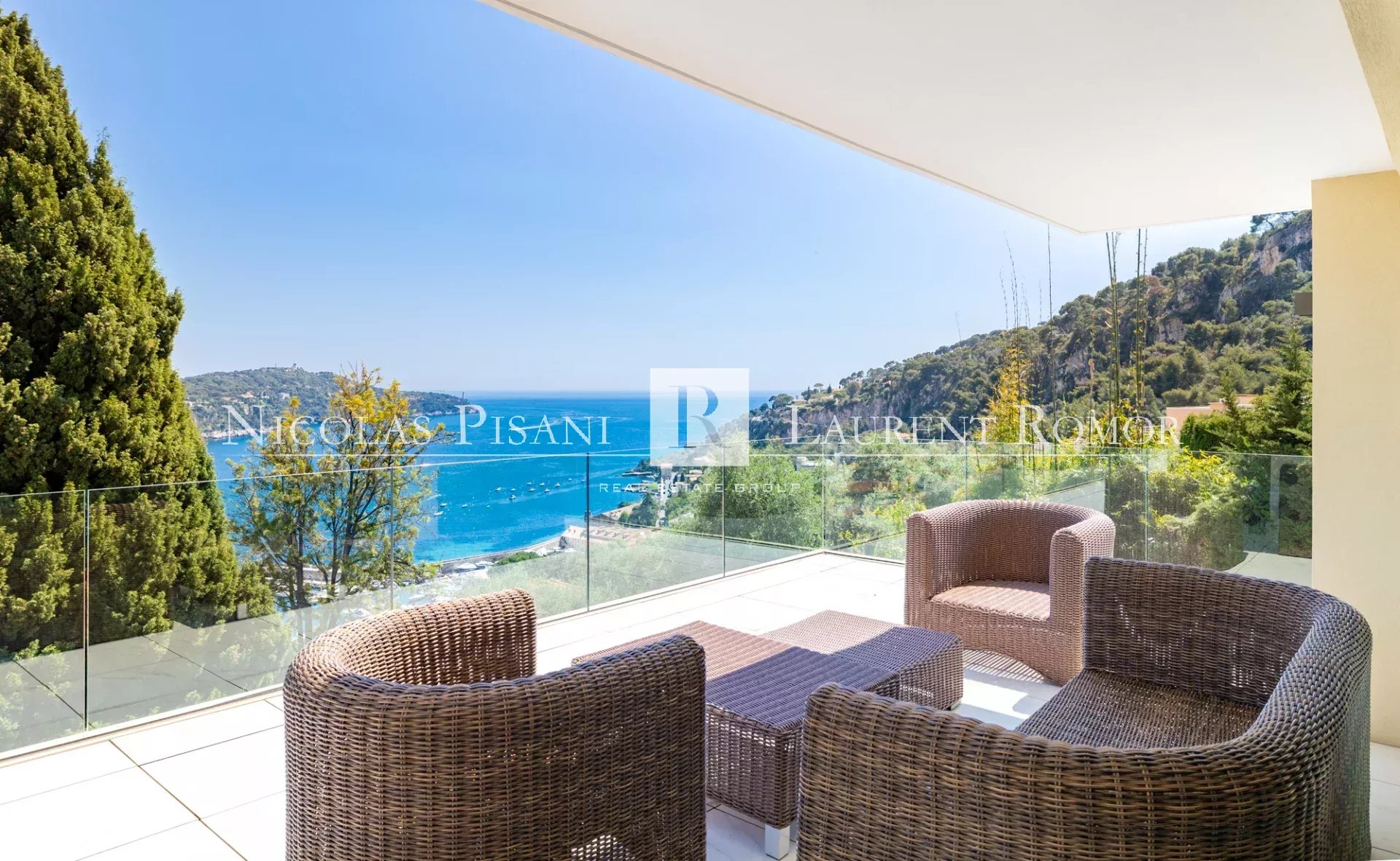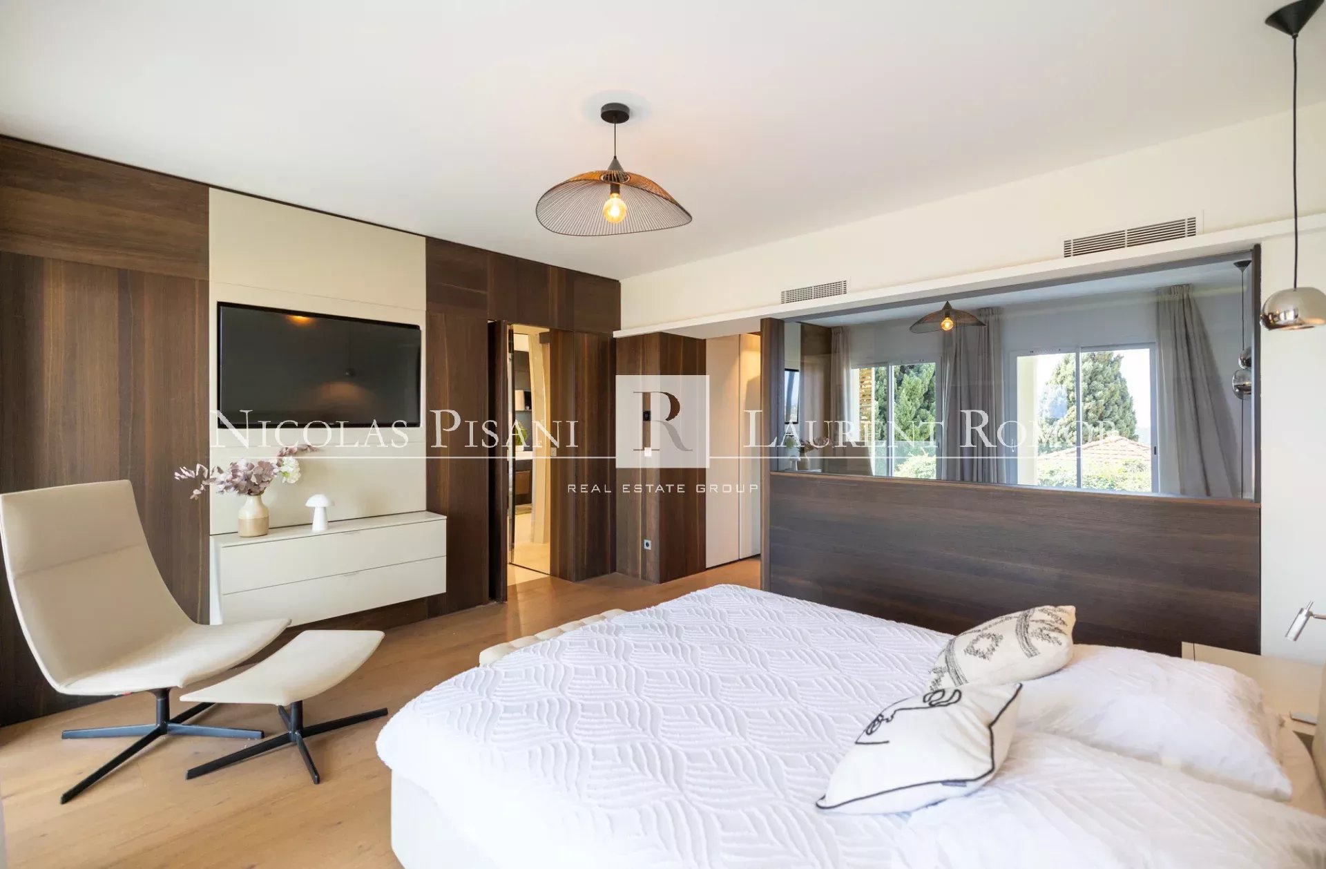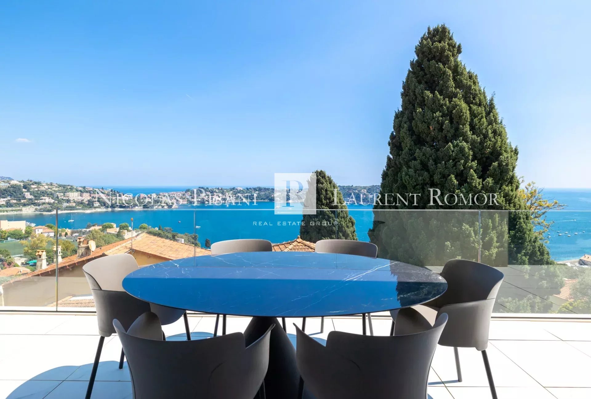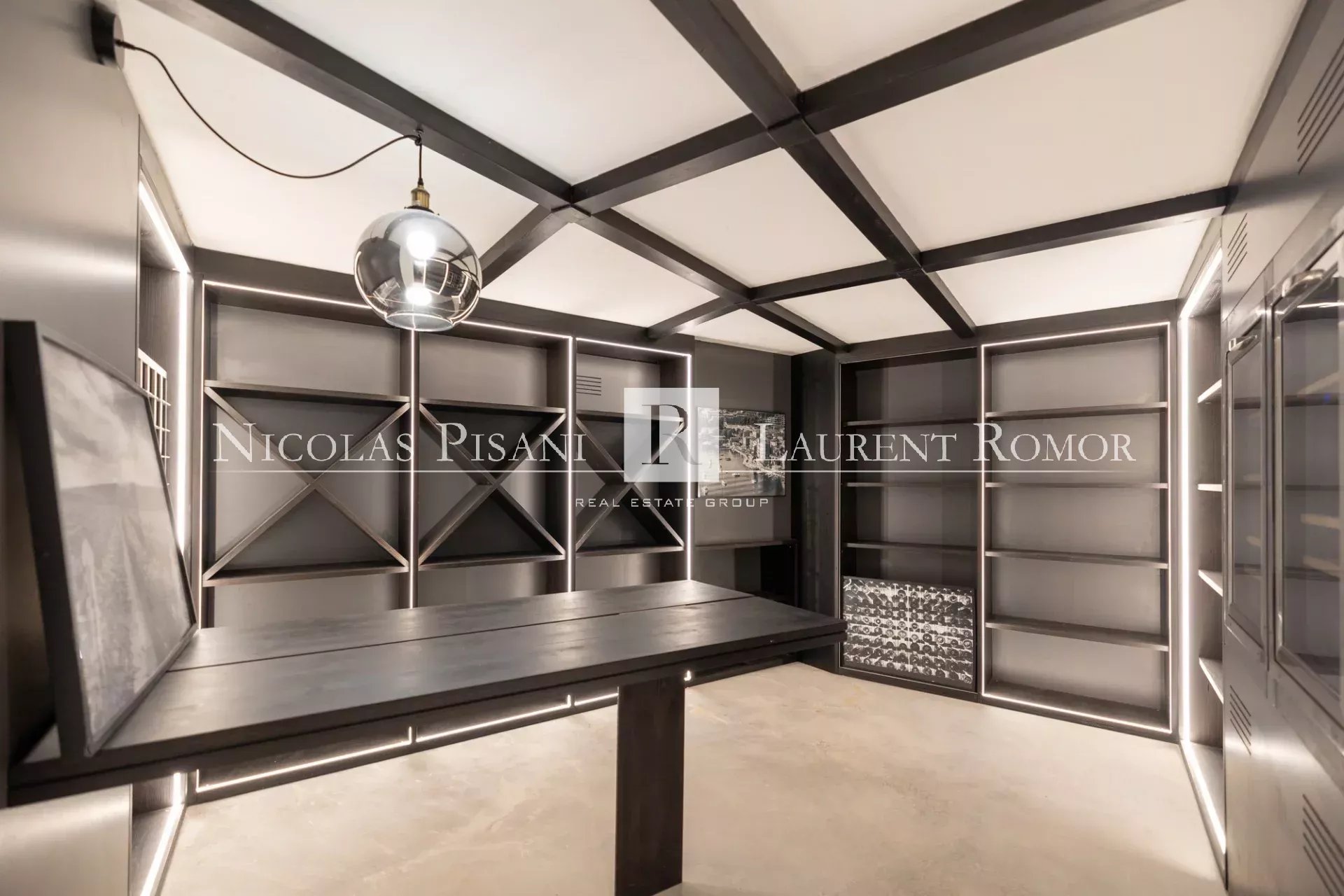 Villa d'exception édifiée sur un terrain arboré de 1200m², au calme absolu. Idéalement située, entre la basse et la moyenne corniche, la propriété, d'une superficie totale de 351m² et de 294m² habitables, a été rénovée en 2021 avec des prestations haut de gamme et raffinées. La villa comprend, un hall d'entrée, un vaste séjour - salle à manger, une cuisine ouverte entièrement équipée et aménagée. Le tout formant une pièce de vie de 96m² ouvrant sur une belle terrasse qui surplombe la rade de Villefranche et le Cap Ferrat et offre une vue panoramique époustouflante. A l'étage inférieur, vous trouverez une chambre de maître avec salle de bain, wc et dressing, 3 autres chambres en suite avec salles d'eau et wc privatifs. Enfin, en rez-de-jardin, une salle de sport ouvrant sur la terrasse et la piscine chauffée et pouvant être aménagée en appartement indépendant. Cette villa bénéficie de prestations luxueuses telles qu'une magnifique cave à vin, un bel espace piscine avec sa cuisine d'été, des dressings, un ascenseur desservant tous les étages, un vaste garage de 33m² avec accès direct à la villa et plusieurs places de parkings extérieurs. Honoraires à la charge du vendeur