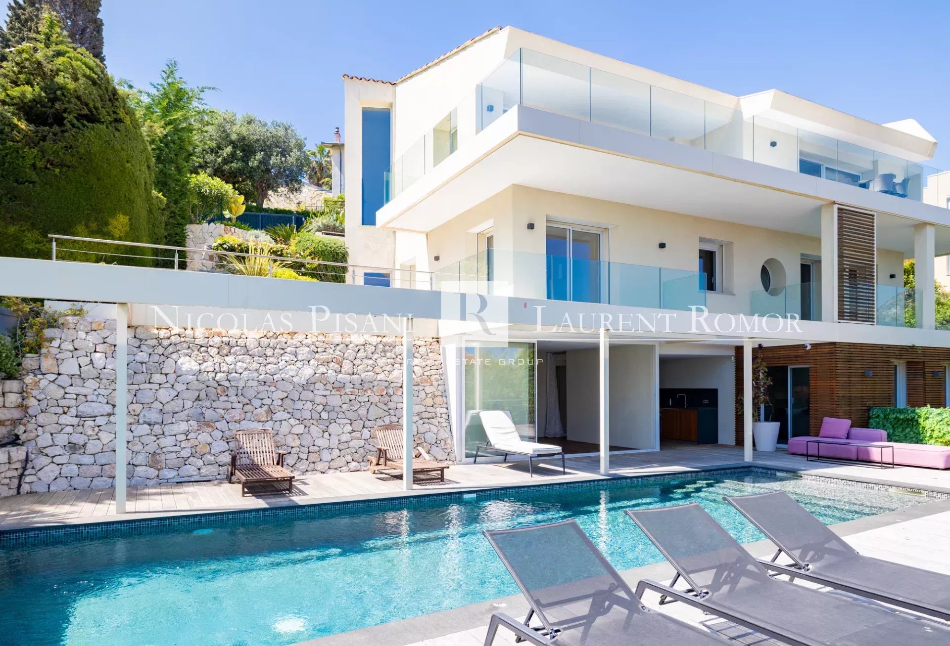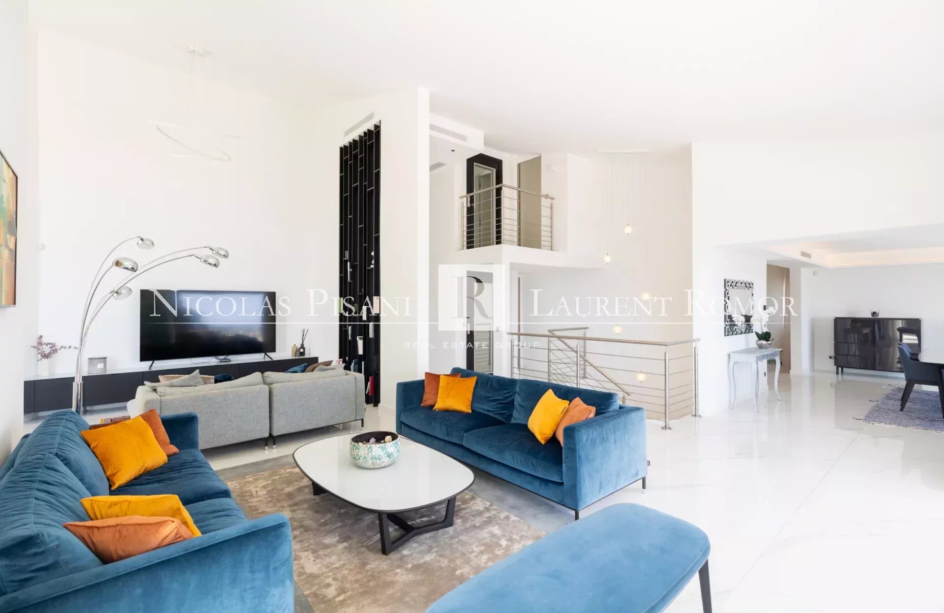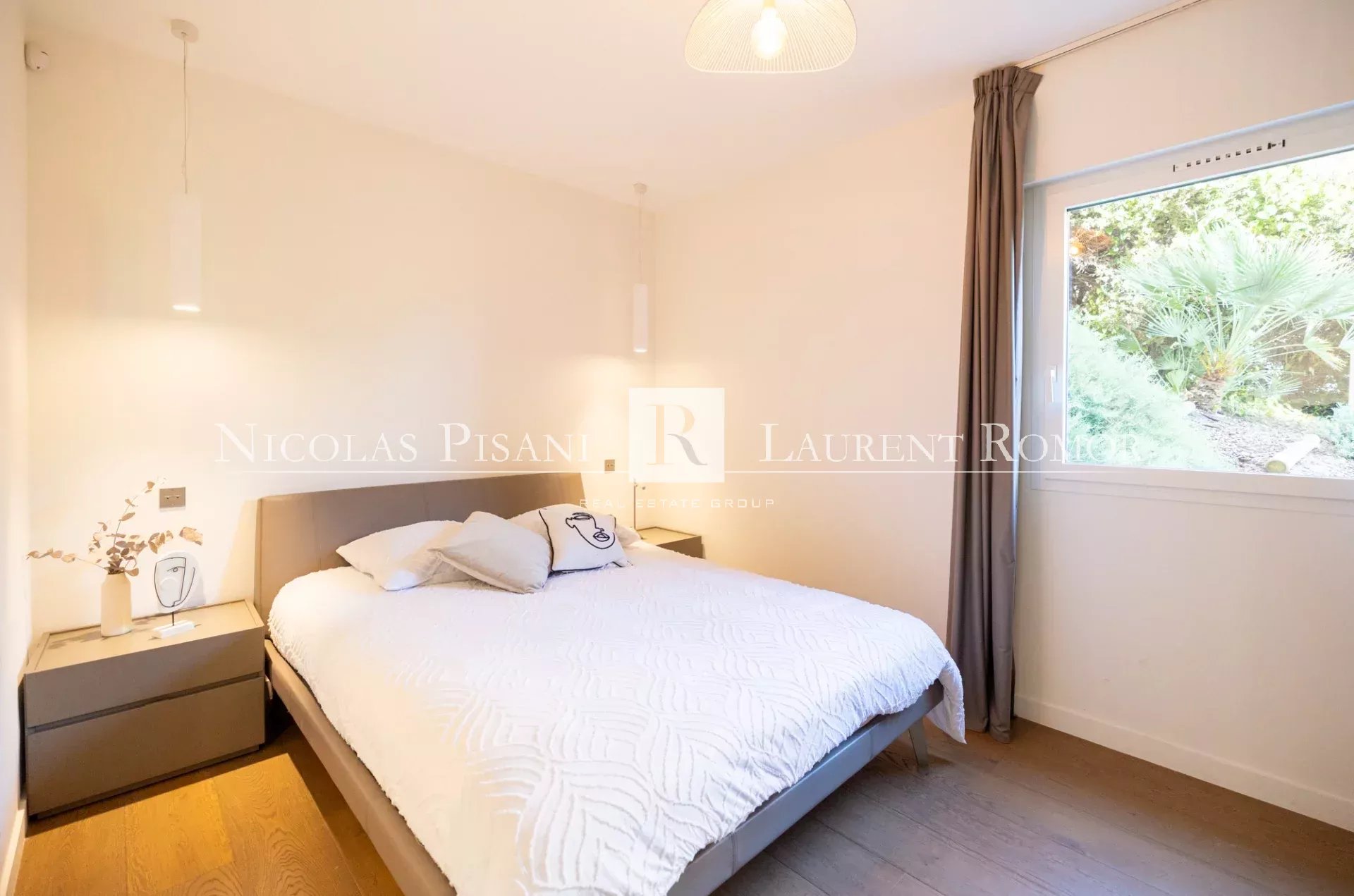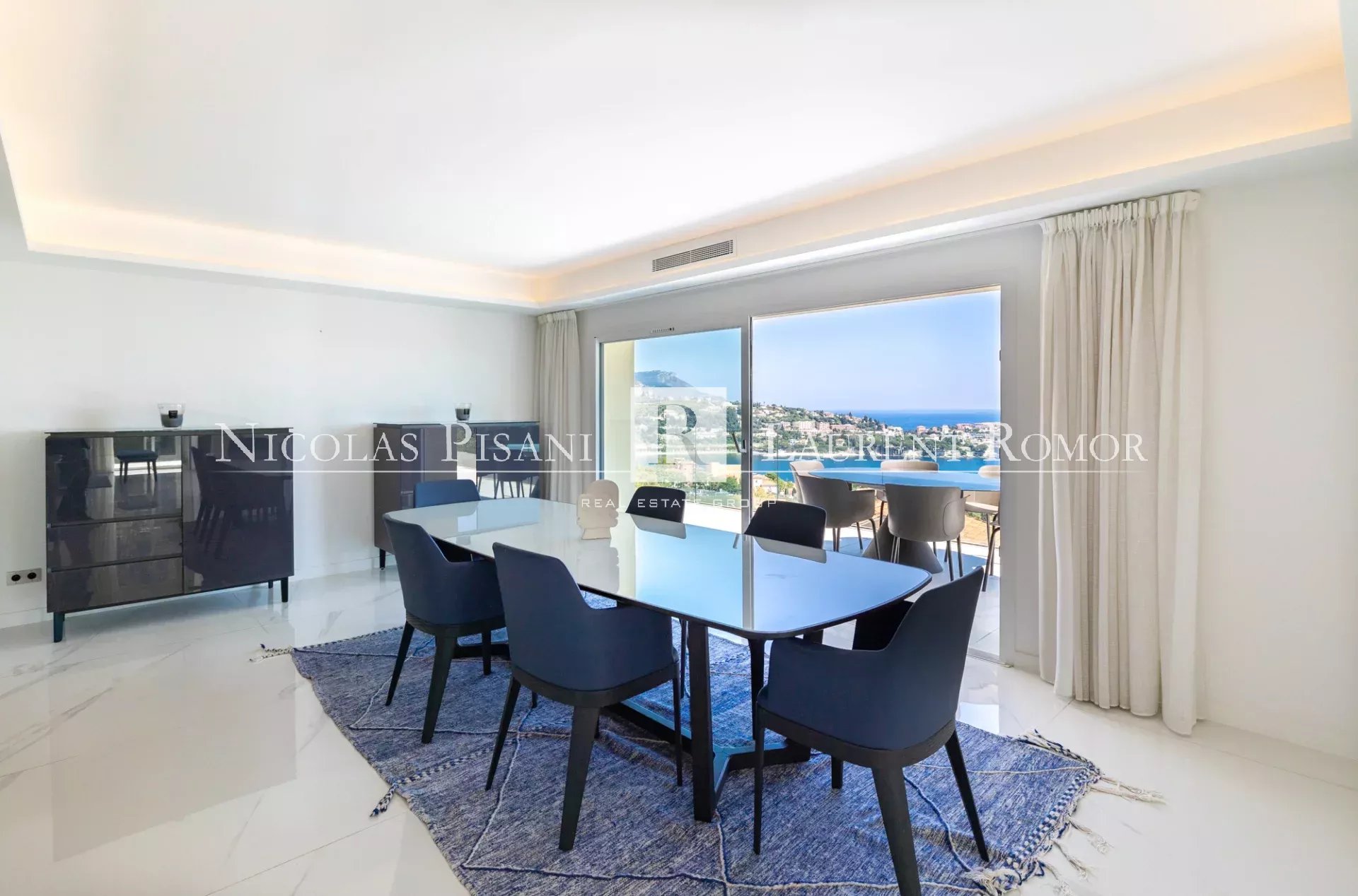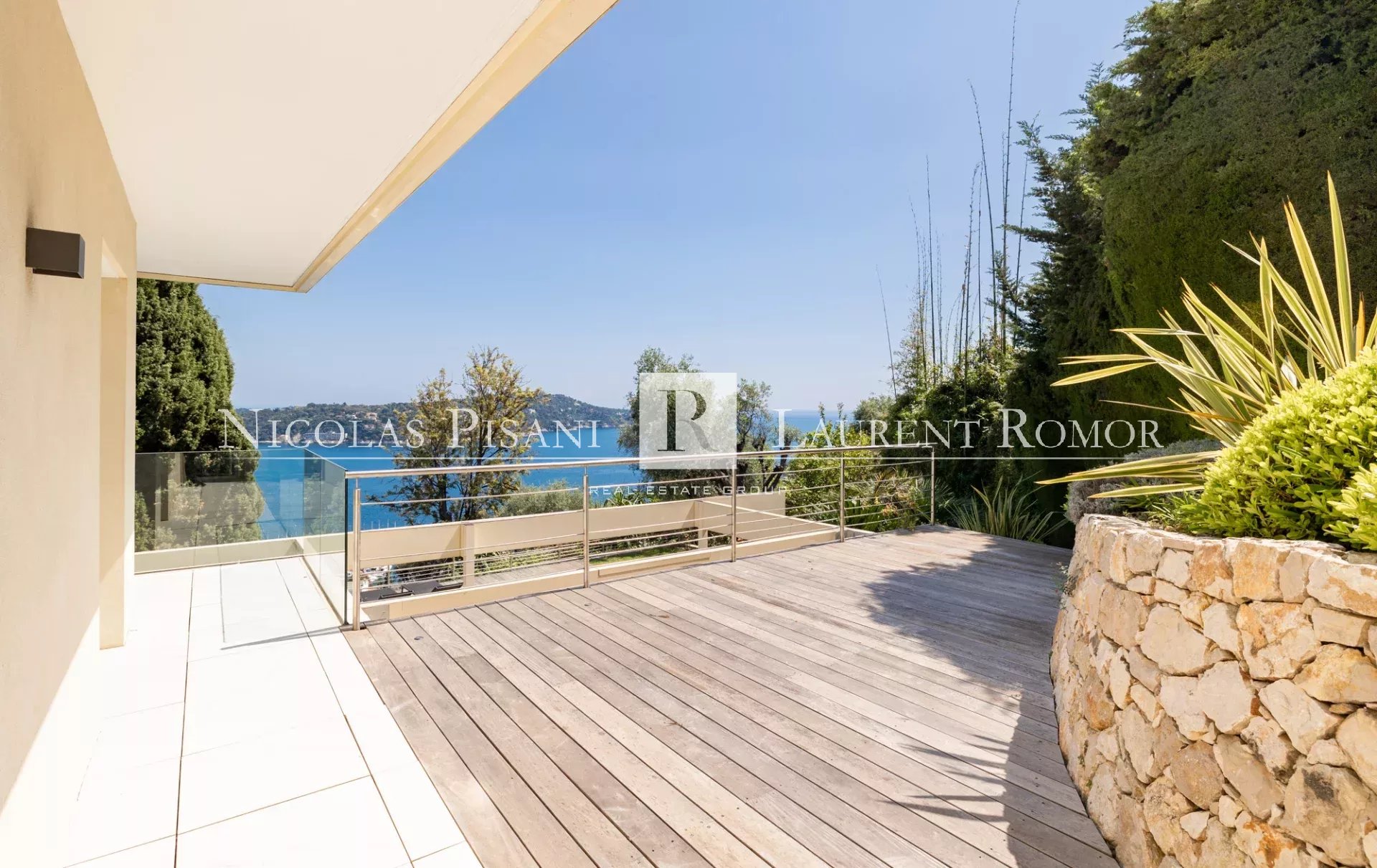 Villa d'exception édifiée sur un terrain arboré de 1200m², au calme absolu. Idéalement située, entre la basse et la moyenne corniche, la propriété, d'une superficie totale de 351m² et de 294m² habitables, a été rénovée en 2021 avec des prestations haut de gamme et raffinées. La villa comprend, un hall d'entrée, un vaste séjour - salle à manger, une cuisine ouverte entièrement équipée et aménagée. Le tout formant une pièce de vie de 96m² ouvrant sur une belle terrasse qui surplombe la rade de Villefranche et le Cap Ferrat et offre une vue panoramique époustouflante. A l'étage inférieur, vous trouverez une chambre de maître avec salle de bain, wc et dressing, 3 autres chambres en suite avec salles d'eau et wc privatifs. Enfin, en rez-de-jardin, une salle de sport ouvrant sur la terrasse et la piscine chauffée et pouvant être aménagée en appartement indépendant. Cette villa bénéficie de prestations luxueuses telles qu'une magnifique cave à vin, un bel espace piscine avec sa cuisine d'été, des dressings, un ascenseur desservant tous les étages, un vaste garage de 33m² avec accès direct à la villa et plusieurs places de parkings extérieurs. Honoraires à la charge du vendeur