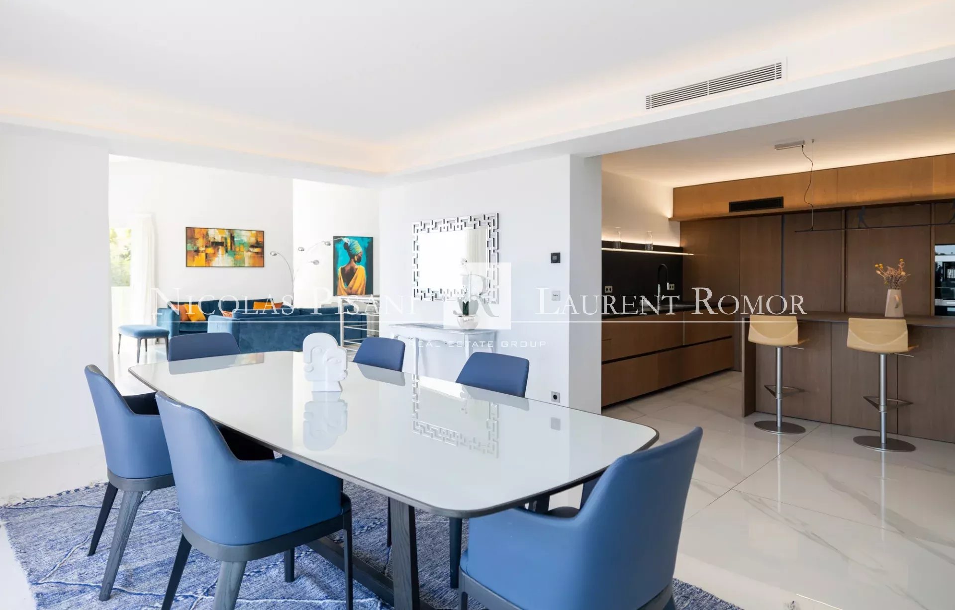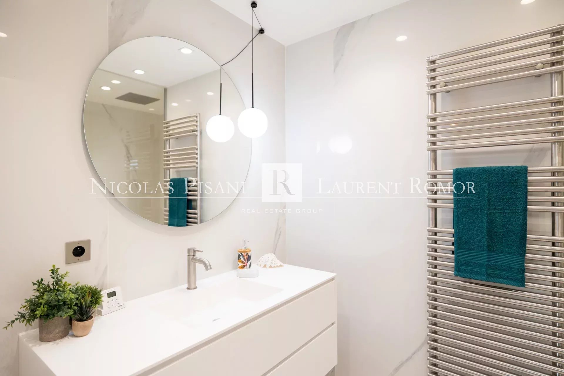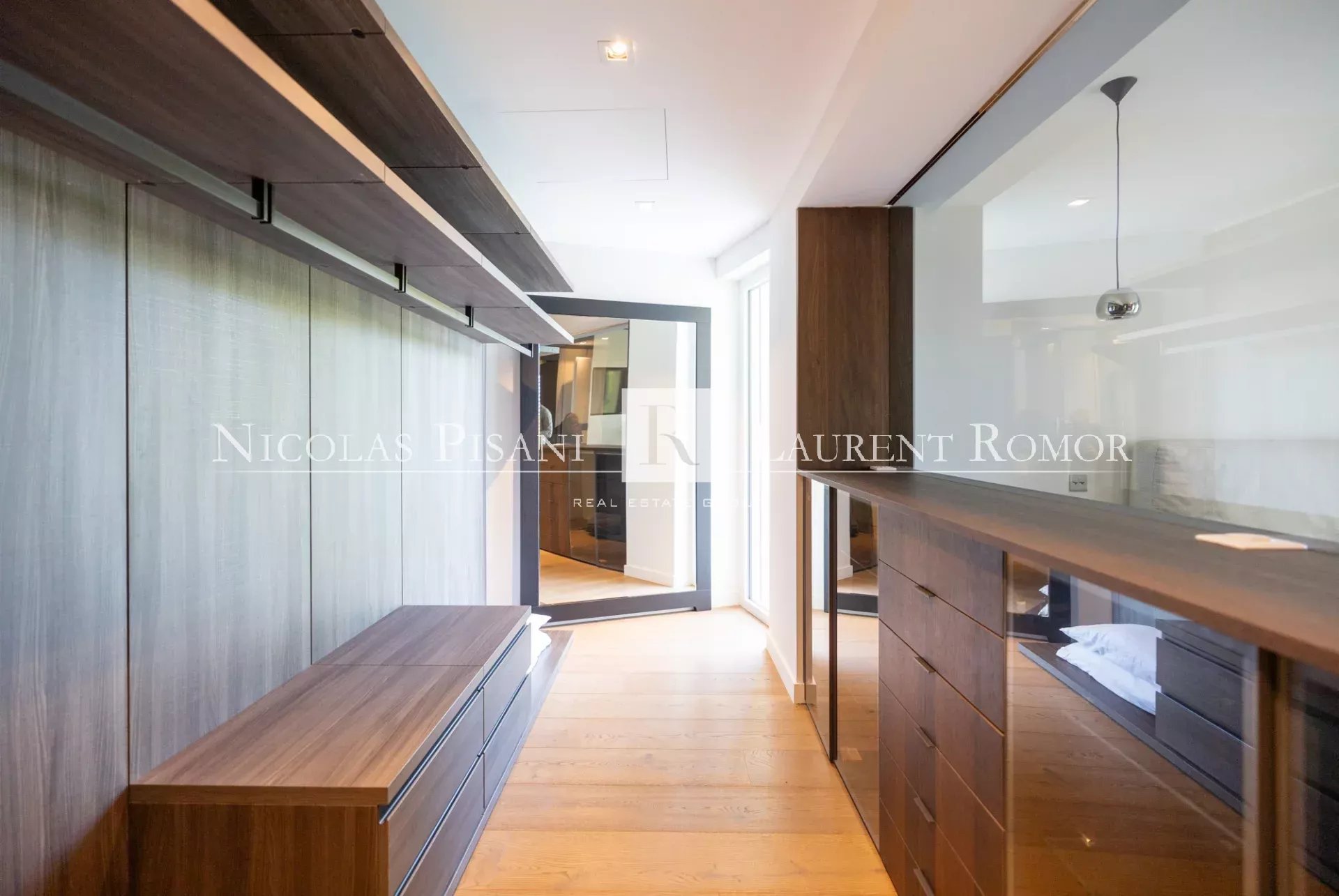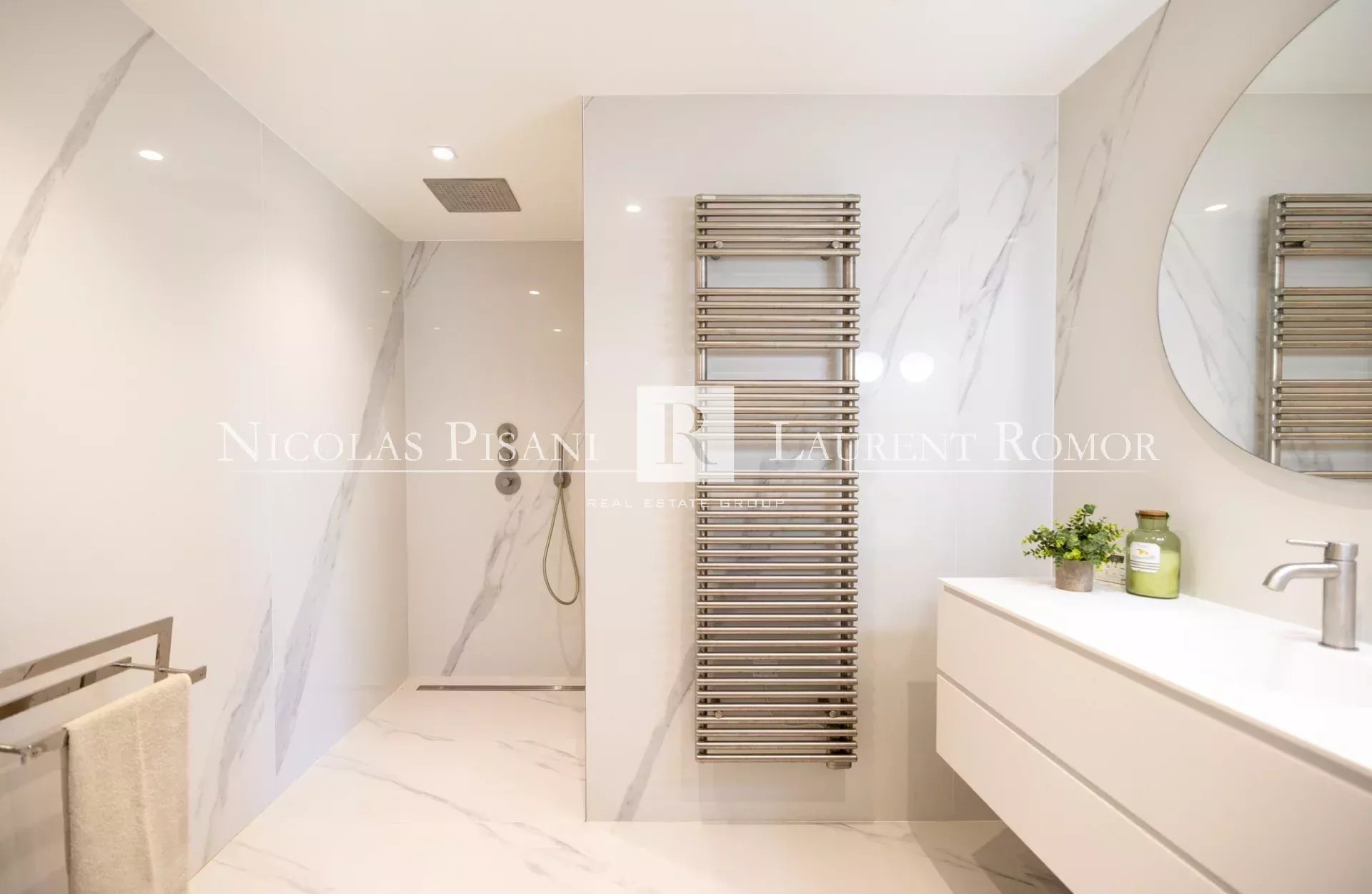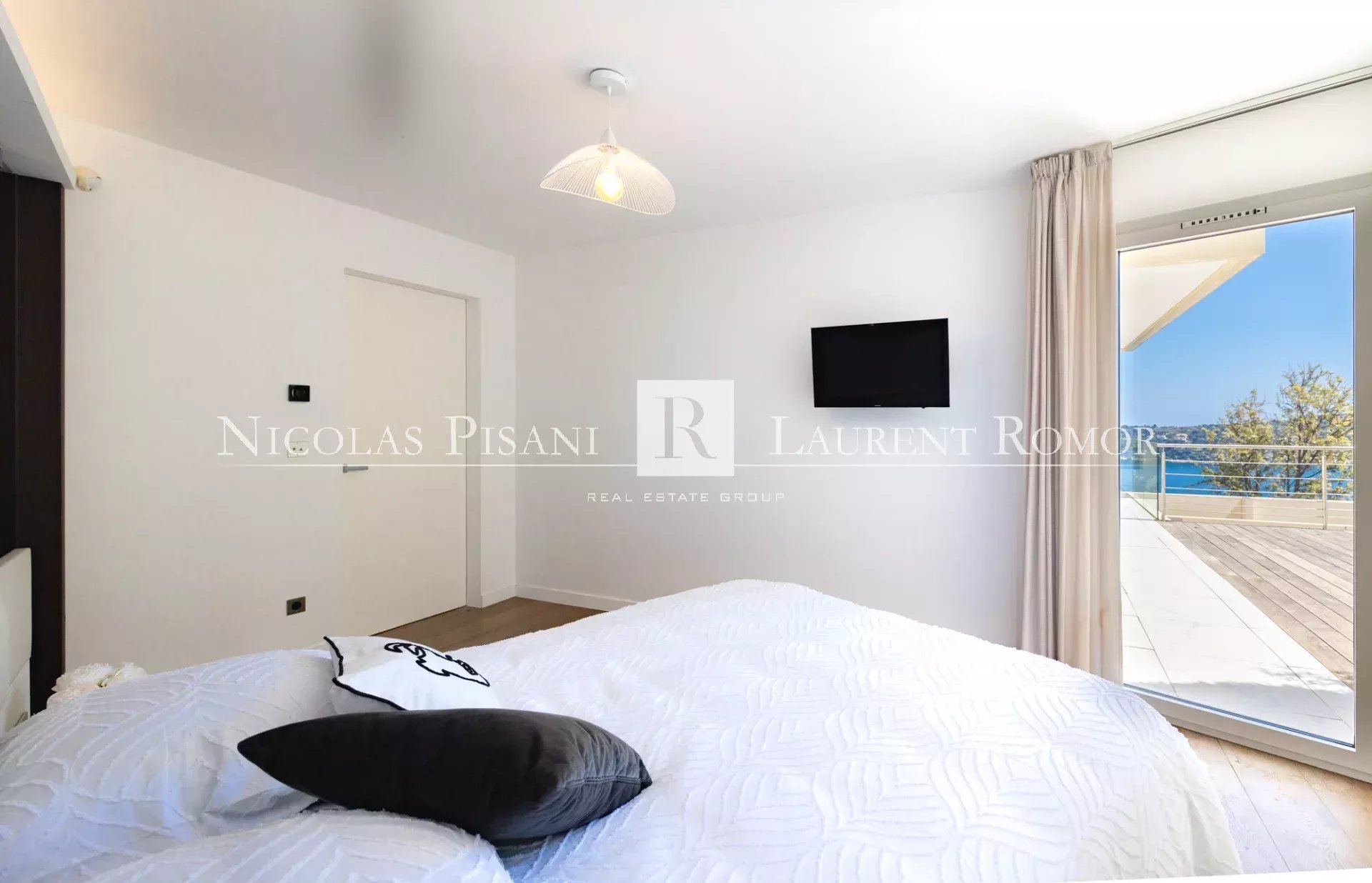 Villa d'exception édifiée sur un terrain arboré de 1200m², au calme absolu. Idéalement située, entre la basse et la moyenne corniche, la propriété, d'une superficie totale de 351m² et de 294m² habitables, a été rénovée en 2021 avec des prestations haut de gamme et raffinées. La villa comprend, un hall d'entrée, un vaste séjour - salle à manger, une cuisine ouverte entièrement équipée et aménagée. Le tout formant une pièce de vie de 96m² ouvrant sur une belle terrasse qui surplombe la rade de Villefranche et le Cap Ferrat et offre une vue panoramique époustouflante. A l'étage inférieur, vous trouverez une chambre de maître avec salle de bain, wc et dressing, 3 autres chambres en suite avec salles d'eau et wc privatifs. Enfin, en rez-de-jardin, une salle de sport ouvrant sur la terrasse et la piscine chauffée et pouvant être aménagée en appartement indépendant. Cette villa bénéficie de prestations luxueuses telles qu'une magnifique cave à vin, un bel espace piscine avec sa cuisine d'été, des dressings, un ascenseur desservant tous les étages, un vaste garage de 33m² avec accès direct à la villa et plusieurs places de parkings extérieurs. Honoraires à la charge du vendeur