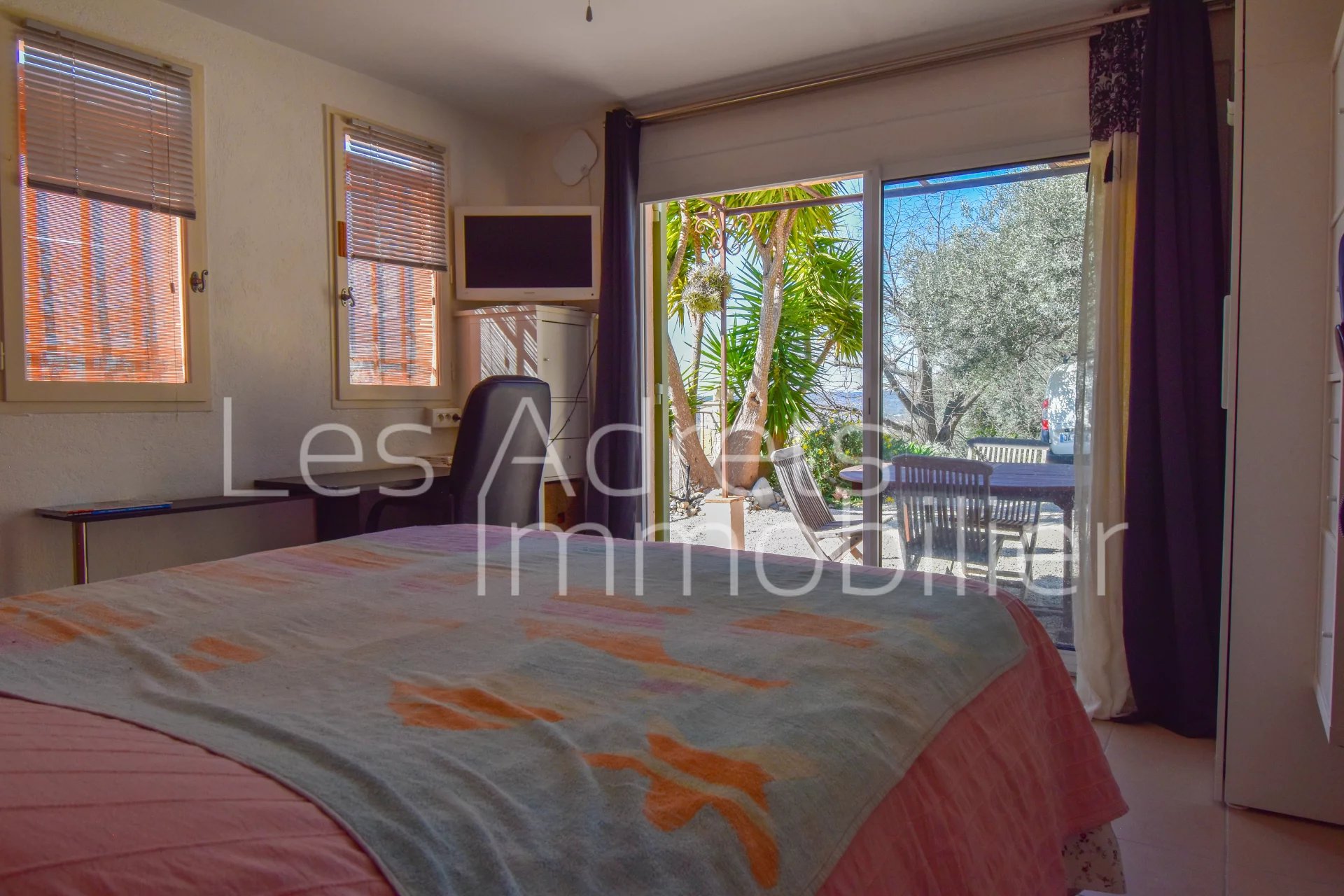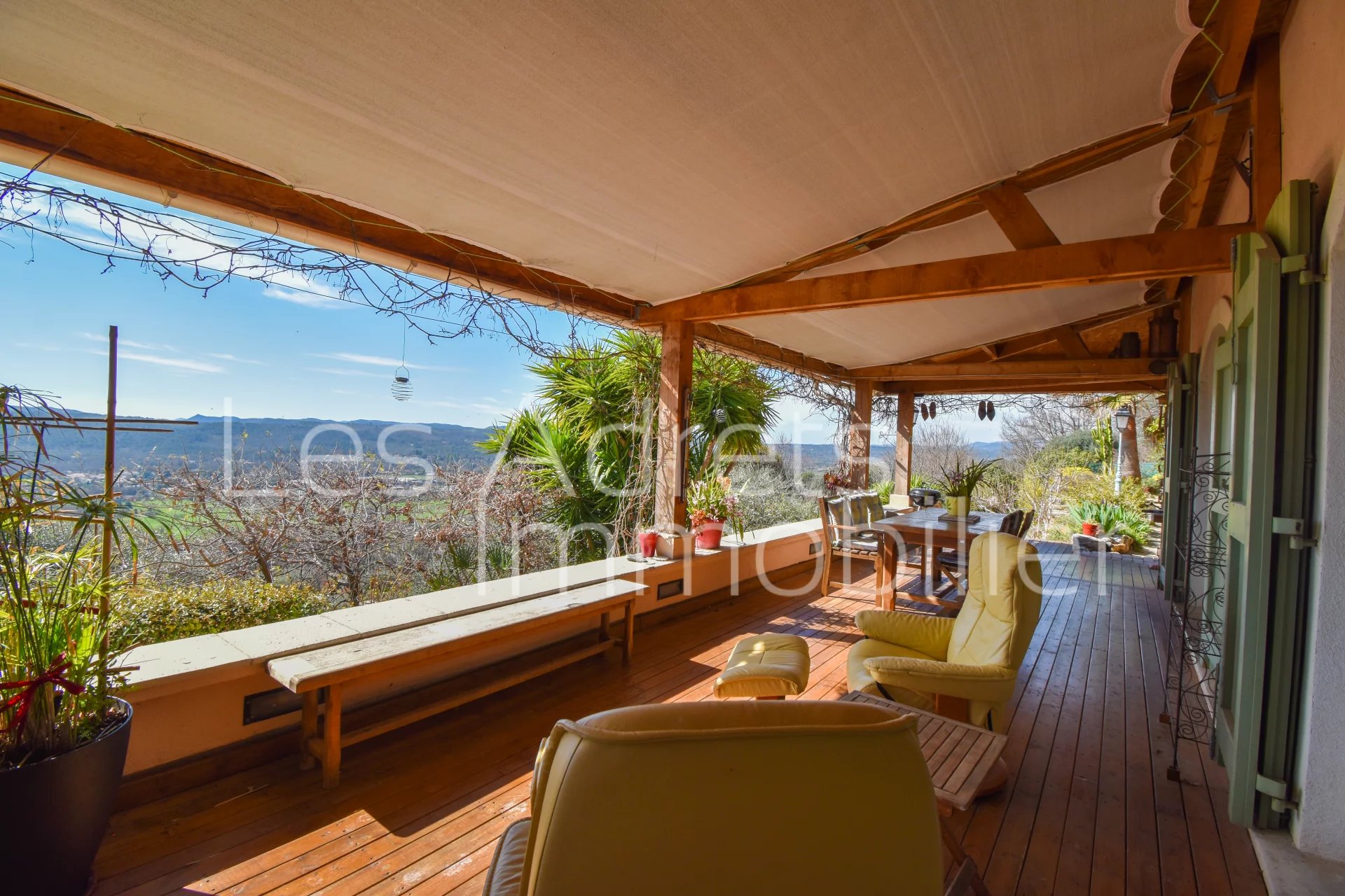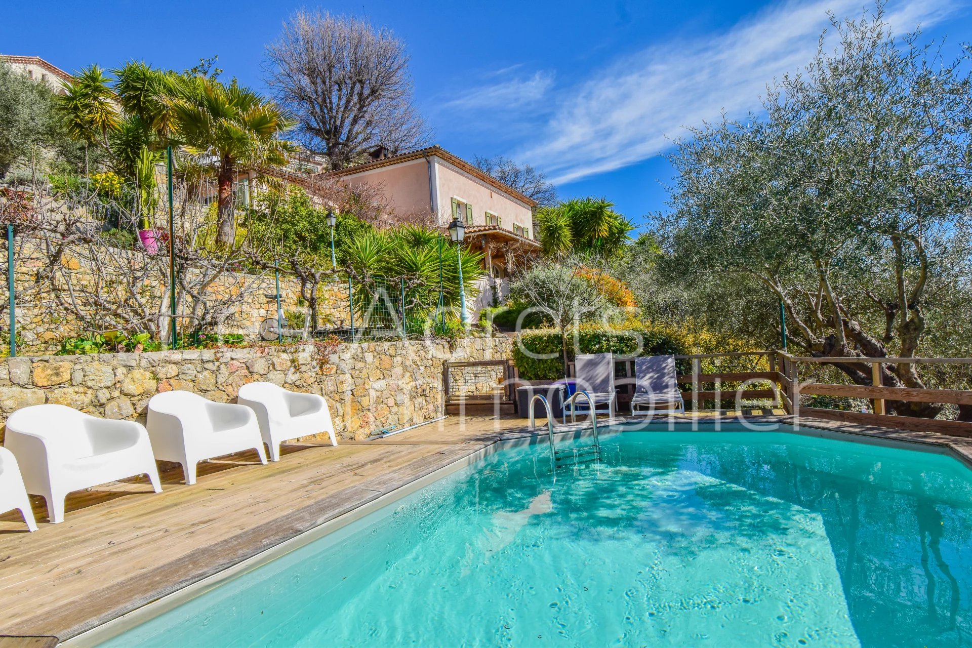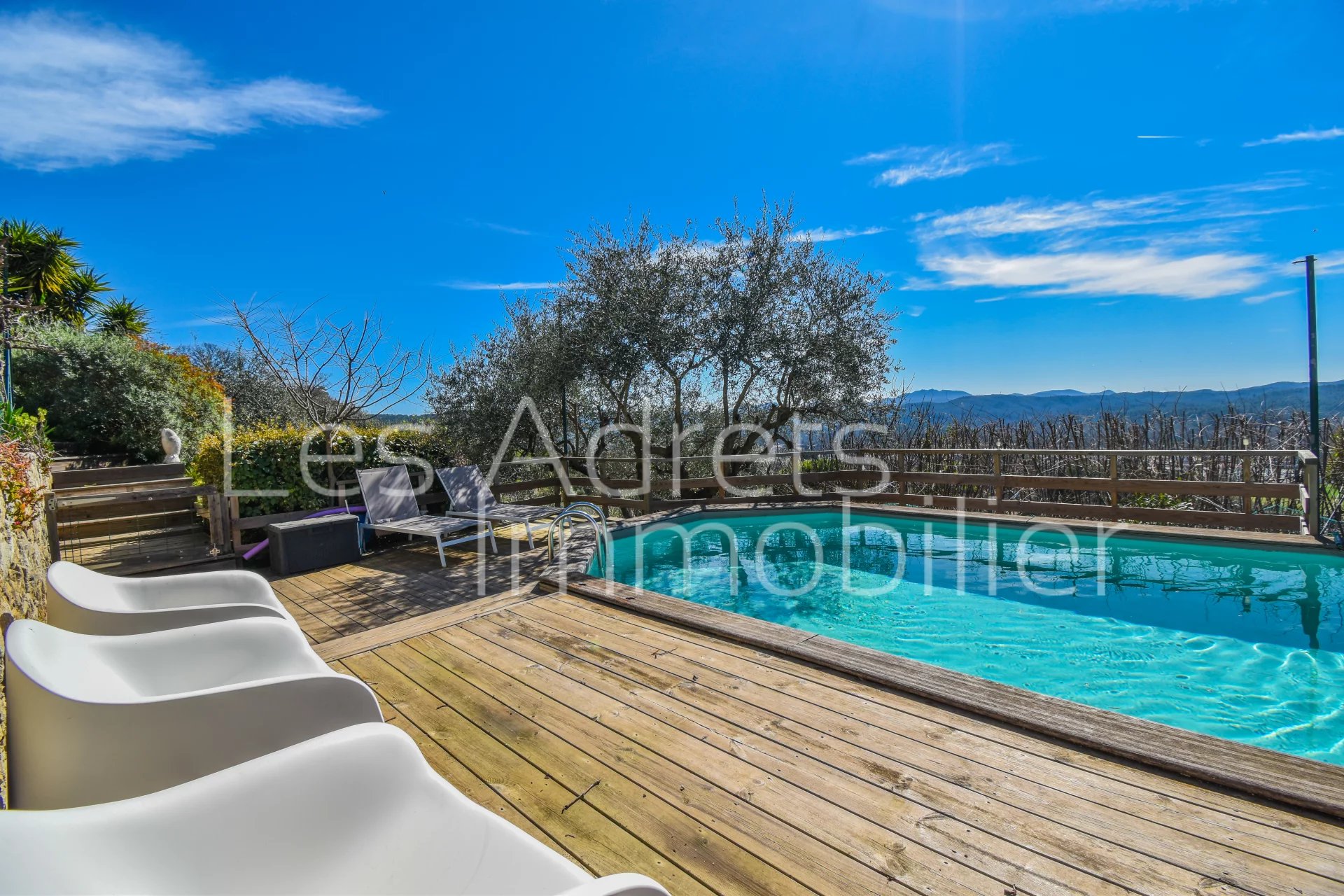 À l’extérieur, le terrain en restanques propose plusieurs espaces de vie avec terrasses, coin détente et piscine hors-sol, dans un cadre agréable et verdoyant.