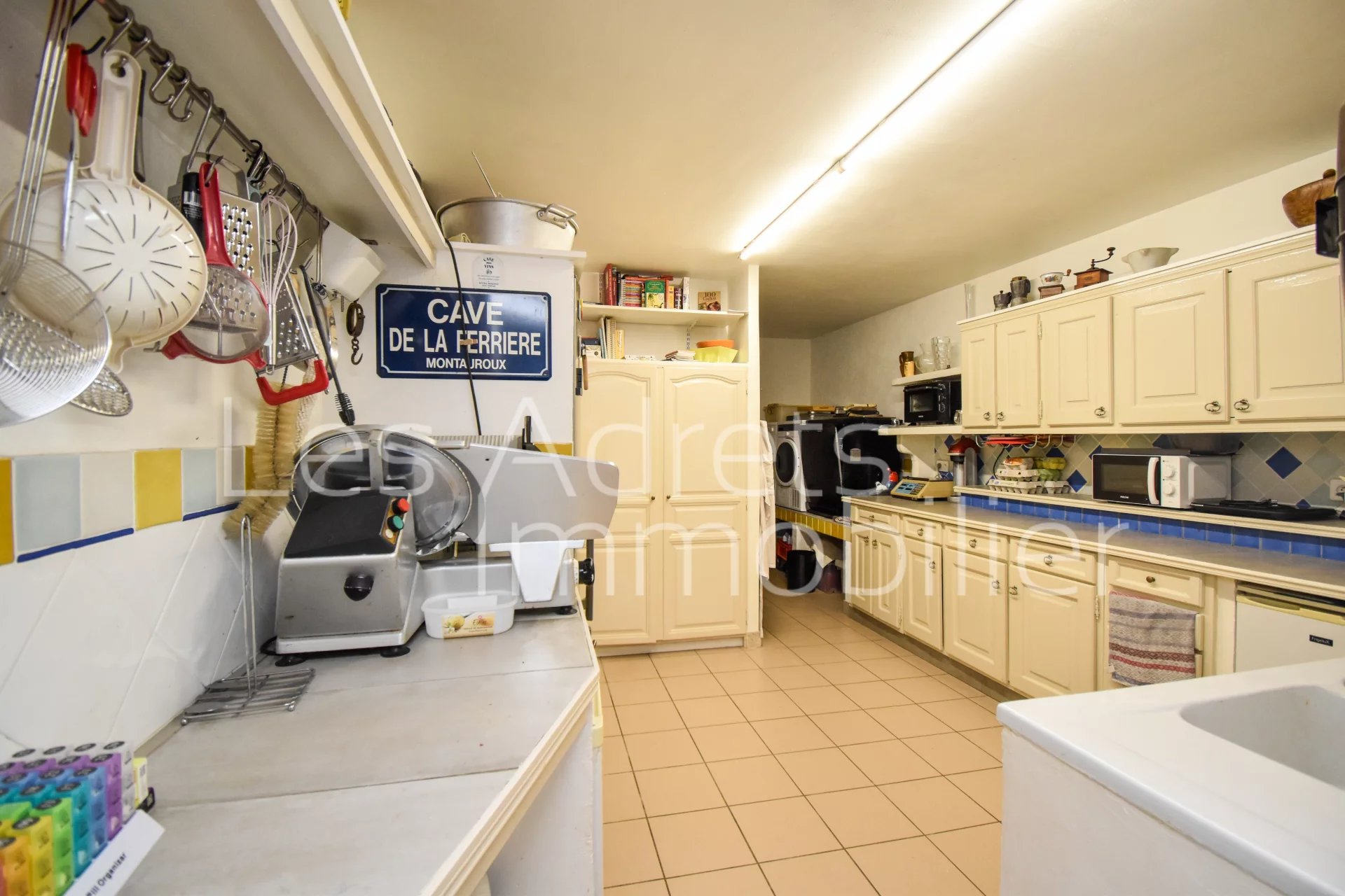 La maison principale offre un agréable séjour lumineux avec une cheminée Godin, ouvert sur une terrasse couverte en bois, idéale pour profiter de l’extérieur. La cuisine équipée dispose d’un piano de cuisson et d’un poêle Godin, et se prolonge par une grande buanderie.