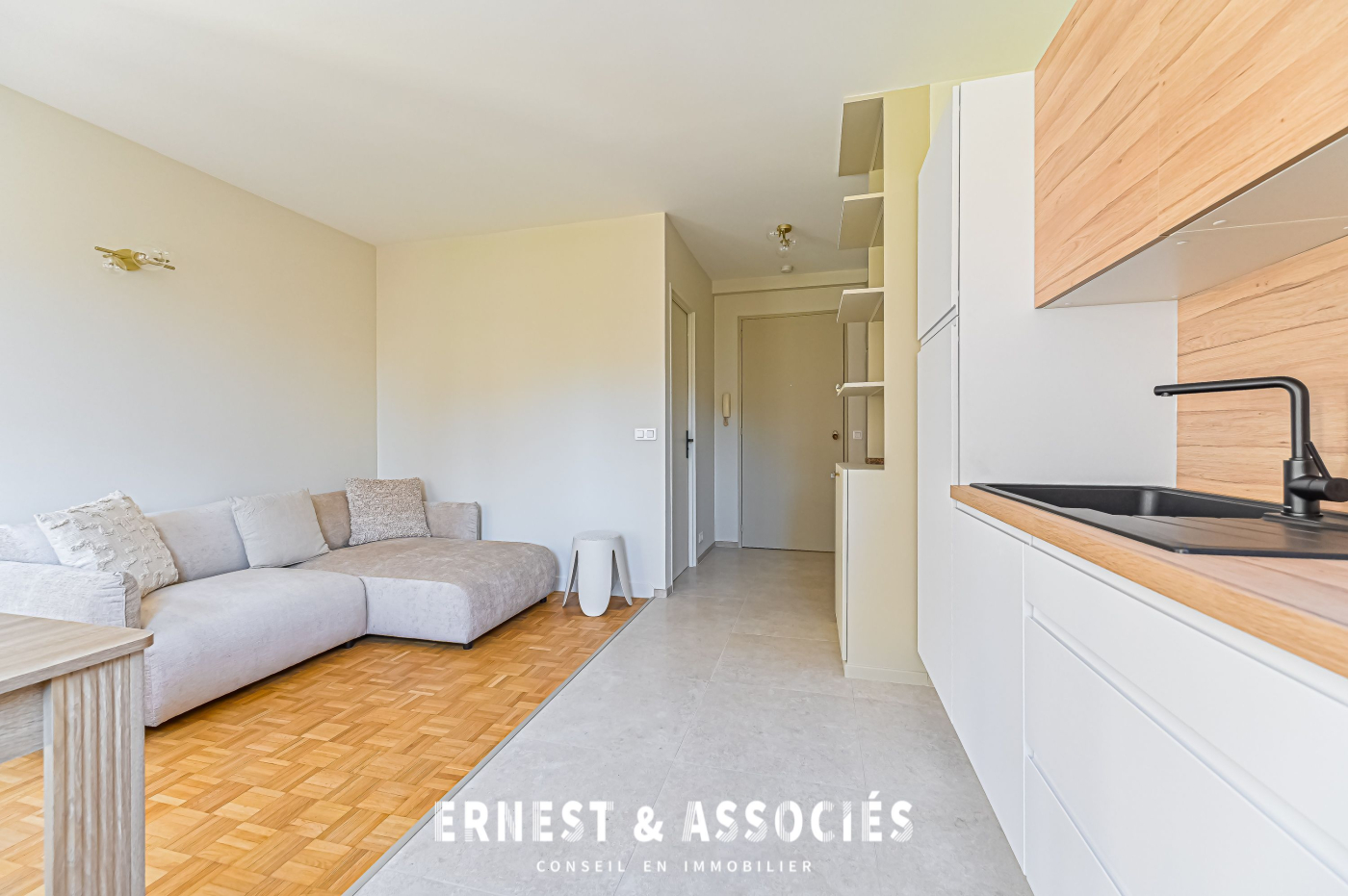 - Métro Boulogne Jean Jaurès - Au 1er étage d'une résidence semi-récente très bien entretenue avec gardien donnant sur cour et jardin, ERNEST & ASSOCIÉS vous propose un studio meublé avec coin chambre de 32,31 m² loi Boutin entièrement refait à neuf par architecte offrant de très belles prestations de standing sans aucune perte de place. Ce bien est composé d'une entrée avec penderie et placards, un séjour avec une cuisine ouverte équipée (éléments haut et bas, plaques de cuisson à induction, hotte, four, réfrigérateur, four micro-ondes), un coin chambre semi-ouvert avec une grande armoire intégrée et une salle d'eau avec douche à l'italienne, un WC et un lave-linge séchant. Vous serez séduit par sa vue dégagée, son ensoleillement et son calme. Les fenêtres double vitrage sont neuves et bénéficient de volets roulants électriques neufs. Le chauffage collectif, l'eau chaude et froide sont inclus dans les charges. Une cave et un emplacement de parking couvert complètent cet ensemble.