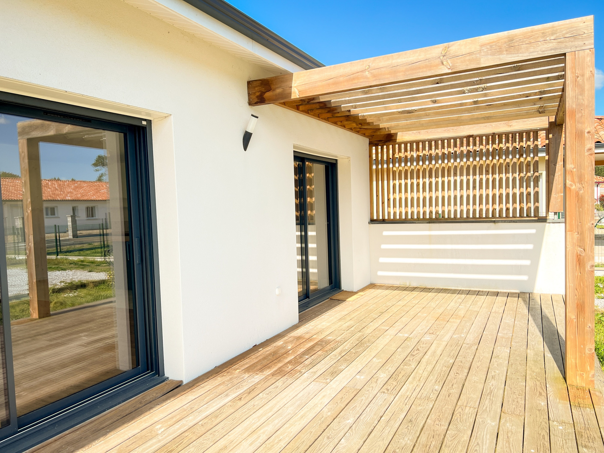 À l'extérieur, vous profiterez d'une terrasse en bois donnant sur un terrain clos avec portail, idéal pour la tranquillité et la sécurité.