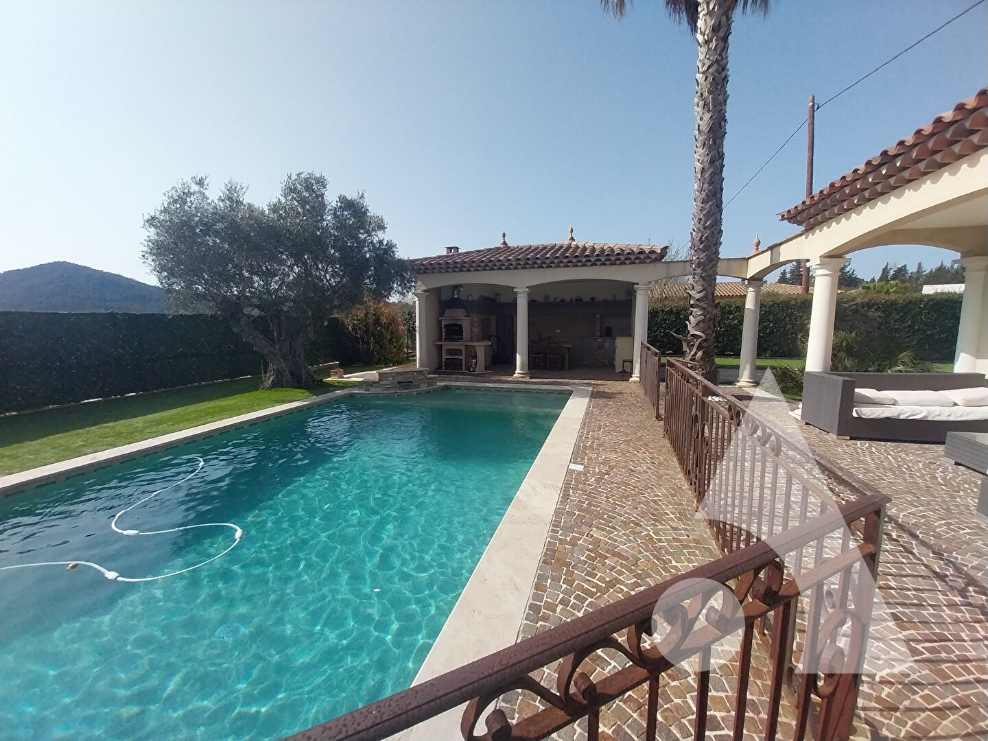 Dans un quartier résidentiel du Muy, à 10 minutes de la gare des Arcs, cette superbe maison exposée plein sud baigne dans la lumière toute la journée. Sur 2 niveaux, elle se compose au rez-de-chaussée, d'un double séjour-salon, 3 chambres dont une suite parentale, cuisine, salle de bain et douche, et à l'étage, une chambre et un bureau. Elle offre de belles prestations avec staff intérieur, chauffage au sol et climatisation. Le terrain plat de 1 200 m² est planté d'oliviers centenaires et agrémenté d'une piscine avec pool house entièrement équipé. Garage de 30 m². Terrain de boules. Portail et volets roulants électriques. Vue dégagée sur le rocher de Roquebrune. Aucun travaux à prévoir. Option foncière : possibilité d'acquérir le terrain attenant de 1 200 m². Prix de vente : 724 000 euros Bien rare ? confort, charme et accessibilité réunis. Pour toute information complémentaire ou pour une visite, merci de contacter Pierre MAS 07 85 81 93 76 pmas@sixiemeavenue.com Pierre MAS (EI) Agent Commercial - Numéro RSAC : 910 339 217 - DRAGUIGNAN.