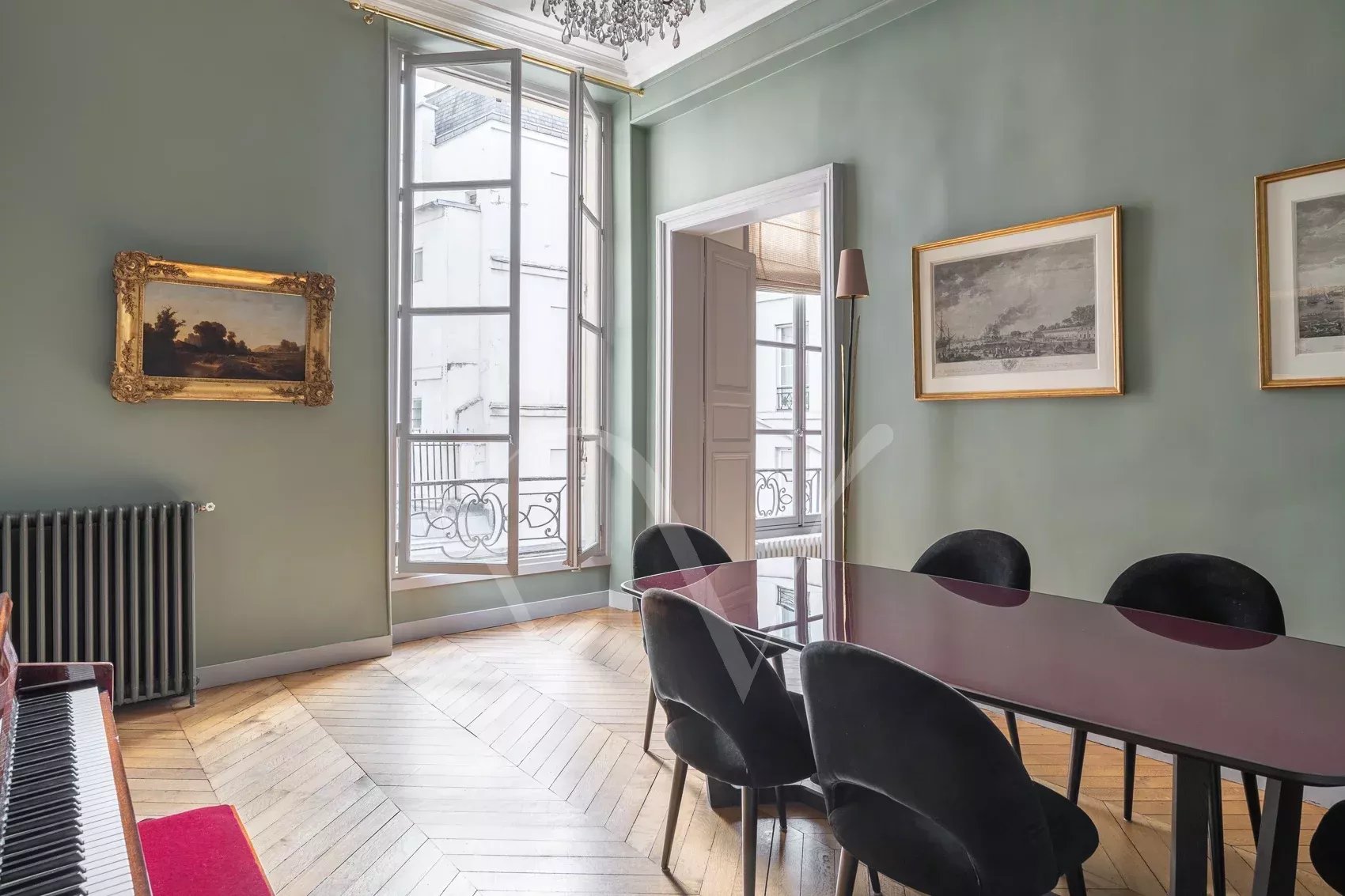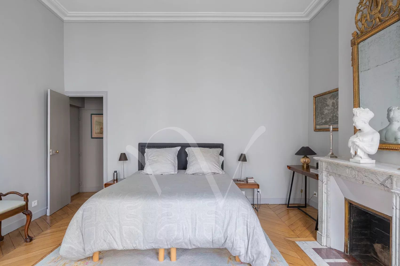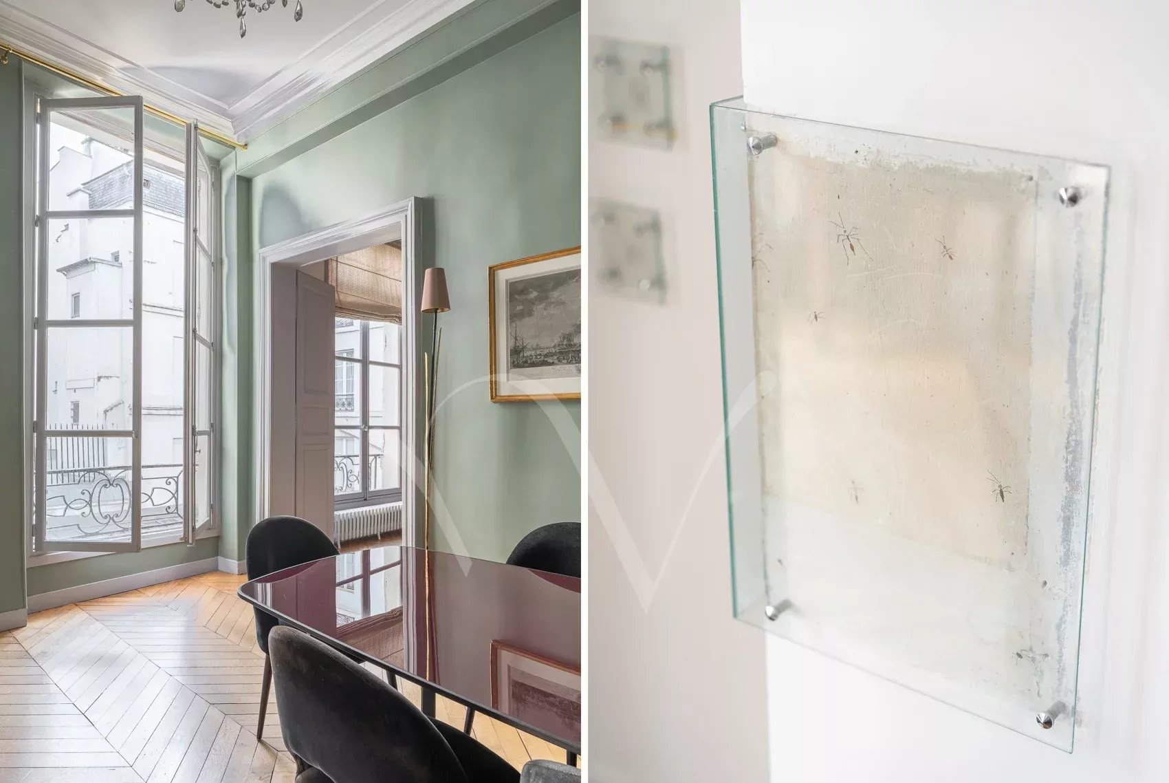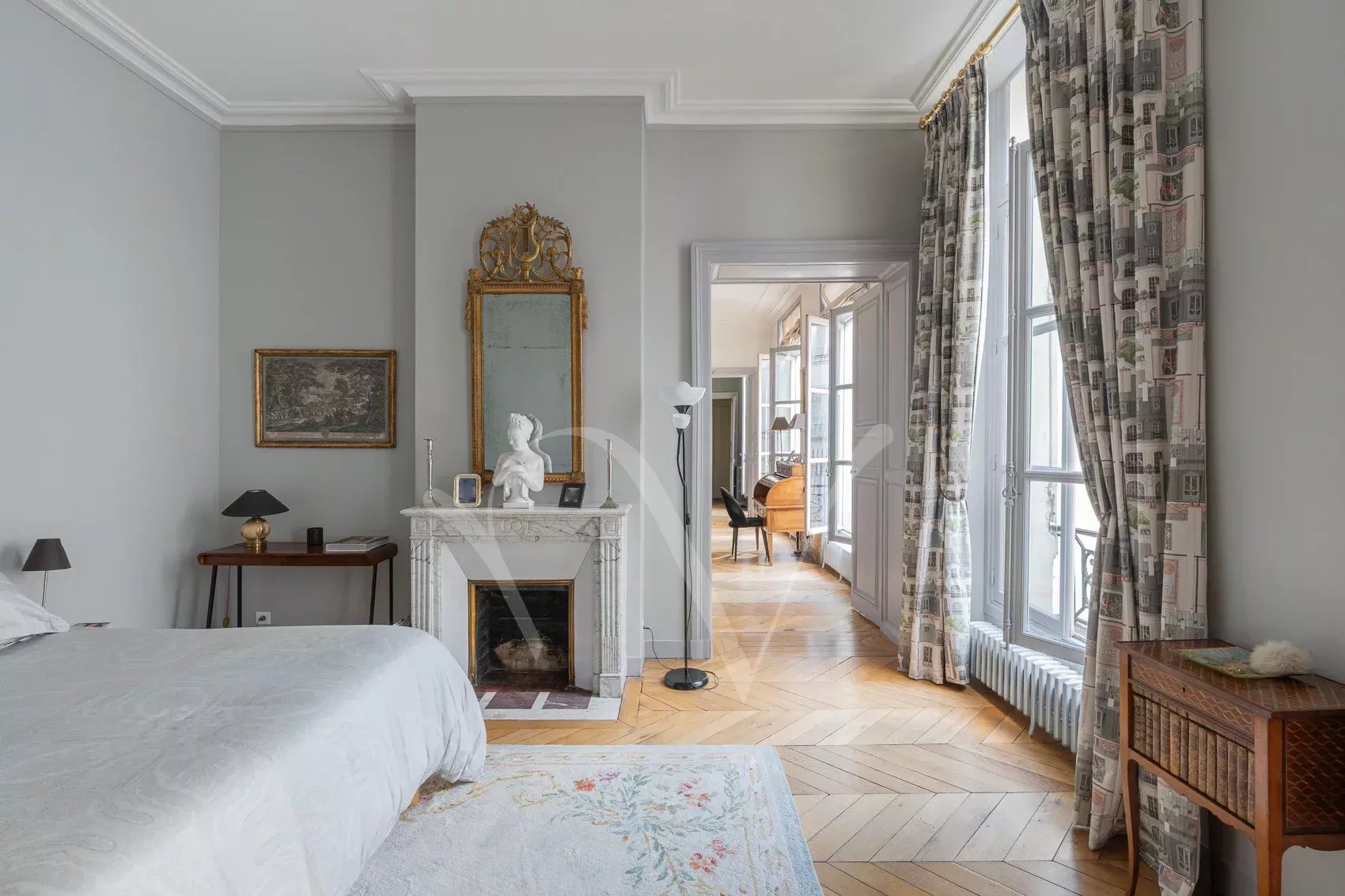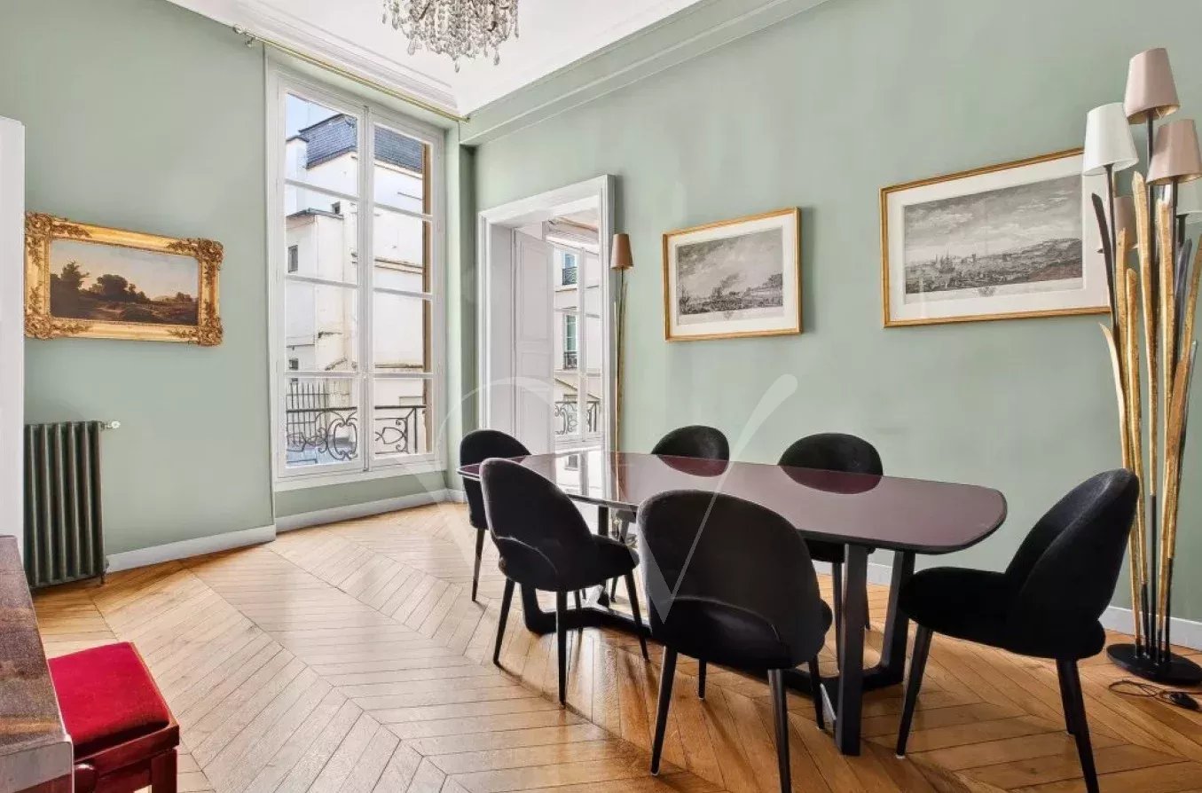 Après avoir traversé la ravissante cour pavée d’un bel immeuble du XVIIe siècle récemment ravalé, on découvre à l’étage noble accessible par escaliers un appartement de 150 m² à la hauteur sous plafond de 3,75 m. Dès l’entrée, se distingue une ambiance charmante : celle d’un appartement aux pièces en enfilade, à la fois intime et très parisien. Les volumes sont majestueux sans ostentation, la lumière douce, le calme absolu. Ancien atelier de Dora Maar, figure emblématique de la rive gauche, l’appartement conserve une aura singulière. Dans le salon, protégés avec soin, demeurent des dessins réalisés par Picasso sur les murs, traces précieuses d’un passé artistique unique, intégrées au décor avec une discrétion presque confidentielle. L’entrée ouvre vers une salle à manger attenante à la cuisine et un petit bureau, puis un salon élégant carré avec bibliothèque et cheminée. L’espace nuit comprend une grande chambre principale ainsi que deux chambres supplémentaires, accompagnées d’une salle de bains complète avec baignoire et douche, et de toilettes séparées. Un appartement rare, chargé d’histoire et de silence, dans l’un des secteurs les plus recherchés de Saint-Germain-des-Prés. On peut y découvrir de petits dessins de Picasso sur les murs du salon, protégés au cours des années.