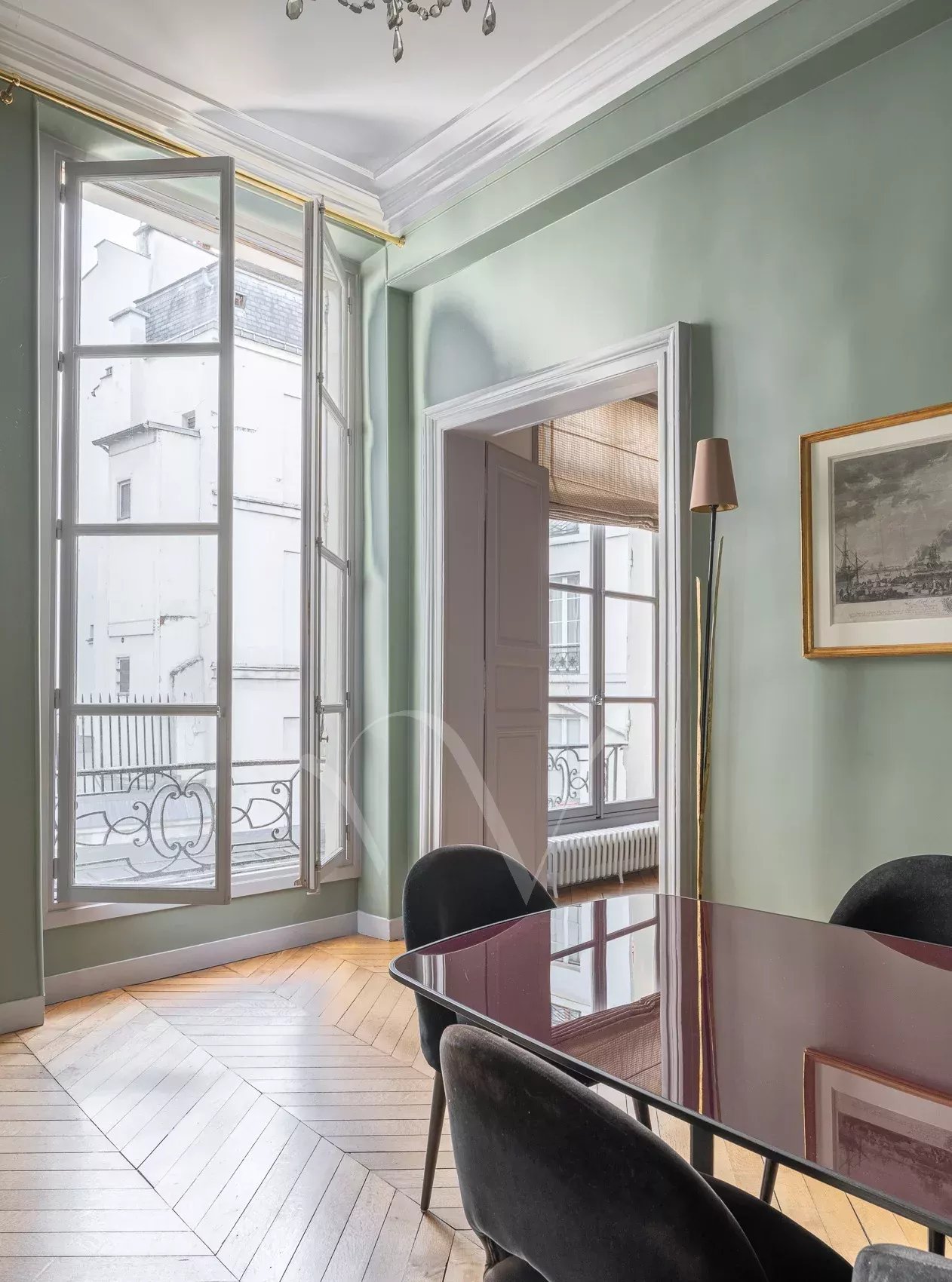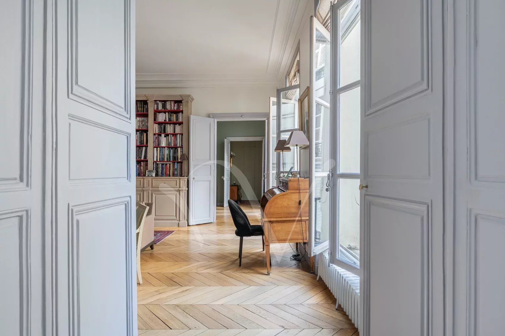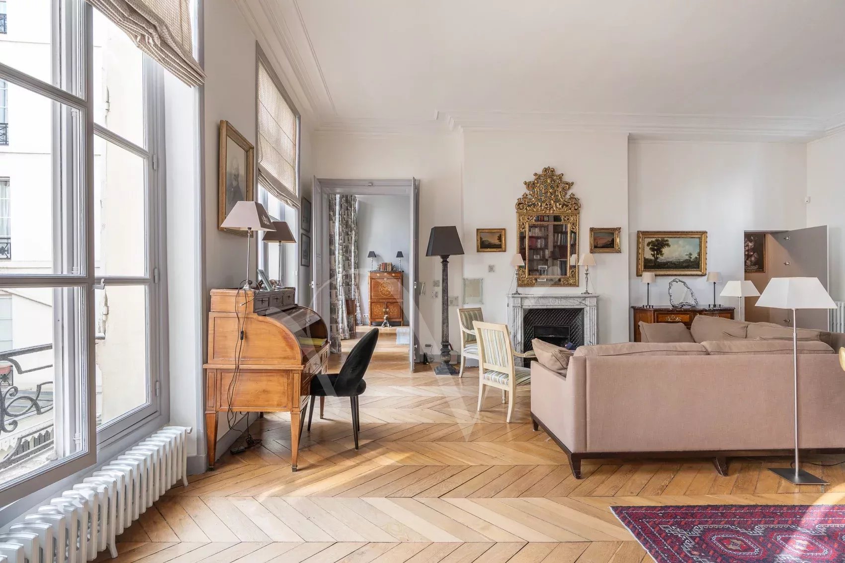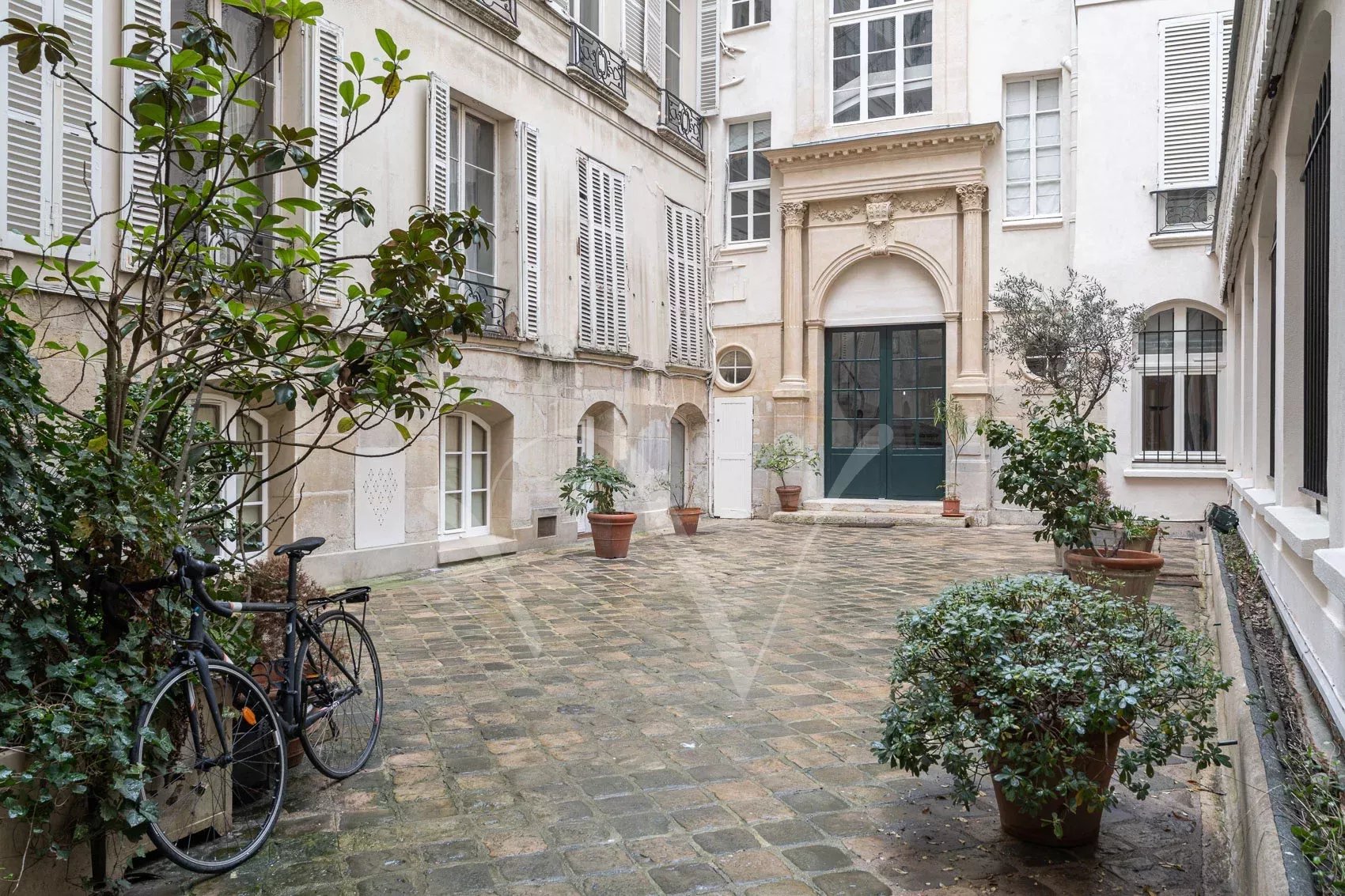 Après avoir traversé la ravissante cour pavée d’un bel immeuble du XVIIe siècle récemment ravalé, on découvre à l’étage noble accessible par escaliers un appartement de 150 m² à la hauteur sous plafond de 3,75 m. Dès l’entrée, se distingue une ambiance charmante : celle d’un appartement aux pièces en enfilade, à la fois intime et très parisien. Les volumes sont majestueux sans ostentation, la lumière douce, le calme absolu. Ancien atelier de Dora Maar, figure emblématique de la rive gauche, l’appartement conserve une aura singulière. Dans le salon, protégés avec soin, demeurent des dessins réalisés par Picasso sur les murs, traces précieuses d’un passé artistique unique, intégrées au décor avec une discrétion presque confidentielle. L’entrée ouvre vers une salle à manger attenante à la cuisine et un petit bureau, puis un salon élégant carré avec bibliothèque et cheminée. L’espace nuit comprend une grande chambre principale ainsi que deux chambres supplémentaires, accompagnées d’une salle de bains complète avec baignoire et douche, et de toilettes séparées. Un appartement rare, chargé d’histoire et de silence, dans l’un des secteurs les plus recherchés de Saint-Germain-des-Prés. On peut y découvrir de petits dessins de Picasso sur les murs du salon, protégés au cours des années.