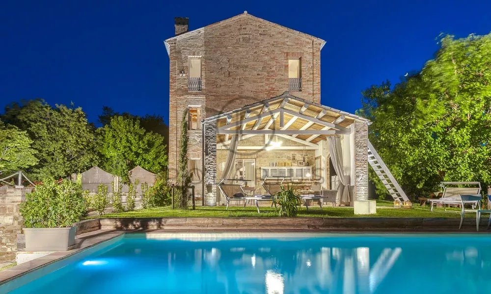 Oggetto di un attento restauro iniziato nel 2018, questo straordinario casale presenta finiture di alta qualità, in cui l’artigianato tradizionale marchigiano si fonde armoniosamente con il design contemporaneo. Il progetto è stato guidato da criteri di sostenibilità: due impianti fotovoltaici — uno sul tetto e uno su una pergola esterna adibita a parcheggio e stazione di ricarica per veicoli elettrici ed e-bike — garantiscono una potenza complessiva di 7 kW. Il riscaldamento è assicurato da una moderna pompa di calore e dal termocamino; le camere sono inoltre dotate di aria condizionata. Gli interni riflettono la passione dei proprietari per il recupero di arredi antichi, sapientemente combinati con elementi moderni.