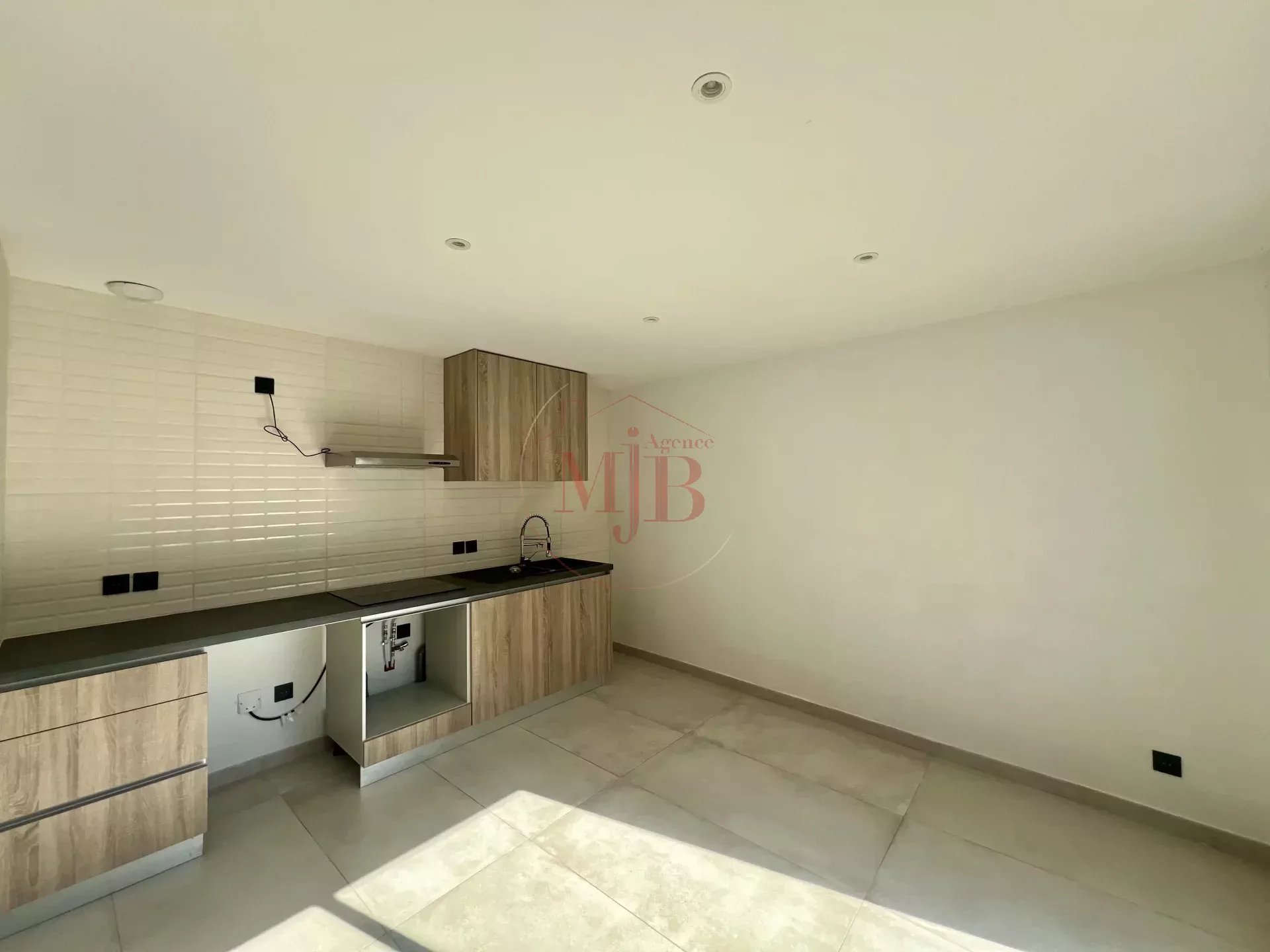Une belle pièce de vie lumineuse avec salon, séjour et cuisine ouverte, donnant sur un patio extérieur privatif, une arrière-cuisine ainsi qu’un WC indépendant.